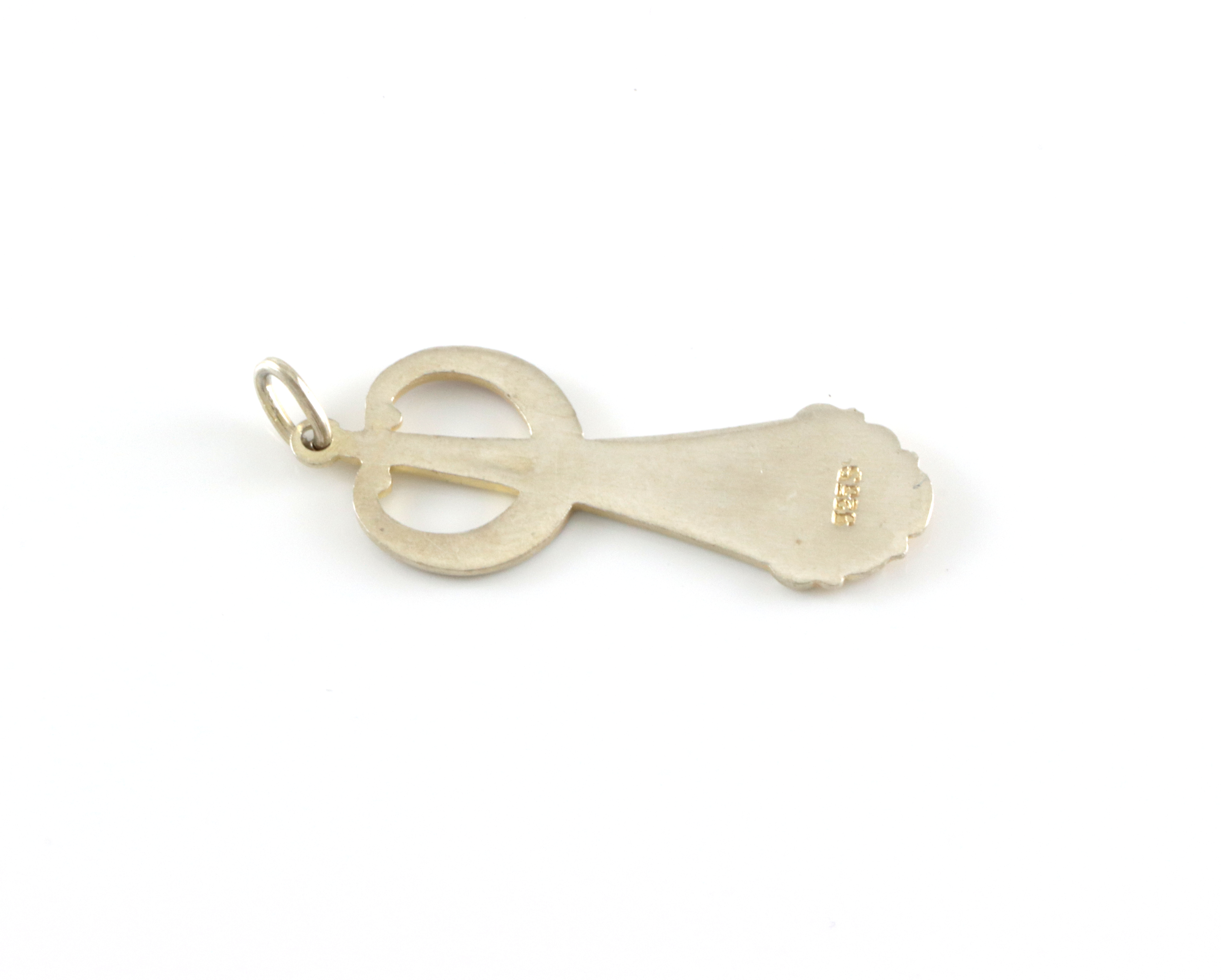 Anheng i forgylt sølv med orange mot rød emalje. Ukjent produsent 4,6 x 1,4 cm