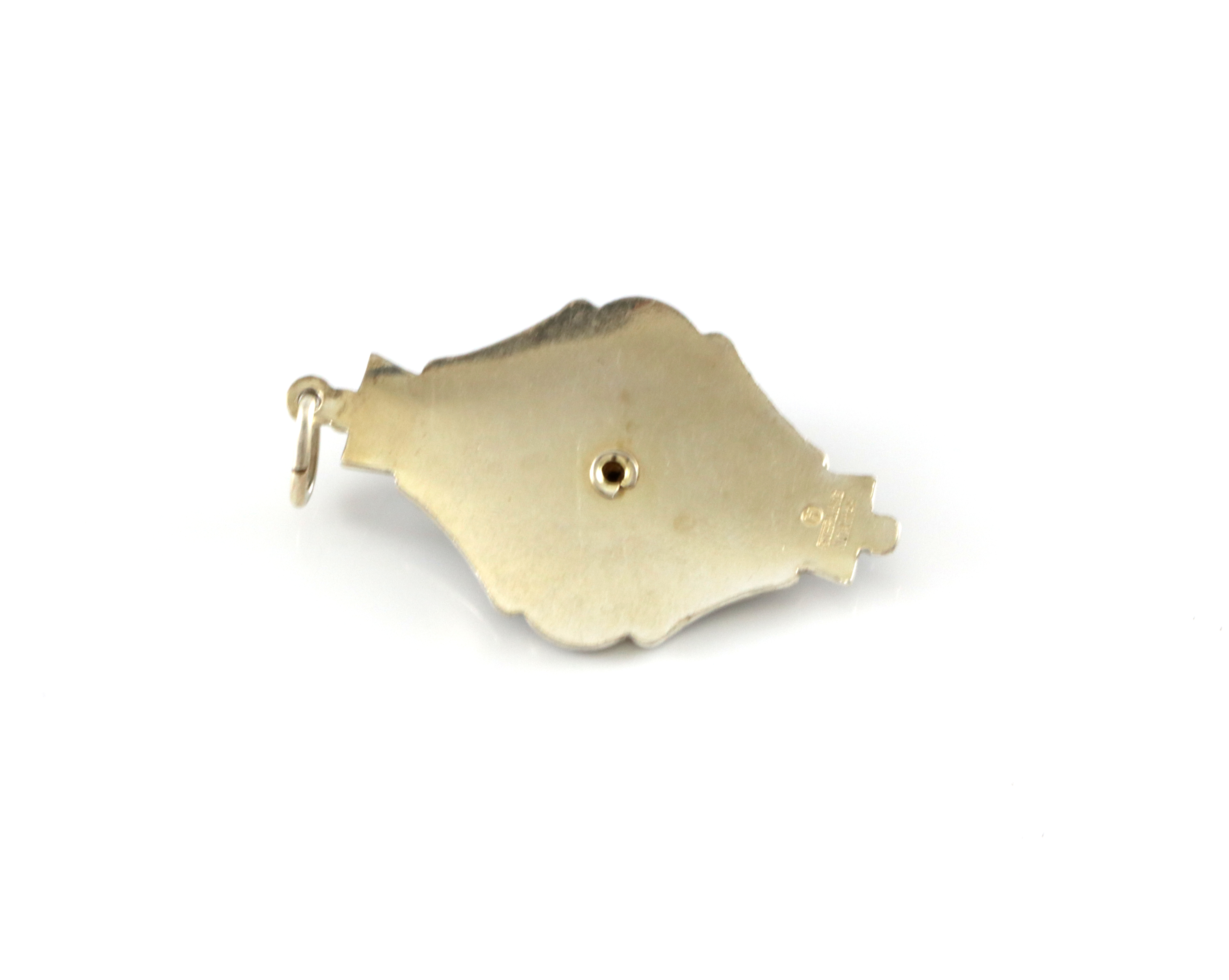 Anheng i forgylt sølv med sort emalje og filigrans. Produsert av Ivar t Holth. 4,5 x 2,3 cm
