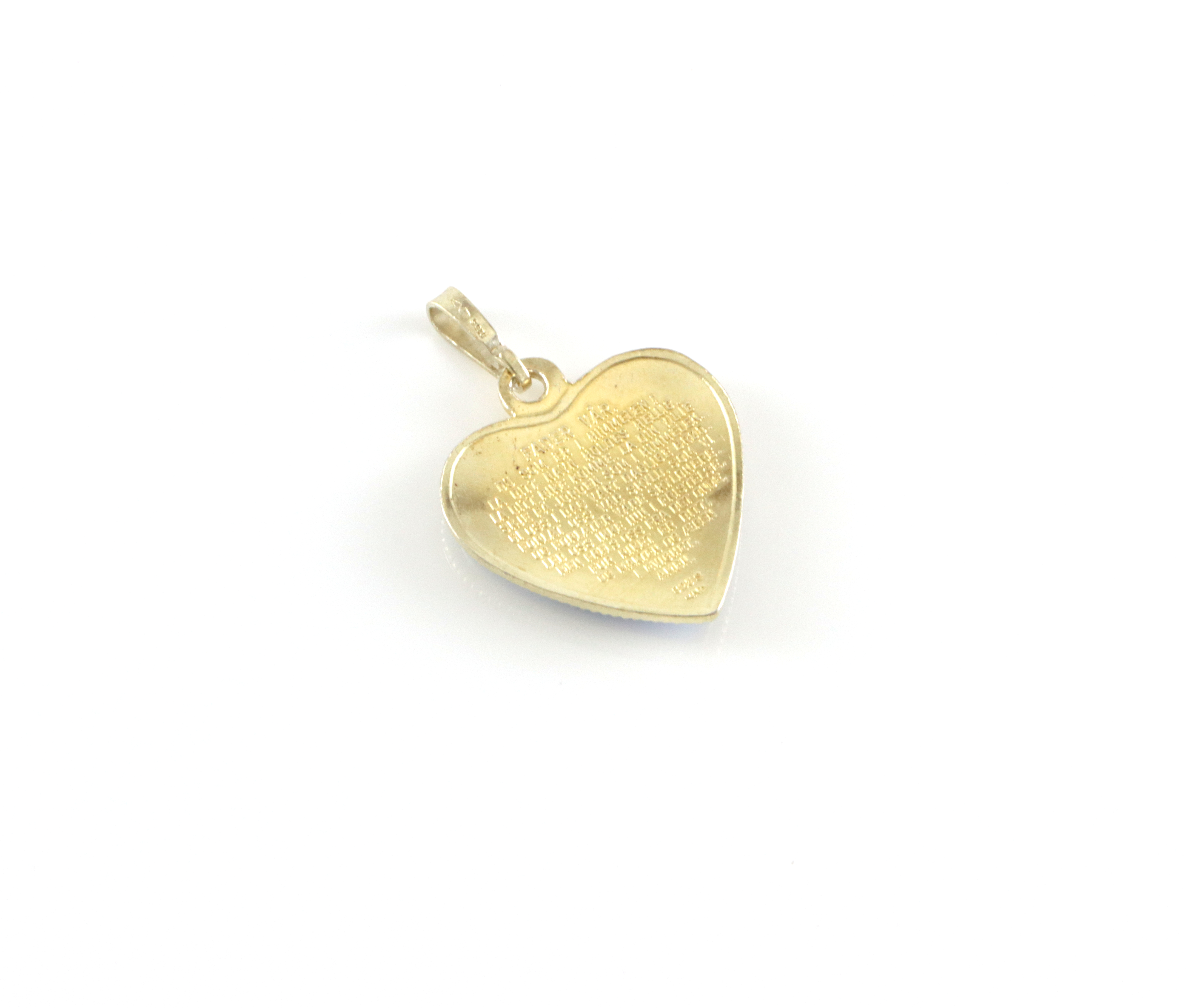 Anheng i forgylt sølv og emalje. Hjerte med teksten til fader vår og blå emalje. 2,8 x 1,9 cm