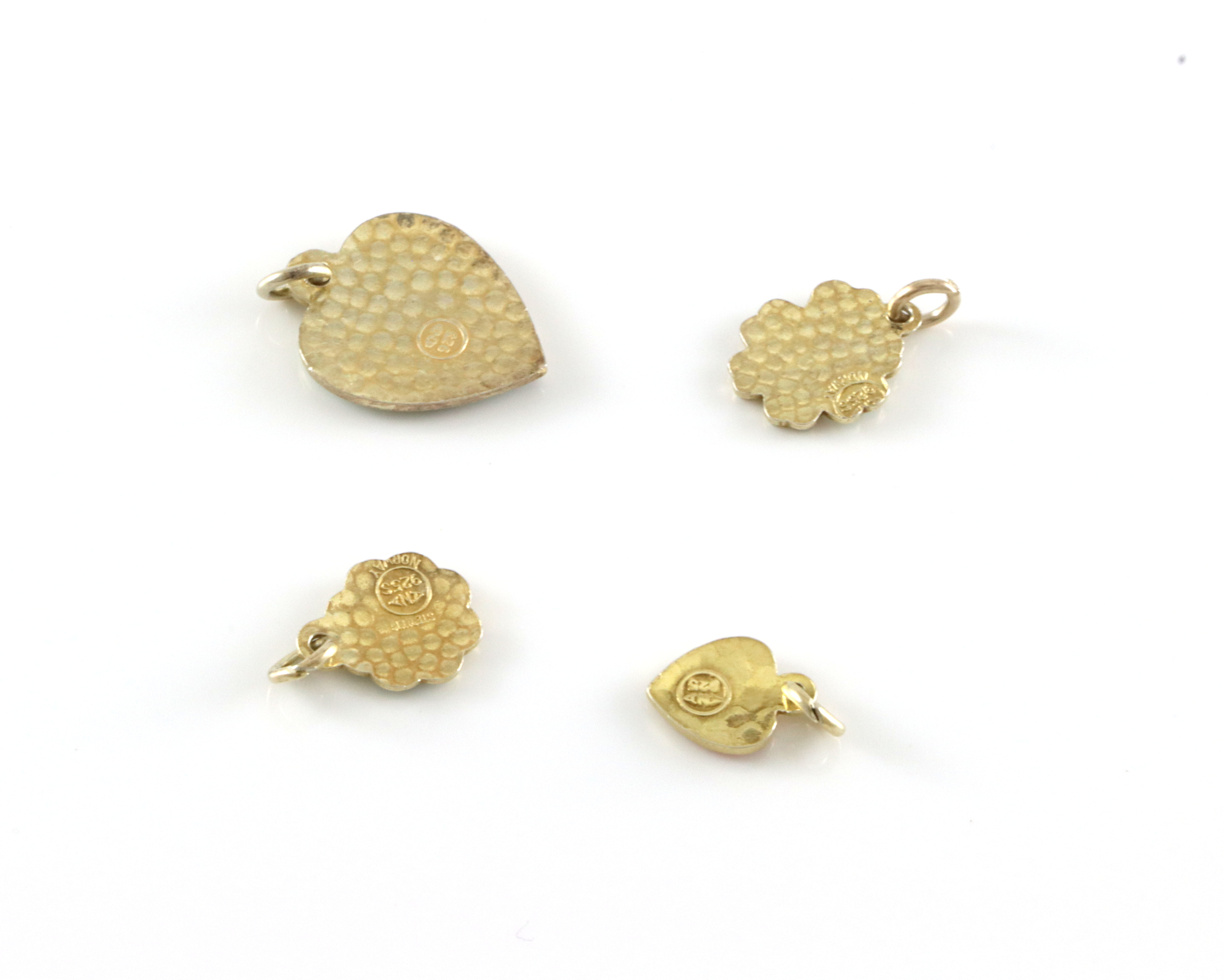 Lot med fire forgylte anheng med emalje. Alle er produsert av Arne Nordlie.
