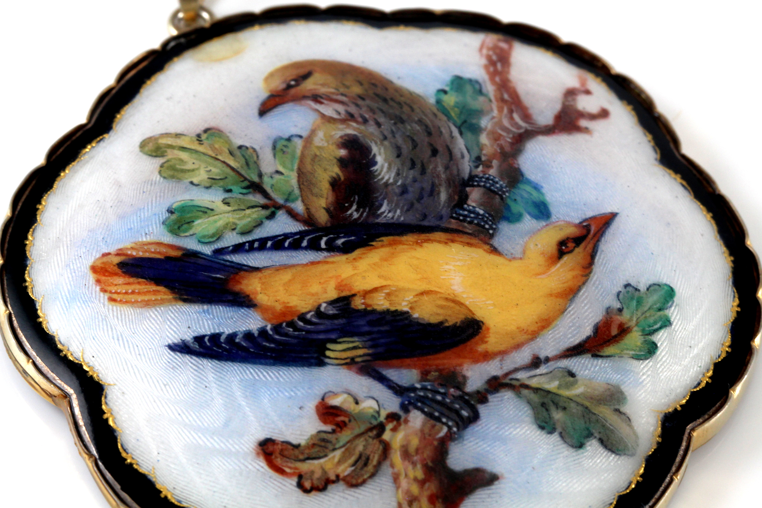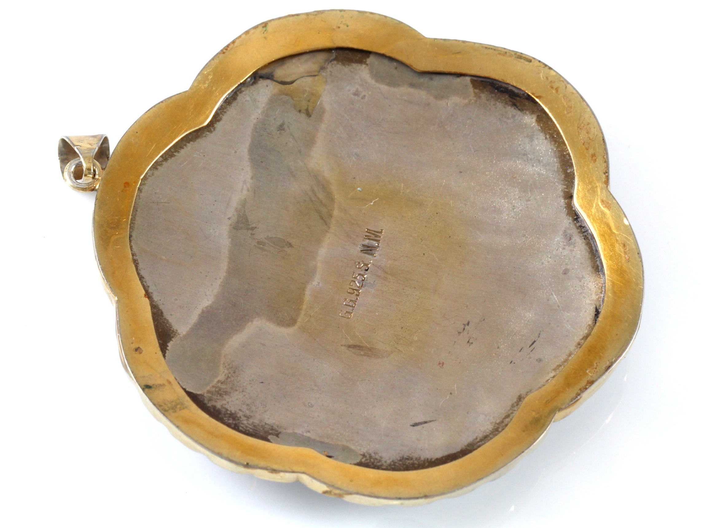 Opprinnelig en brosje produsert på Gustav Gaudernack sitt verksted. I ettertid har noen fjernet nåla, satt på en ramme og omgjort til anheng. Den er i fin skikk, men med bruksriper og et 0,5 mm avslag nederst. Det er en limrest på brosjen øverst. 6,5 x 6,8 cm stor