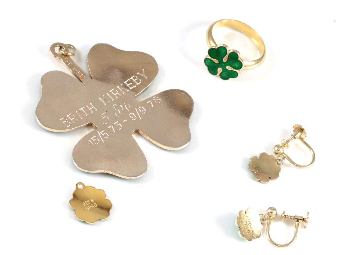 Stort anheng, gravert med navn etc bak produsert av TYA Ring, uten stempler ukjent produsent. Ørepynt, to forskjellige produsenter(Finn Jensen og OPRO). Noe fargeforskjell i emaljen på de to Lite anheng uten øsken (Finn Jensen)