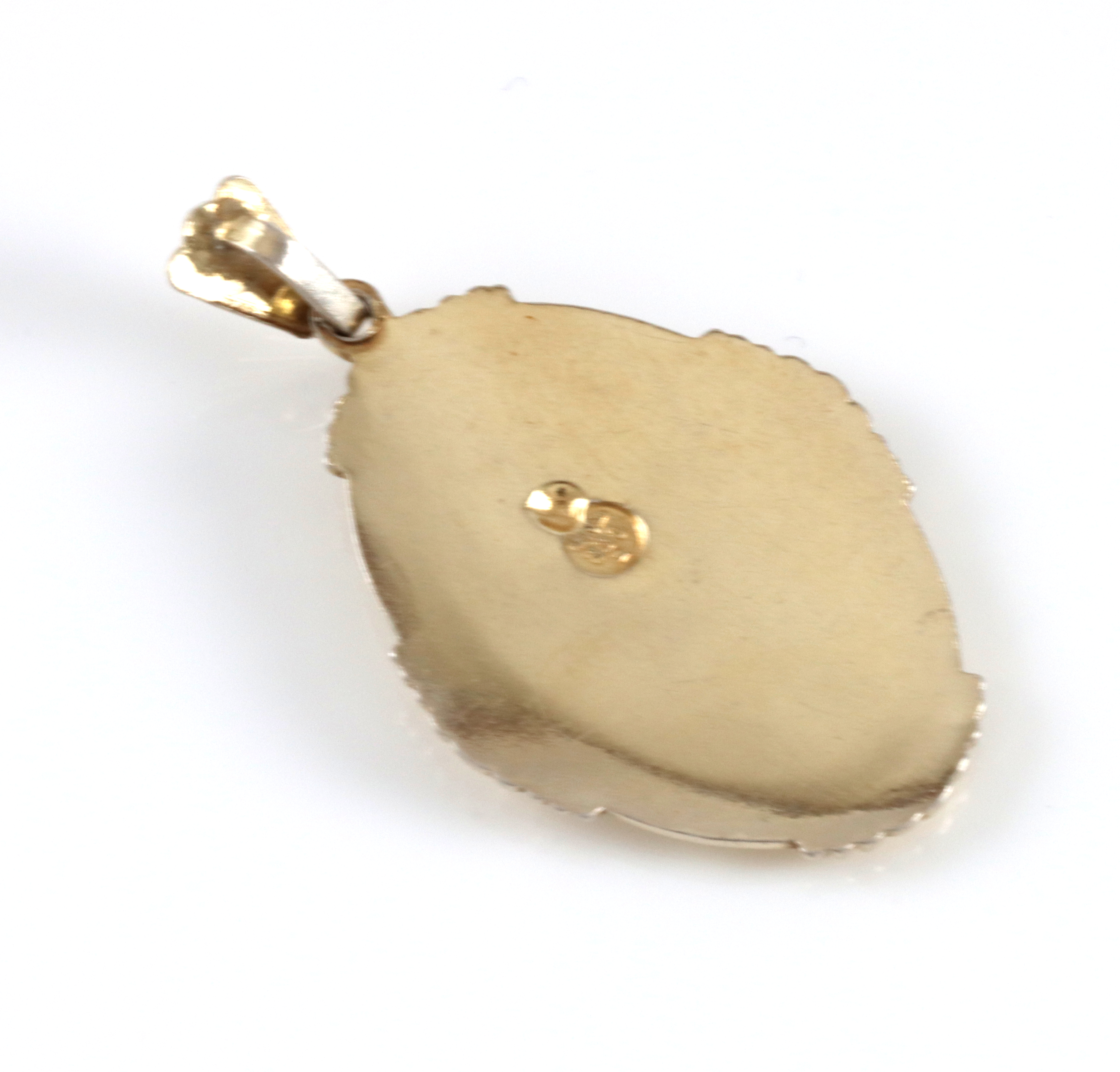 Klassisk anheng i forgyldt sølv og lys gul emalje. Produsert av Arne Nordlie. Dette er produsert i flere fargevarianter. 3,9 x 2,3 cm