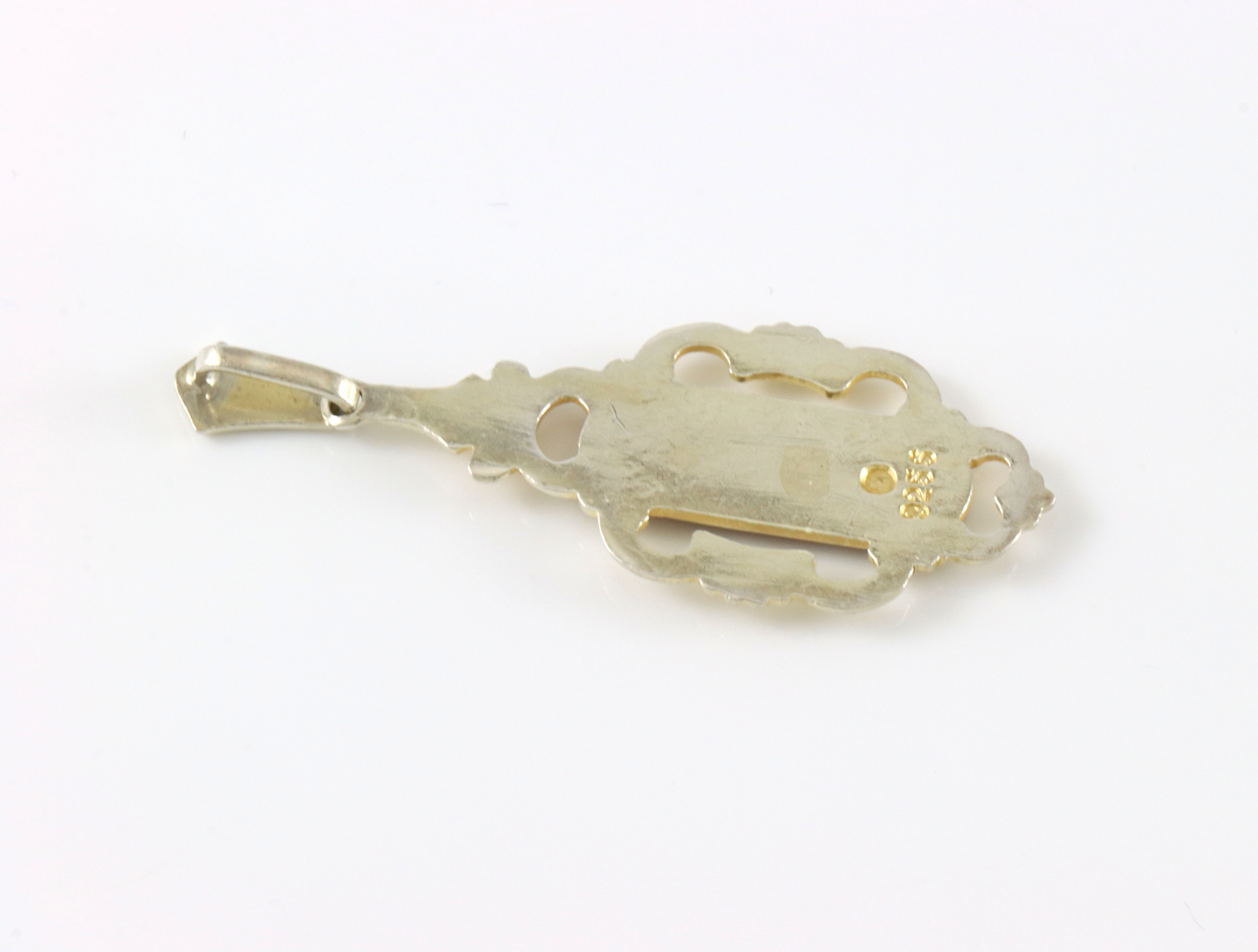 Nydelig anheng i forgylt sølv og rød emalje. Produsert av Ivar T Holth. Flott mønster i emaljen. 4,2 x 1,6 cm