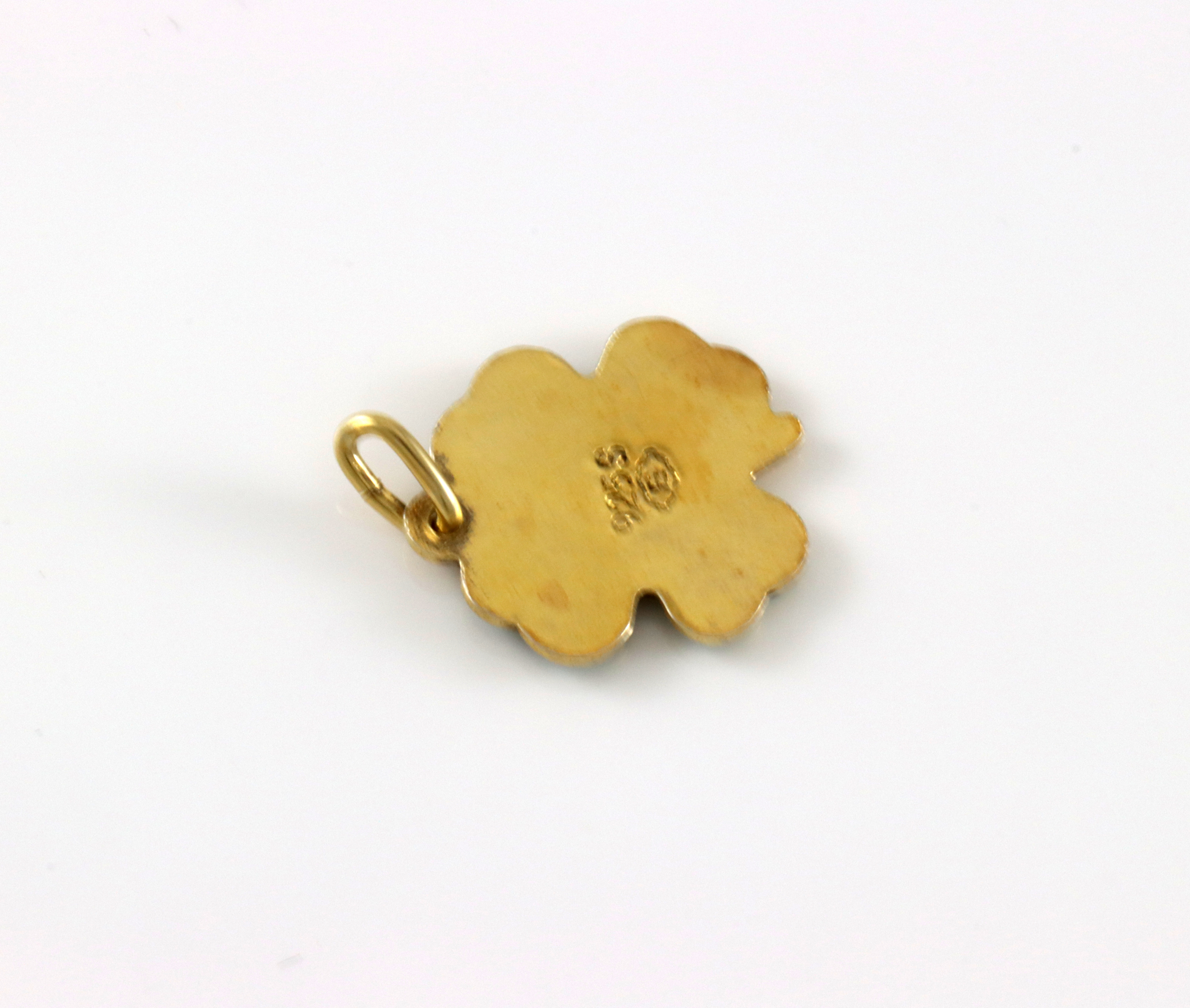 Anheng formet som firkløver i forgylt sølv og grønn emalje. Produsert av Elvik. 1,9 x 1,3 cm