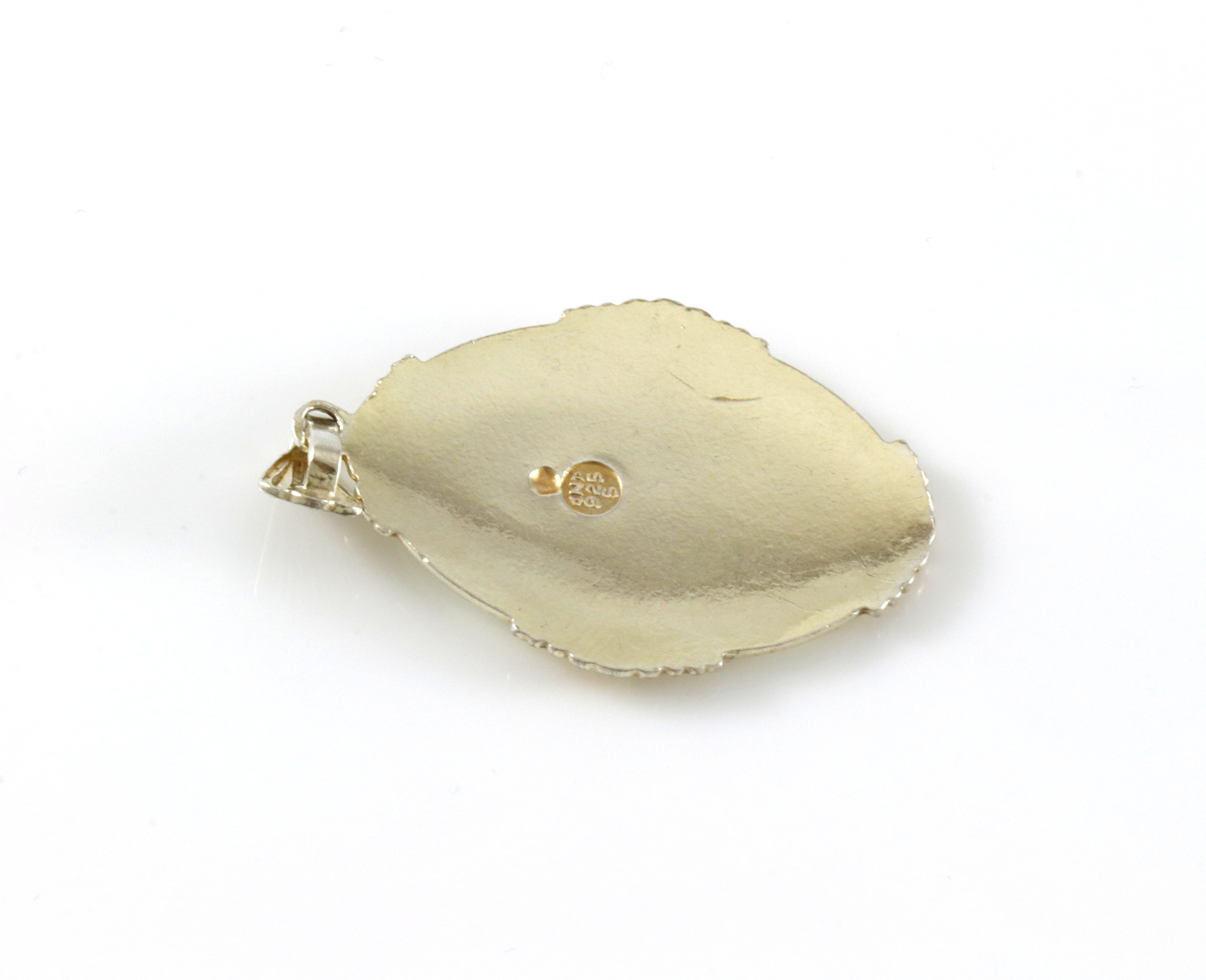 Klassisk anheng i forgylt sølv og hvit emalje. Produsert av Arne Nordlie. 4,0 x 2,2 cm