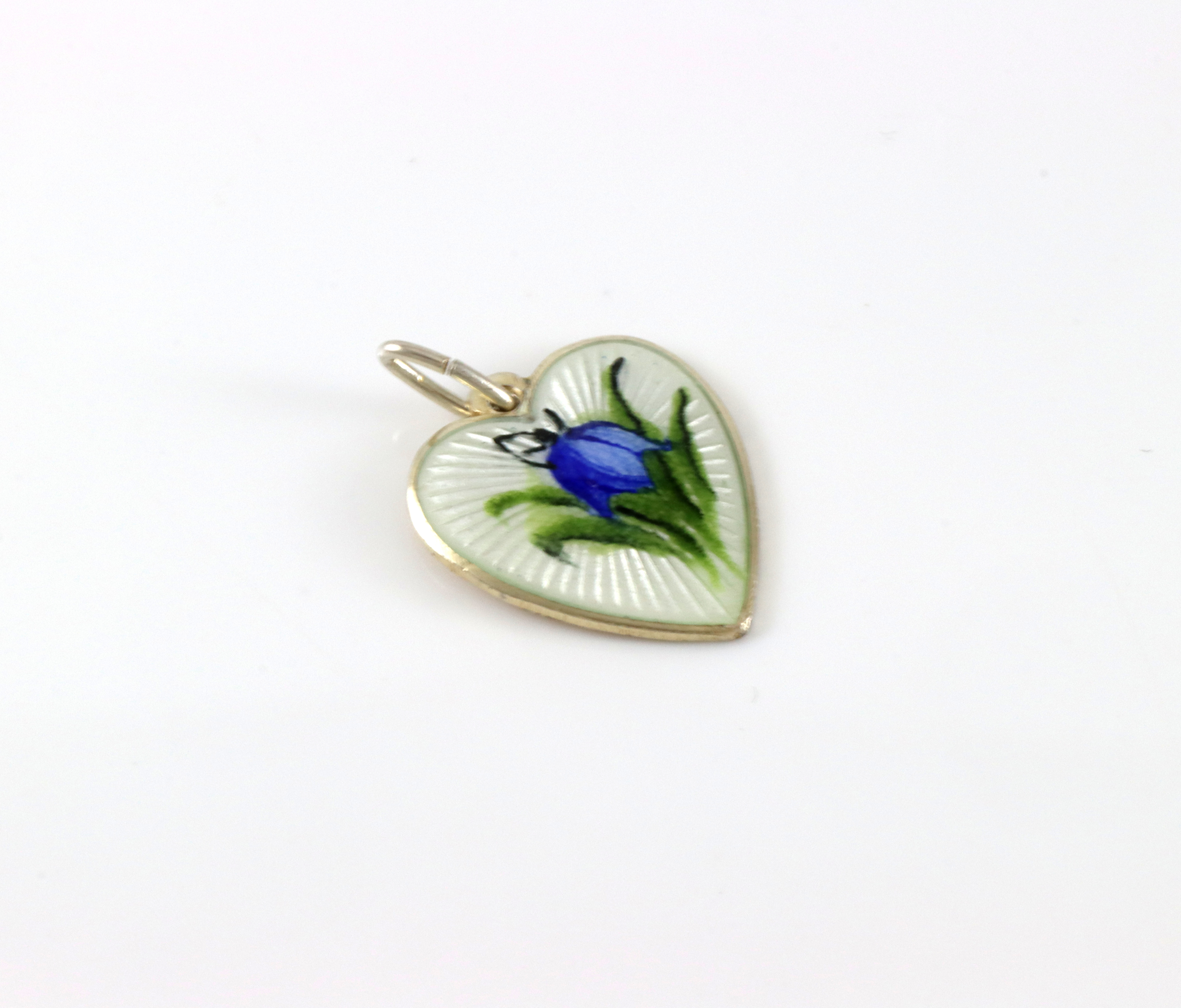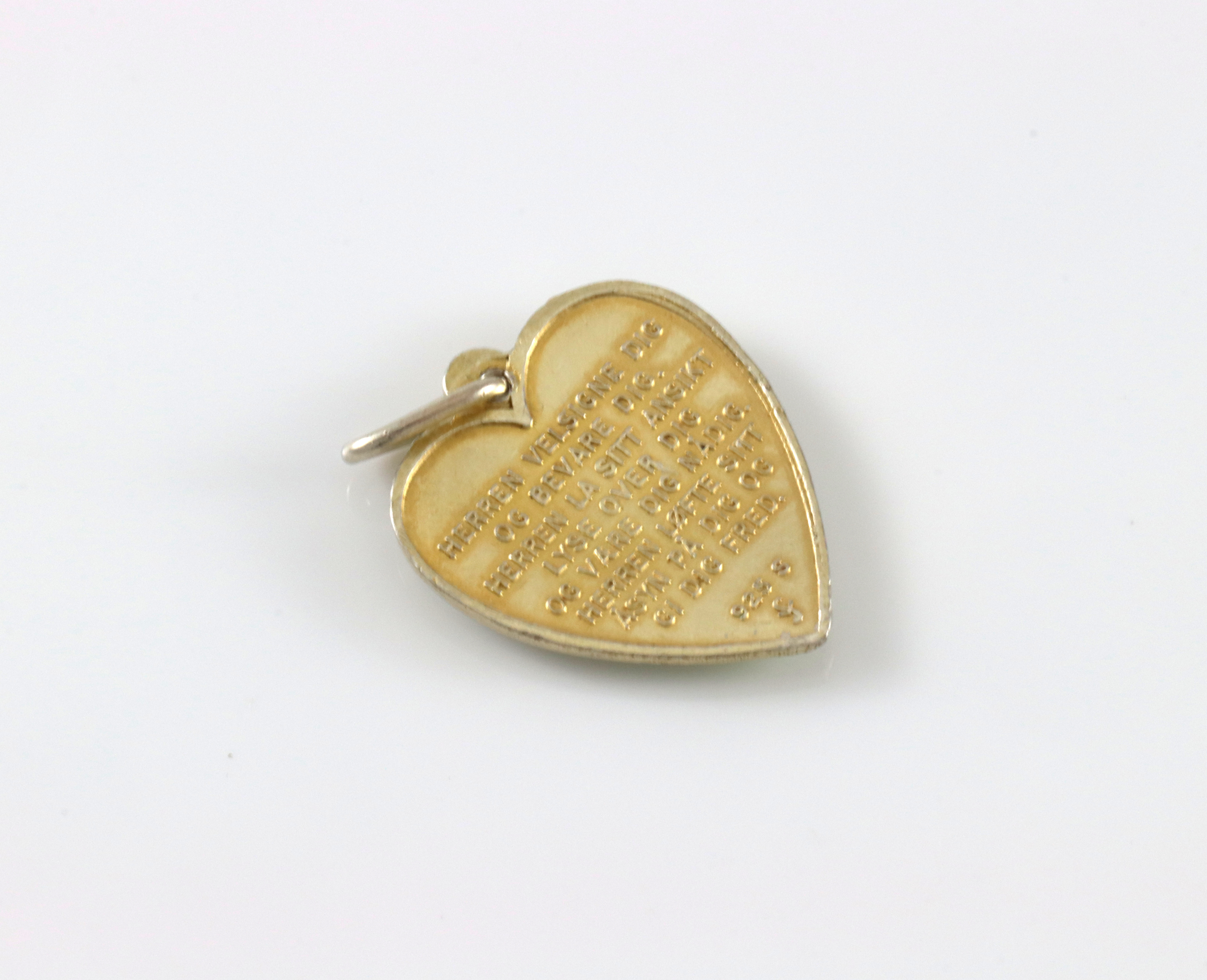 Anheng i forgylt sølv og emalje. Blåklokkemotiv på fremsiden og velsignelsen på baksiden (Ikke så vanlig å se disse med annen tekst enn Fader vår). 2,3 x 1,5 cm