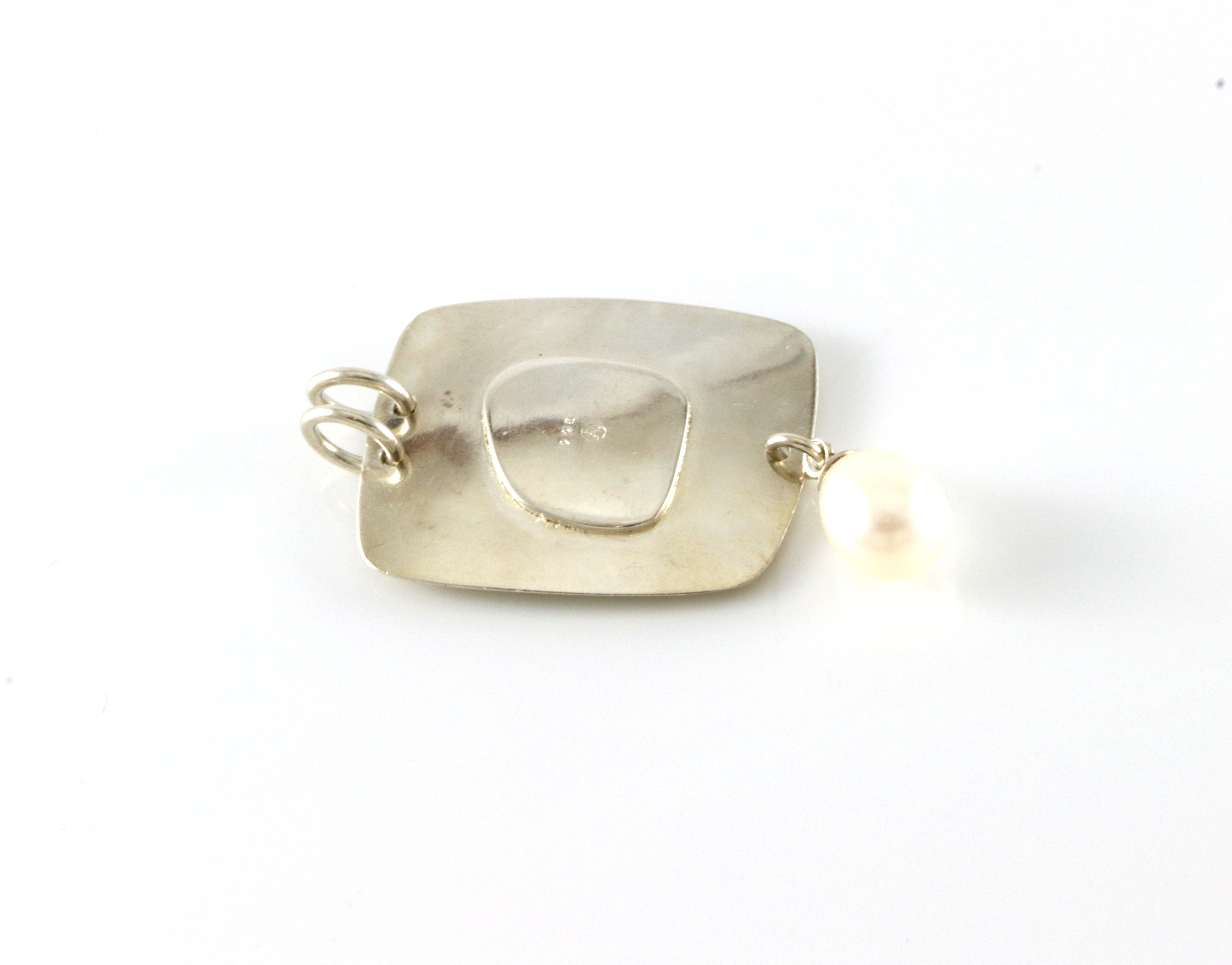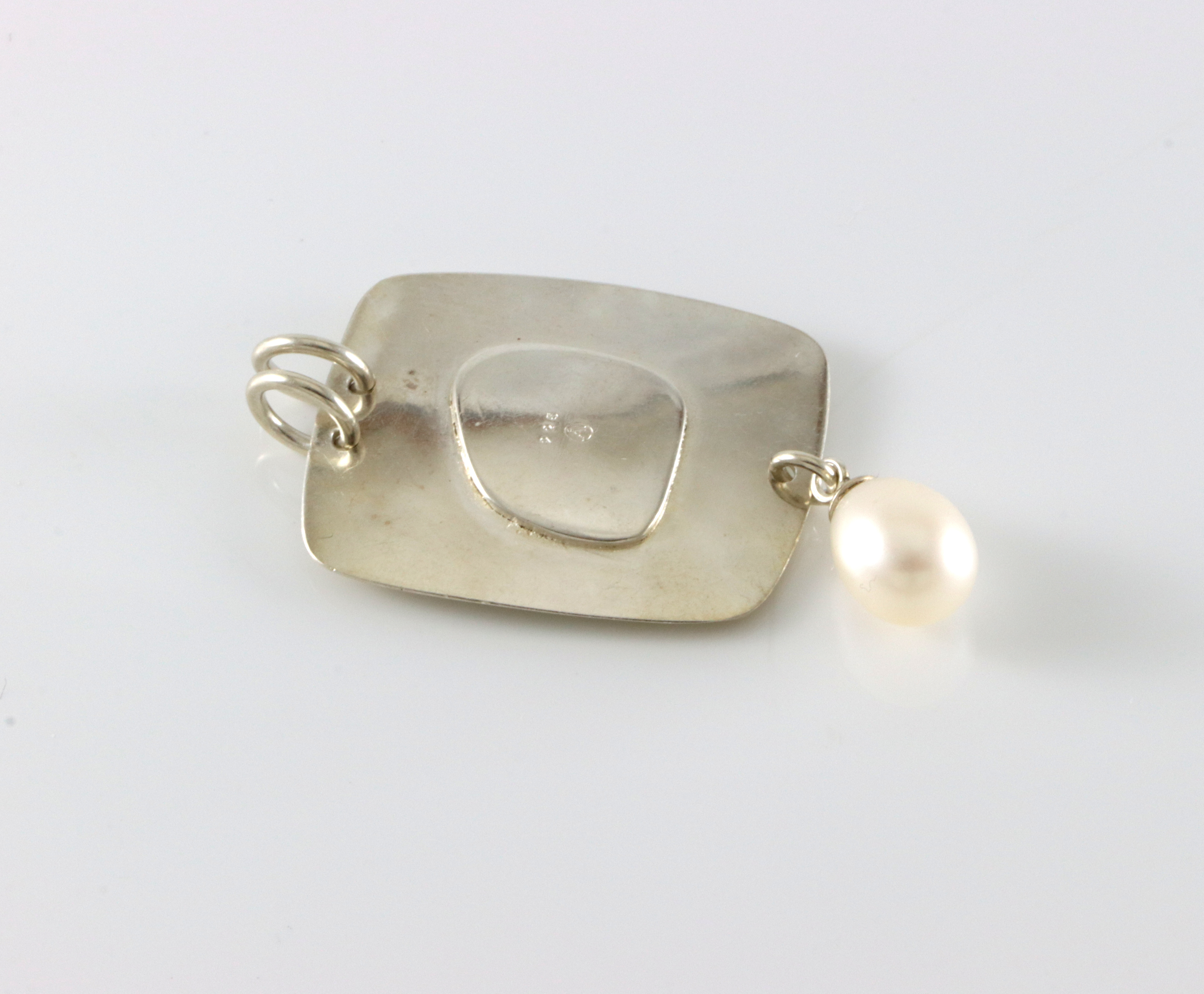 Anheng i sølv. Børstet finish foran, med grønn emalje og perle. 5,6 cm langt.