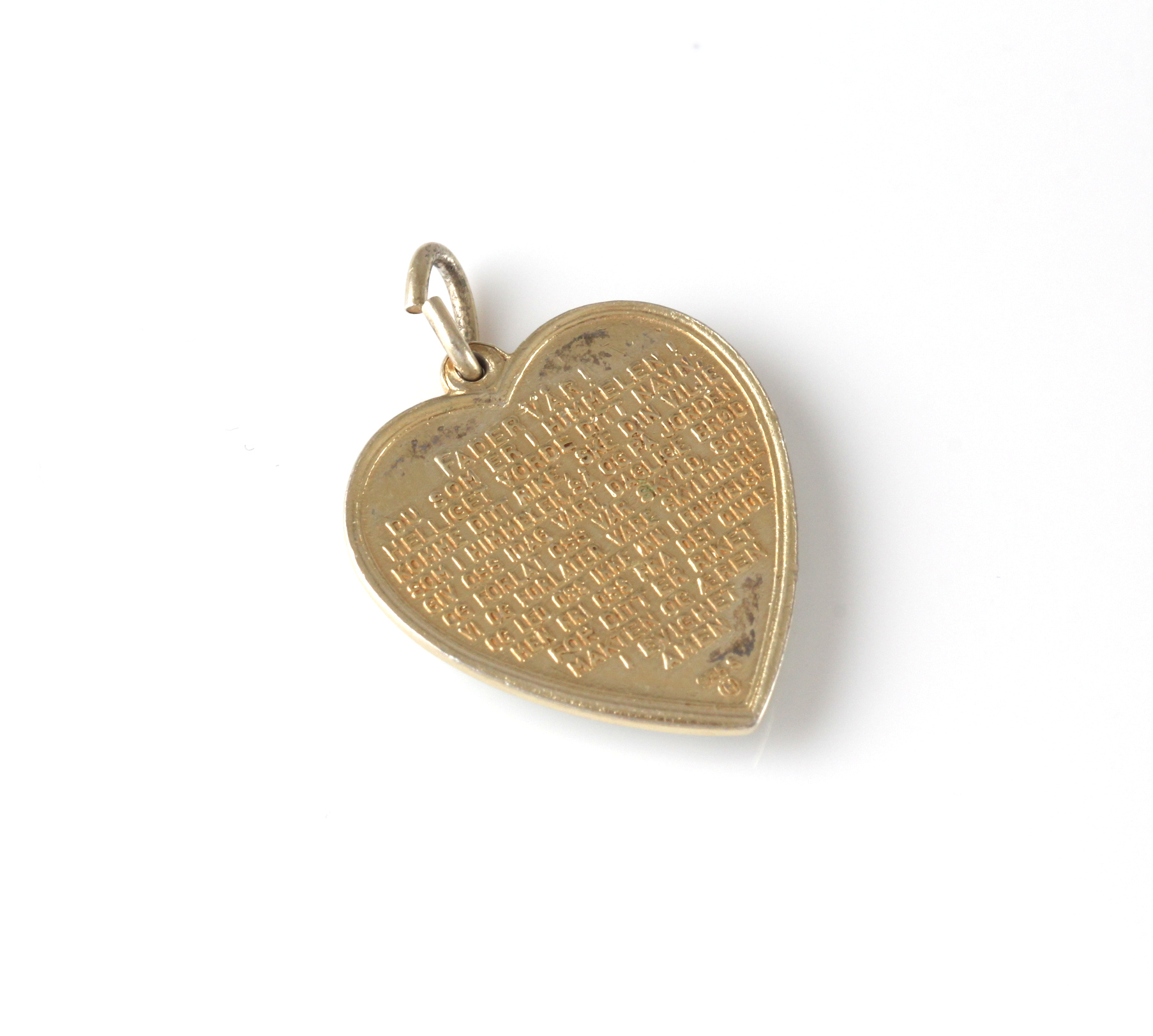 Hjerteformet anheng, forgyldt og med rosemotiv. Fader vår på baksiden. Produsert av Ivar T.Holth 2,5 x 1,7 cm