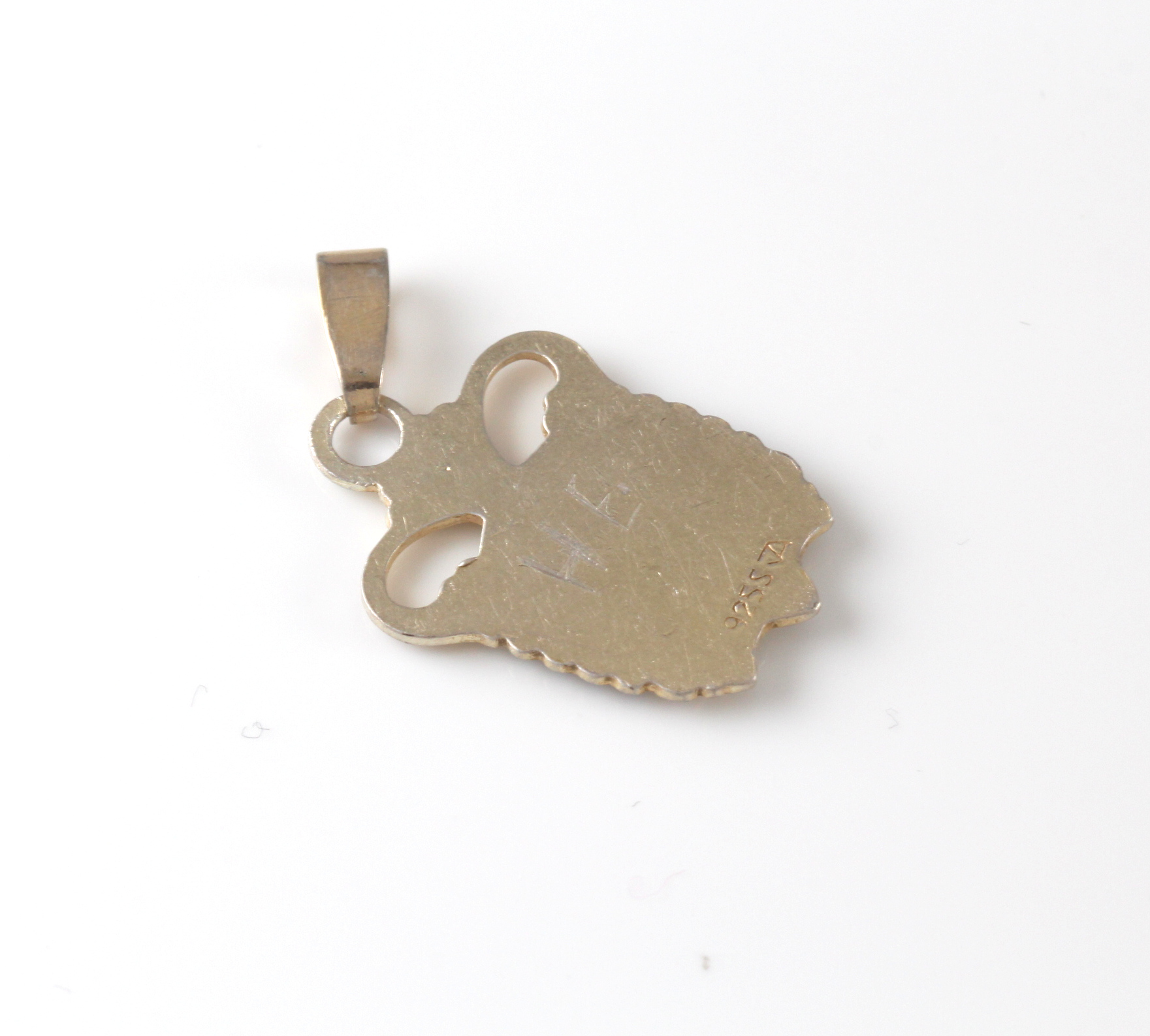 Liten anheng med lilla og svart emalje. Produsert av Jensen & Aamodt. 3,1 cm lang med øsken To bokstaver risset lett inn på baksiden.