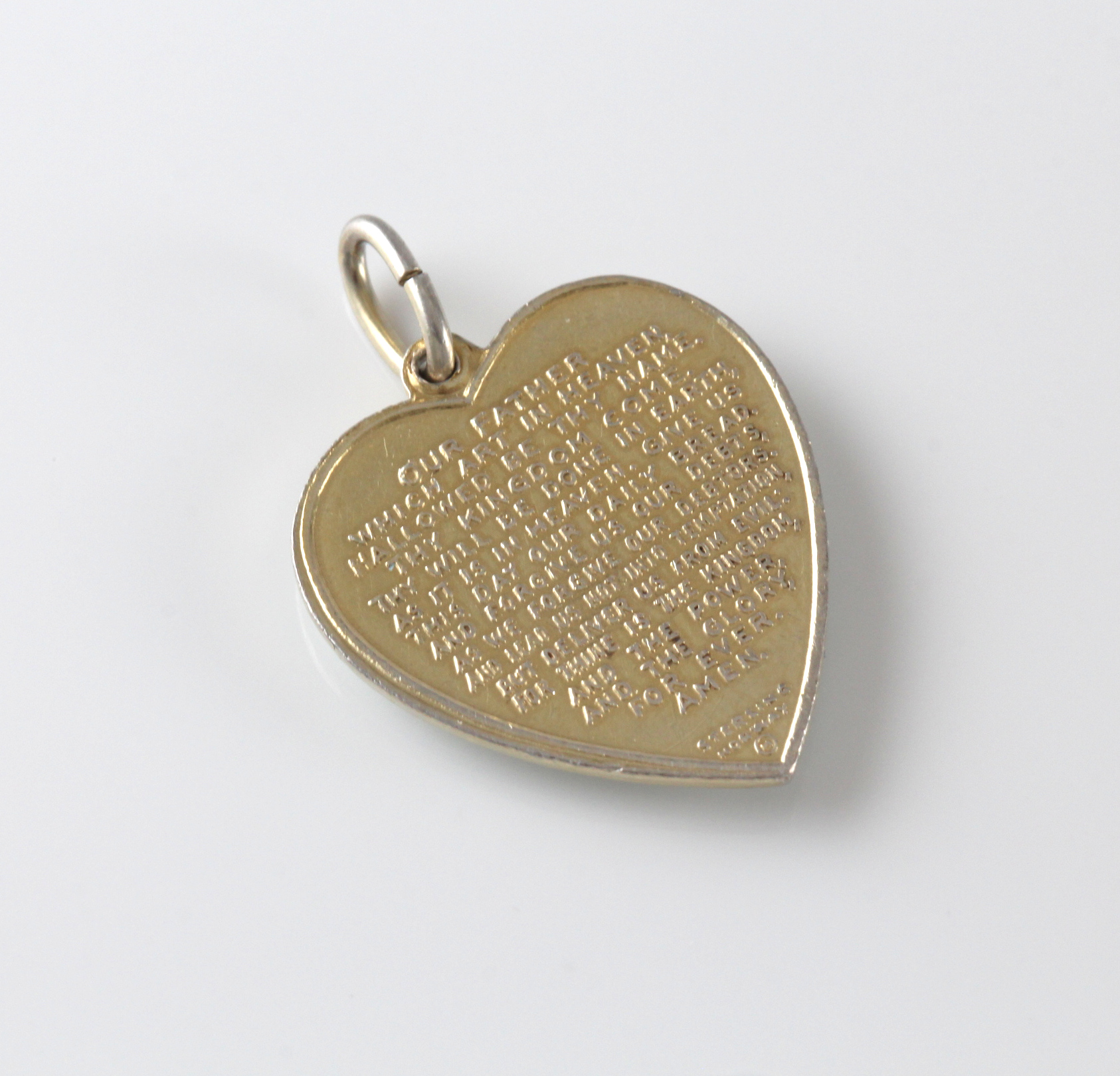 Flott emaljert hjerte med blomstermotiv foran og fader vår bak.