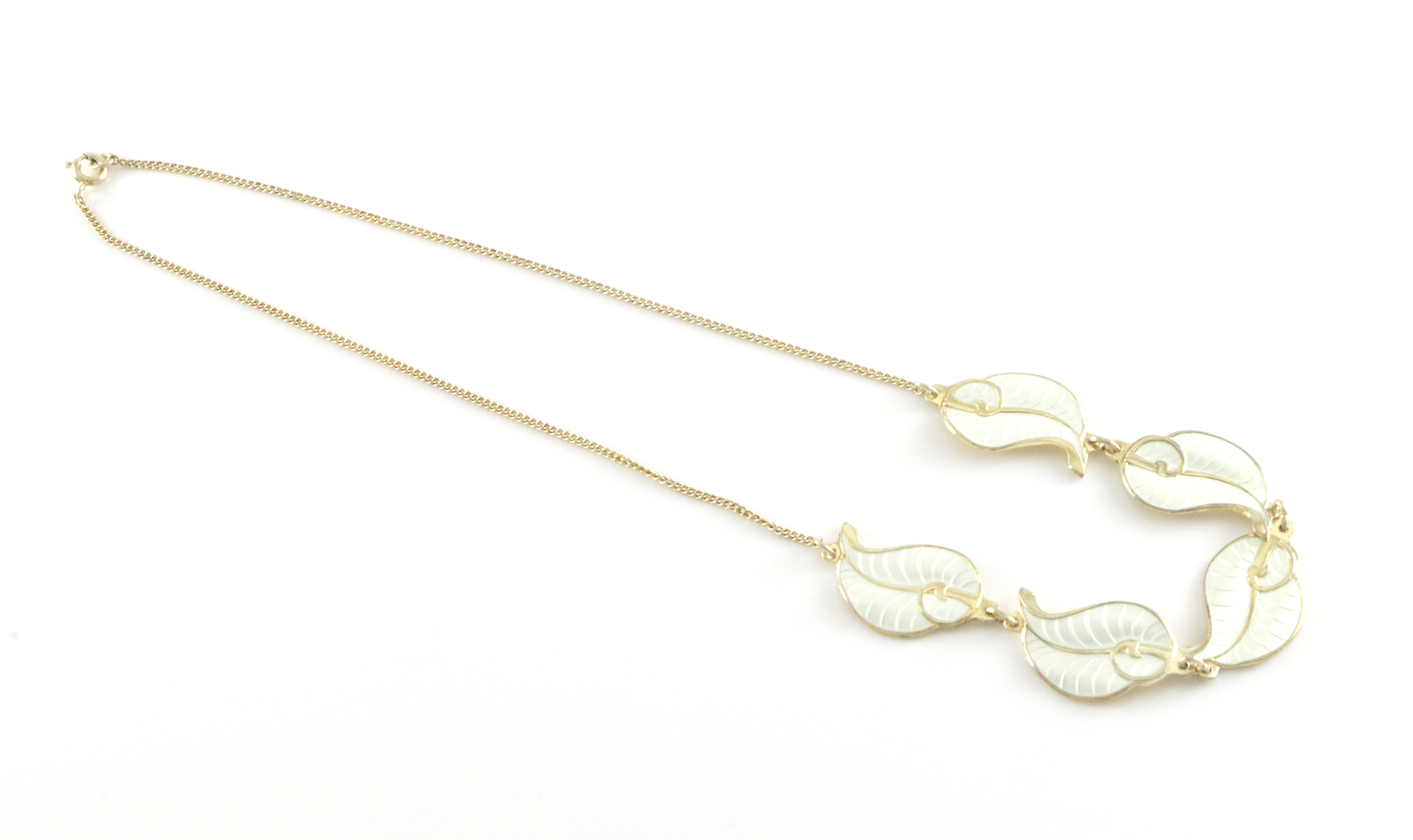 Halskjede i forgylt sølv med hvit emalje. Produsert av Andresen & Scheinpflug (TYA) Halskjedet er ca 42,0 cm langt og leddene er ca 1,5 cm bred.