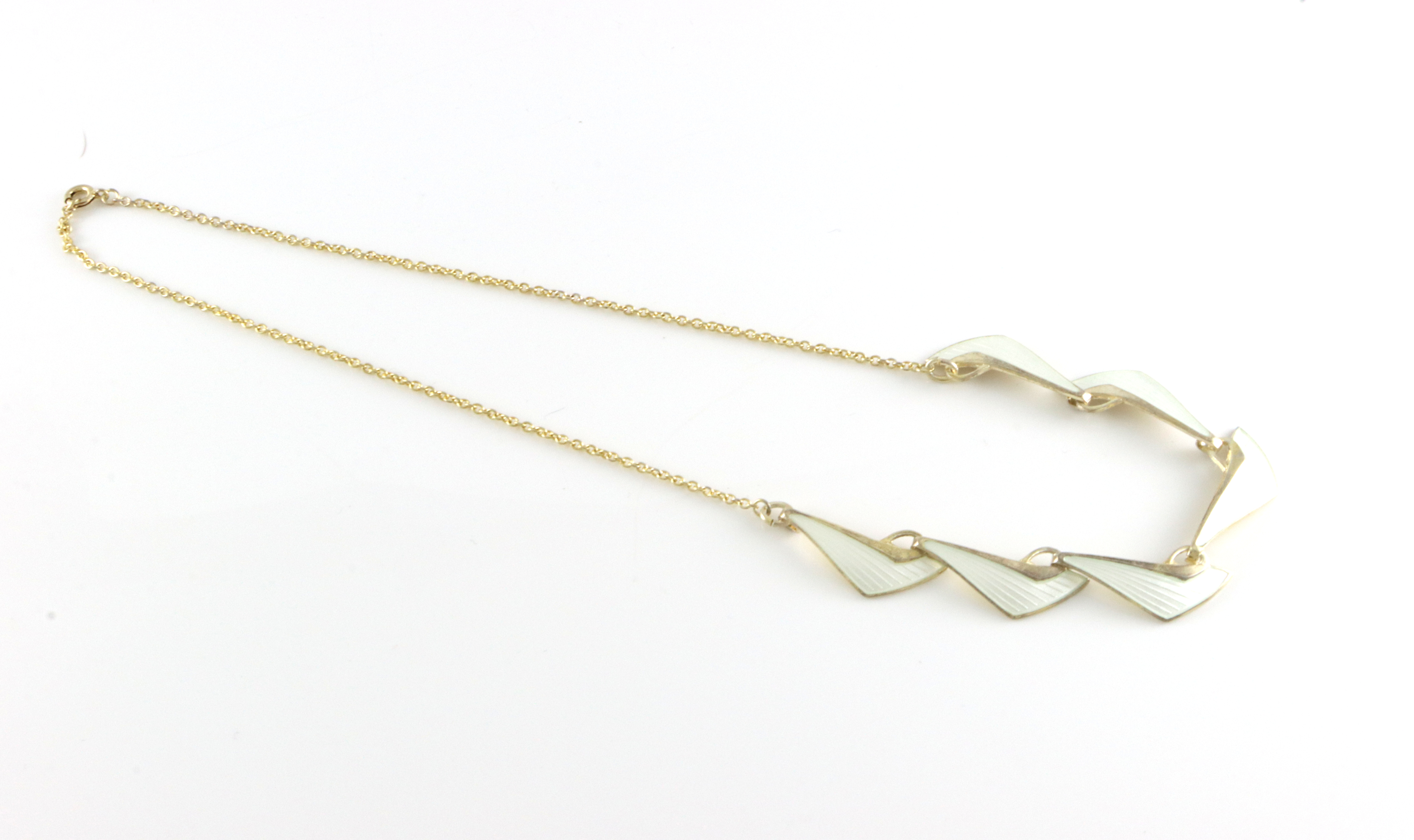 Halskjede i forgylt sølv med hvit emalje. Produsert av Albert Scharning. Halskjedet er ca 44,0 cm langt og leddene er ca 1,3 cm bred.