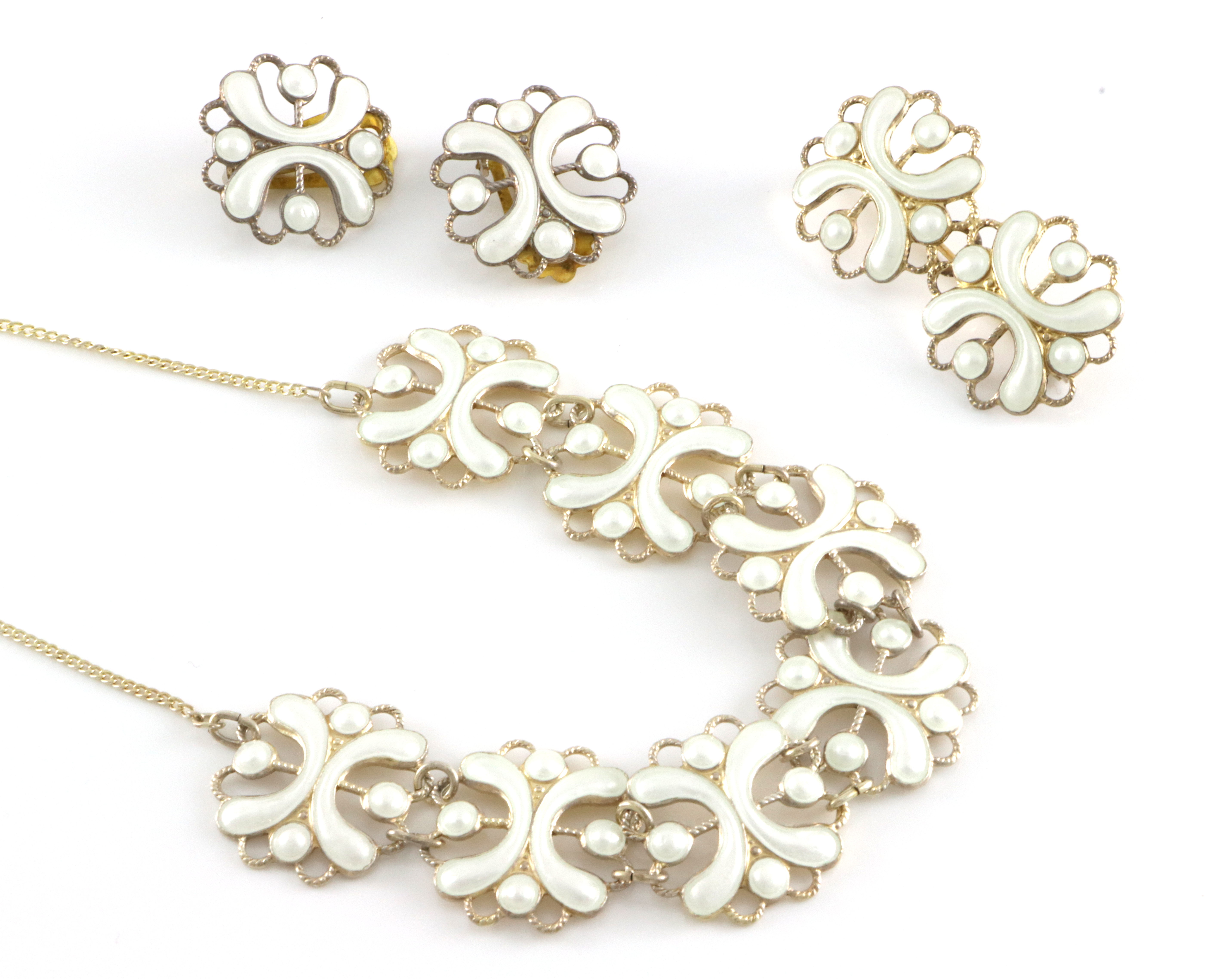 Sett i forgylt sølv med hvit emalje. Settet er produsert av Arne Nordlie. Settet består av: Halskjede på ca 46.0 cm Øreklips 2,0 x 2,0 cm (Selve klipsen er av uedelt metall) Brosje 4,2 x 2,0 cm