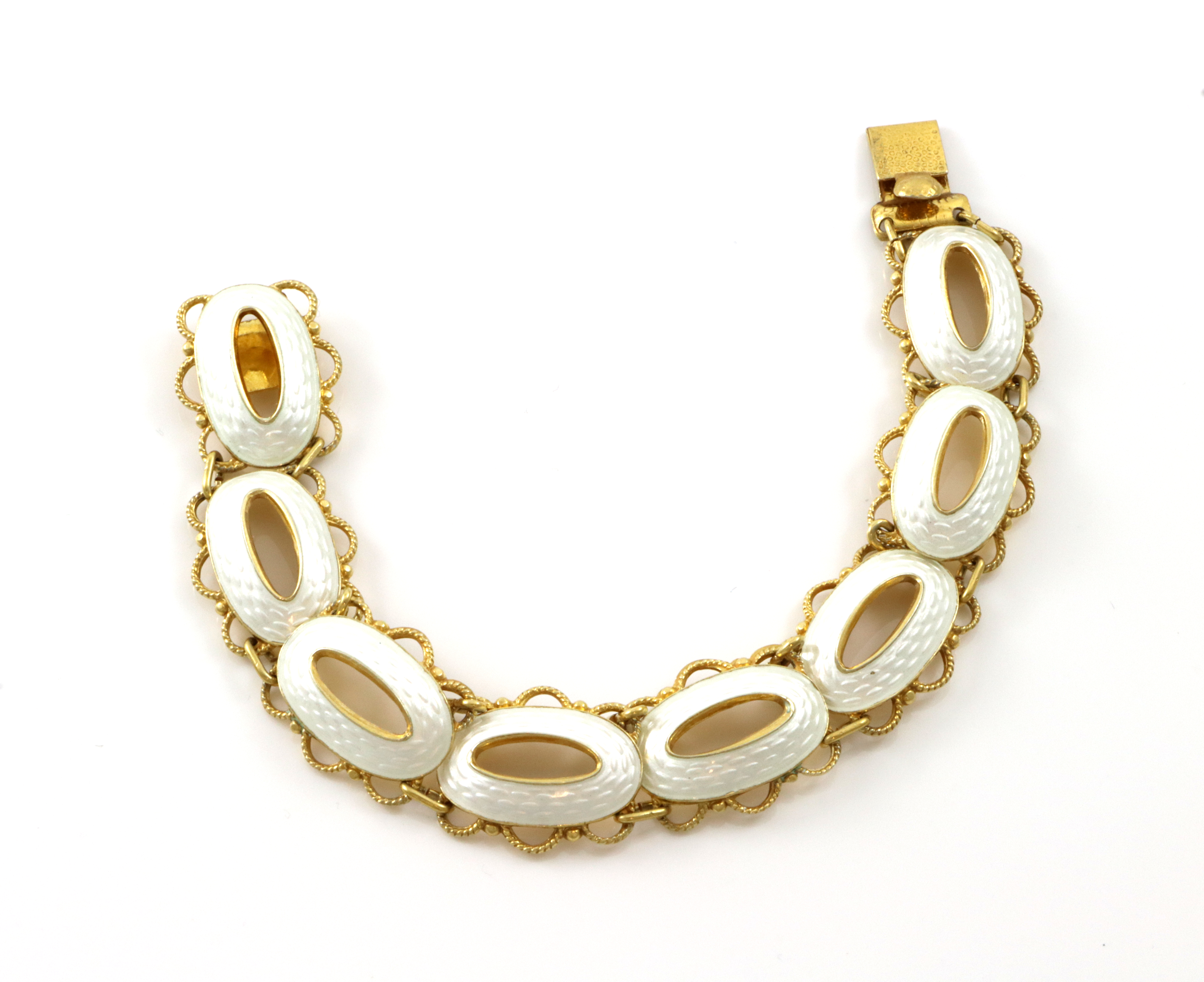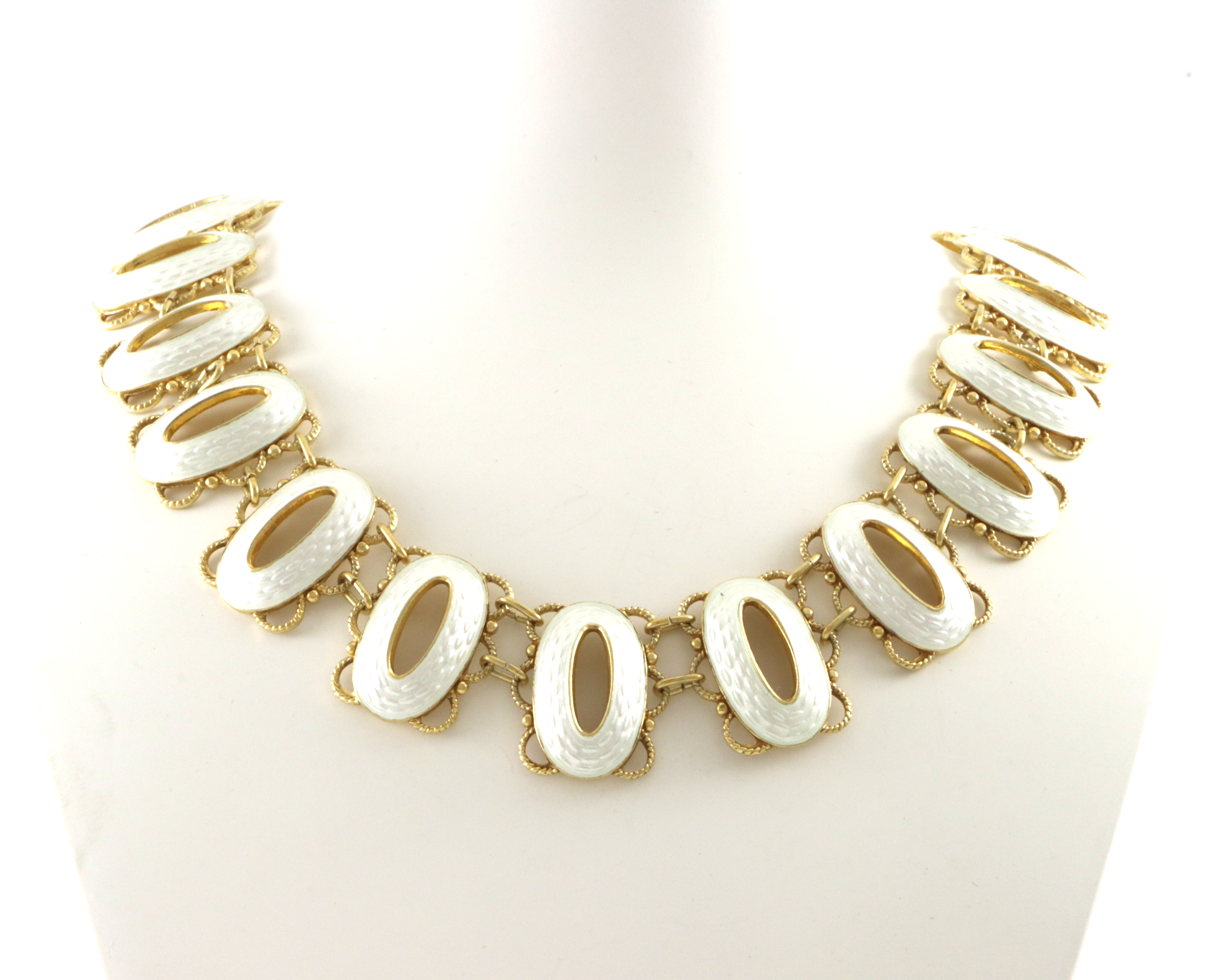 Smykkesett som består av collier og armbånd i 925 S og hvit emalje fra Arne Nordlie Bredde collier: 20 mm Lengde: 38,5 cm Bredde armbånd:17 cm Lengde: 17 cm Settet er i svært god stand