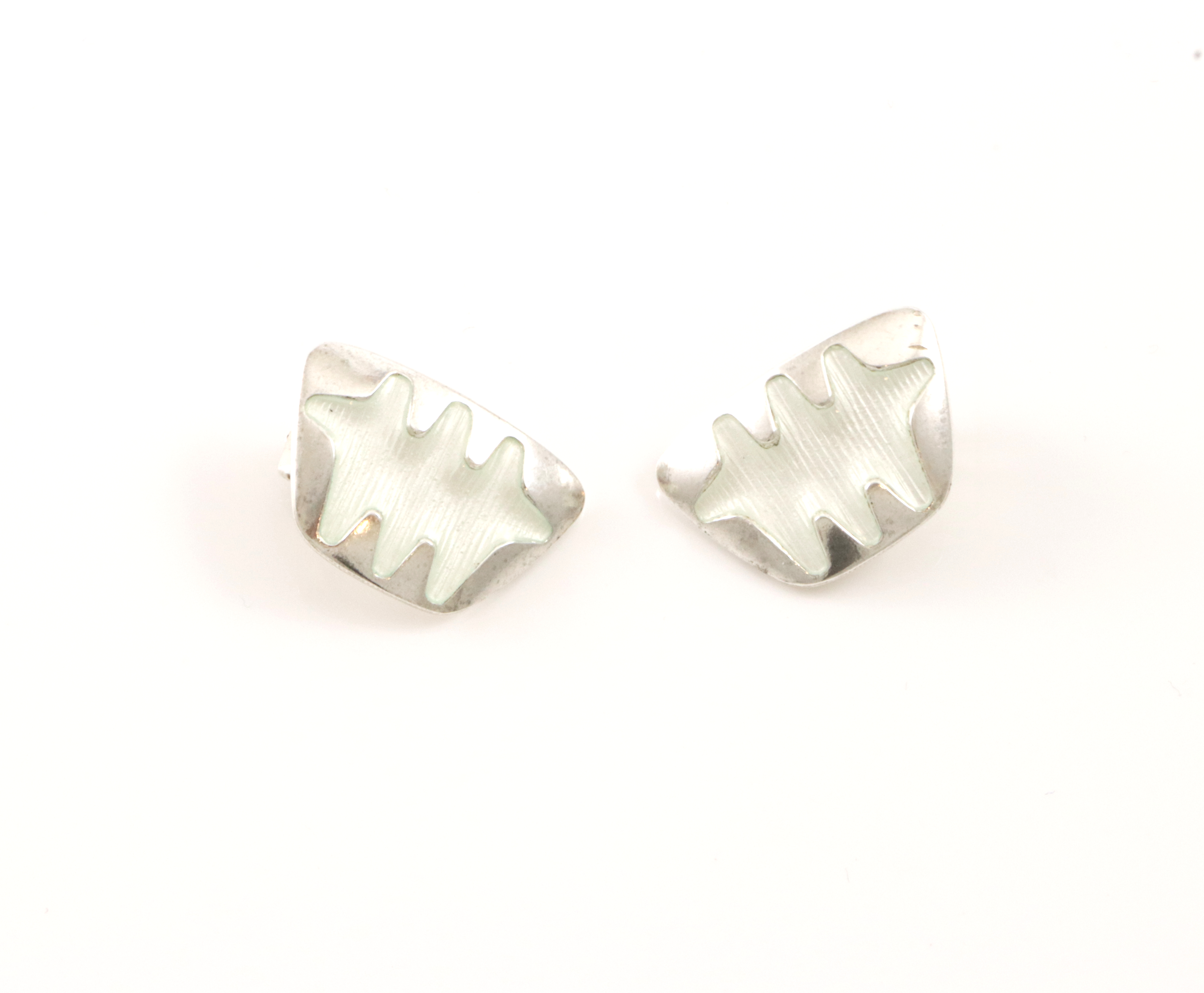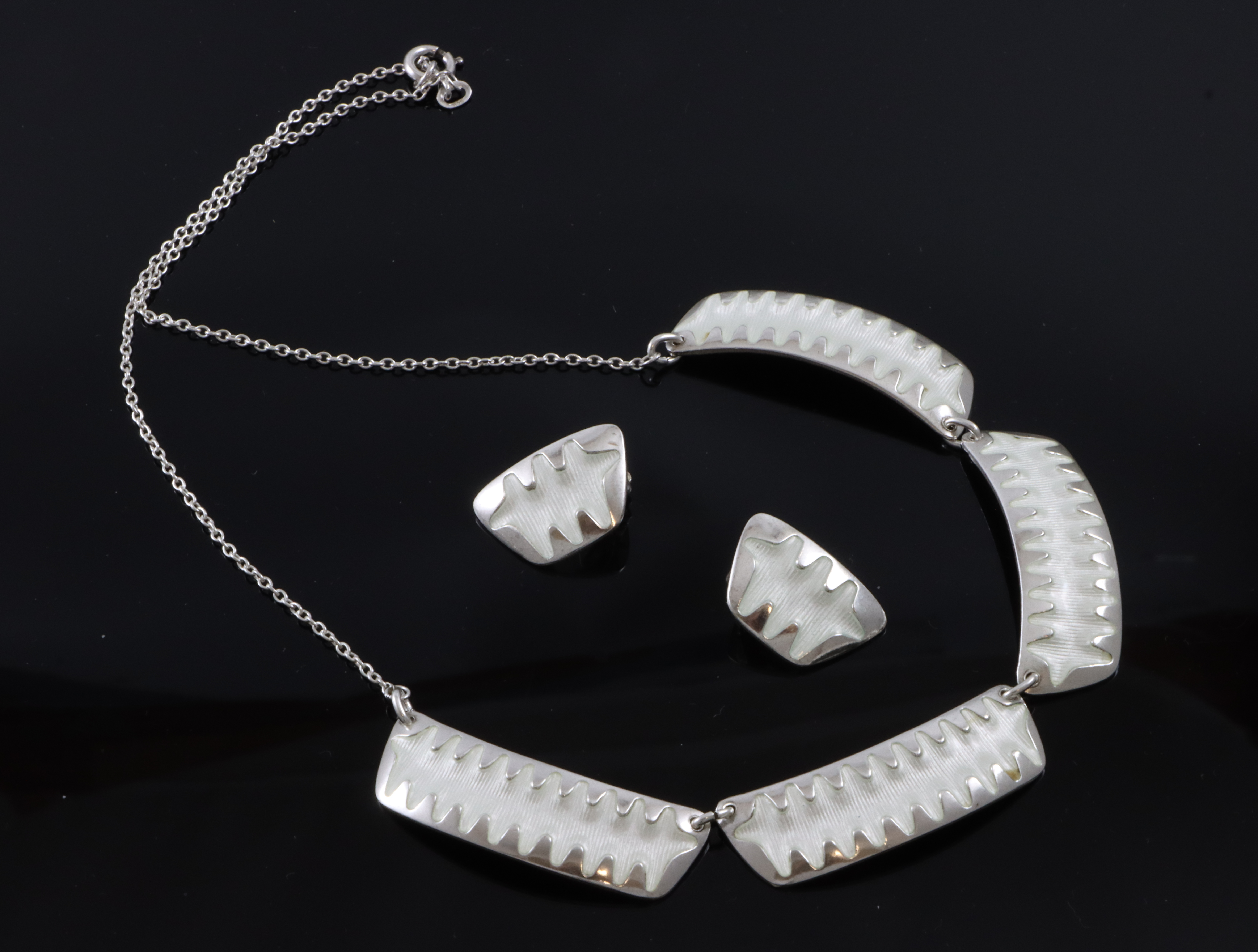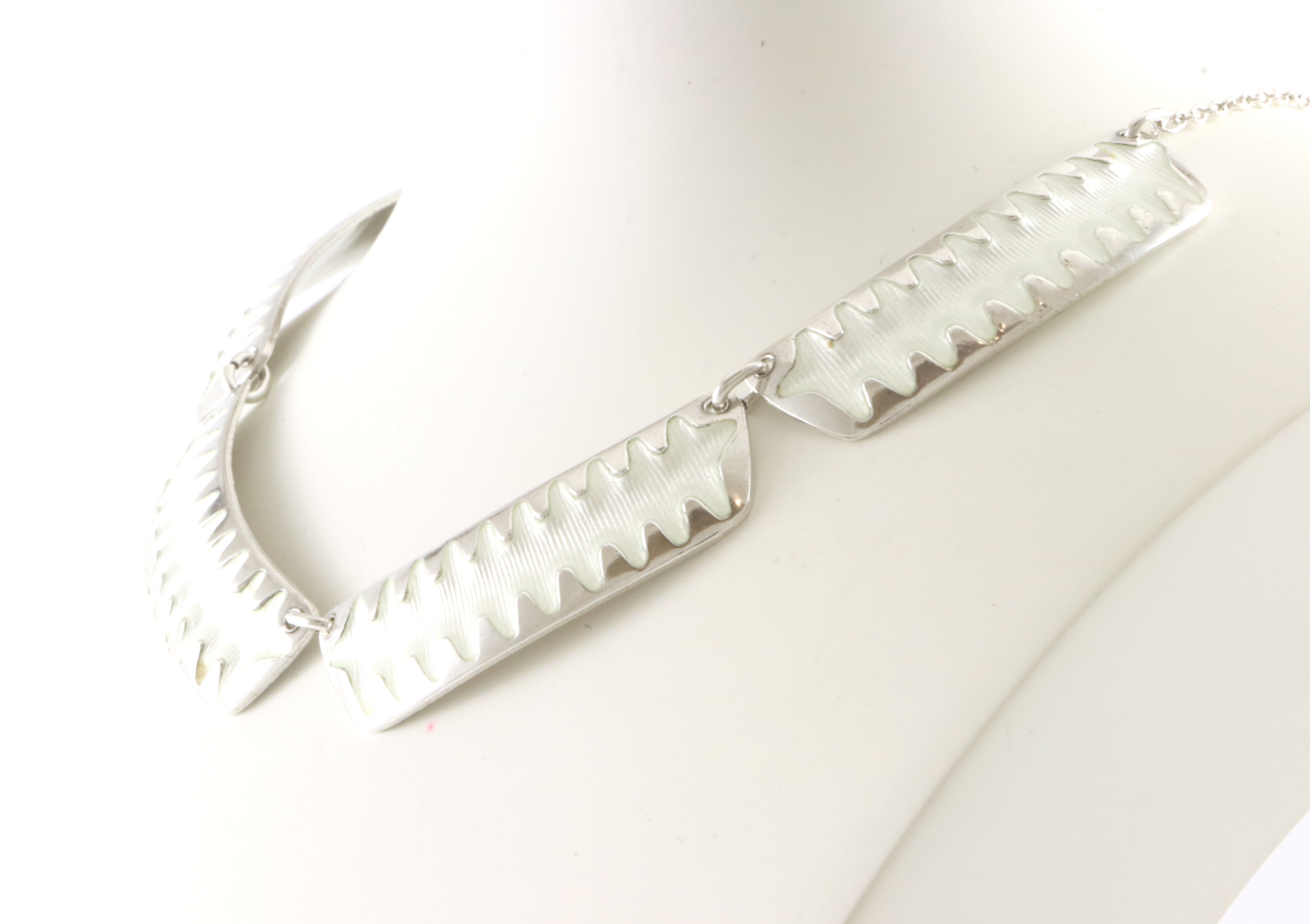Feiende flott sett fra Albert Scharning i 925 S og hvit emalje. Består av collier og øreklips Bredde collier: 12 mm Lengde collier: 44 m Str øreklips: 20 x 13 mm Settet er i meget god stand