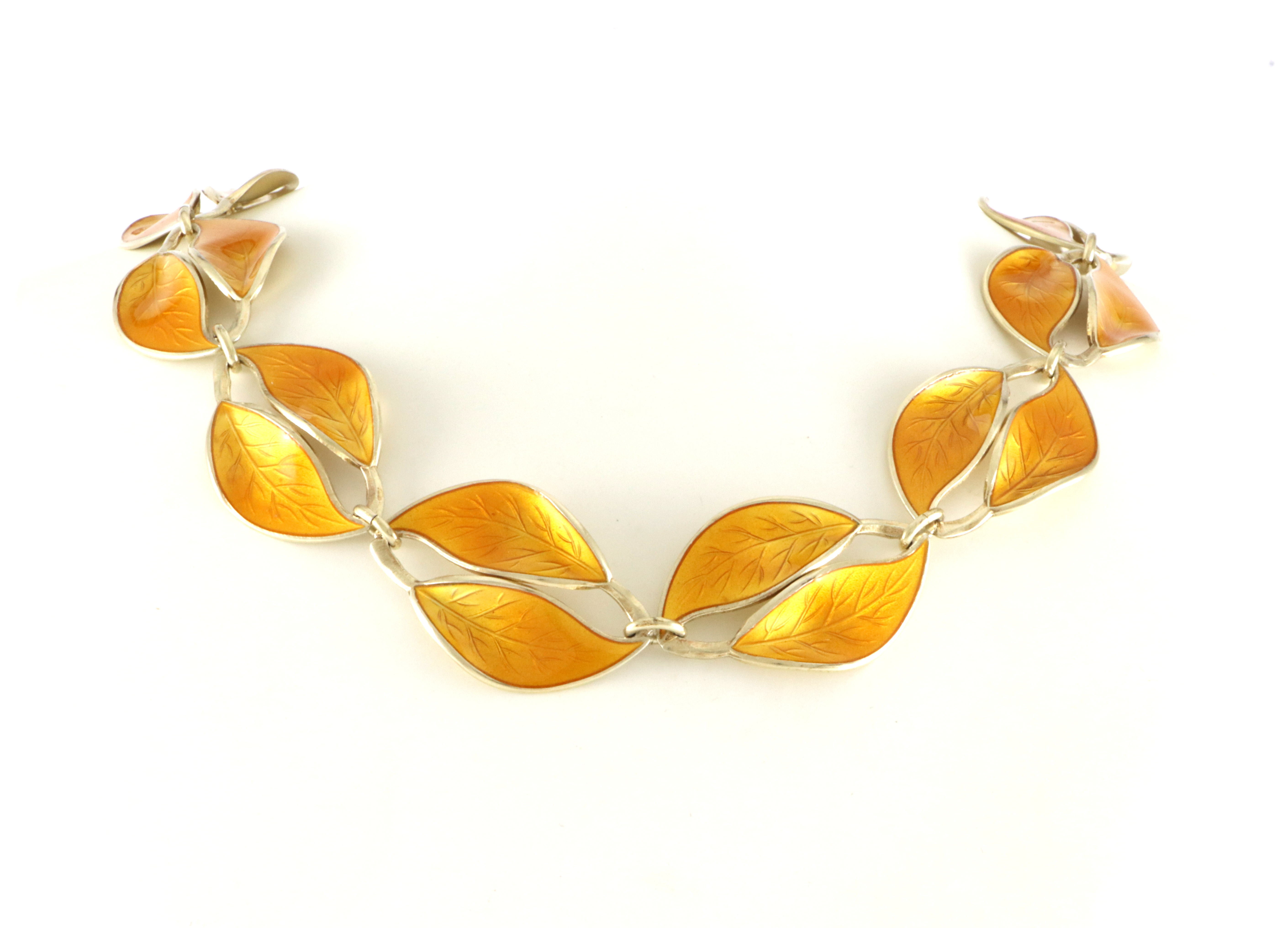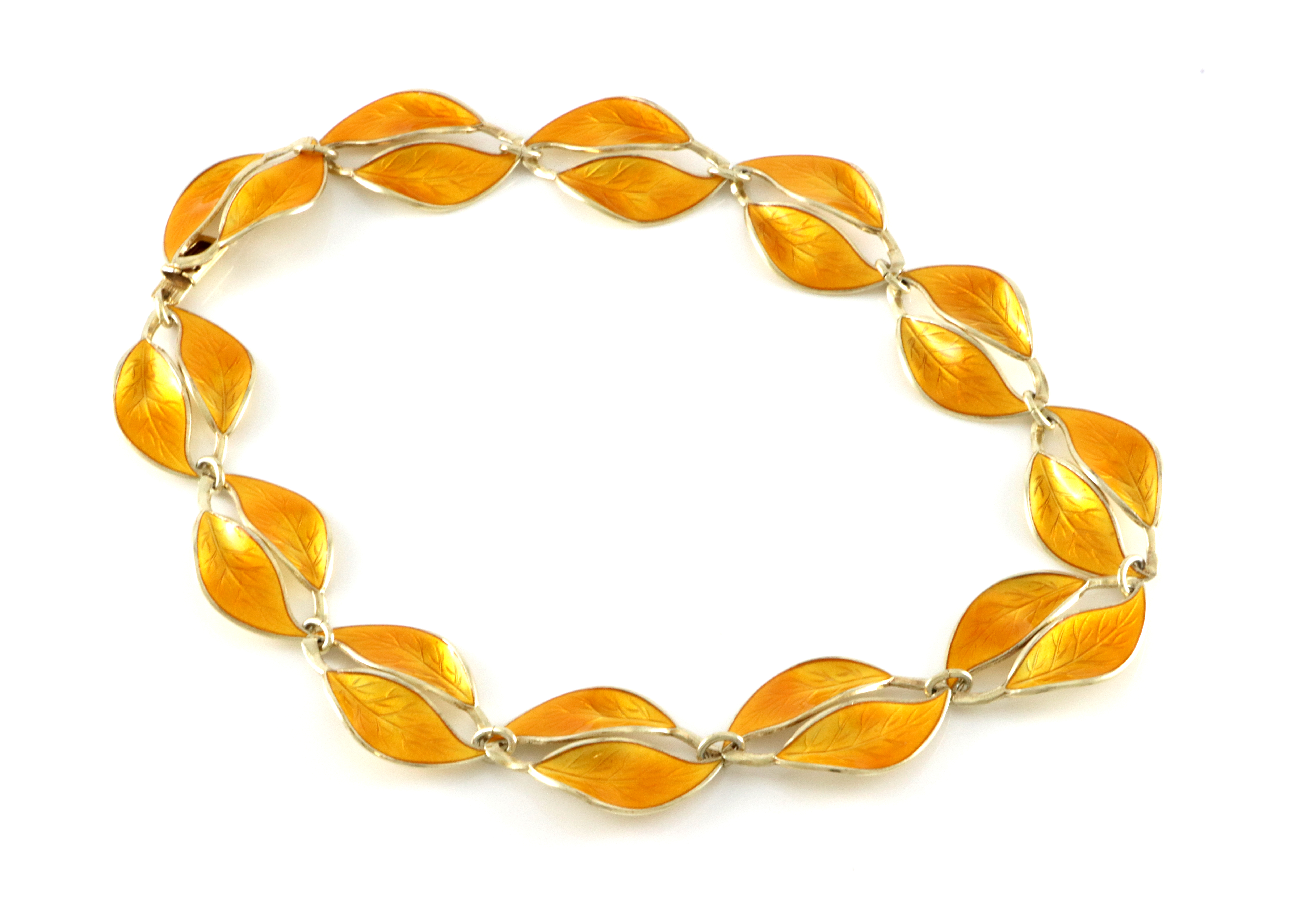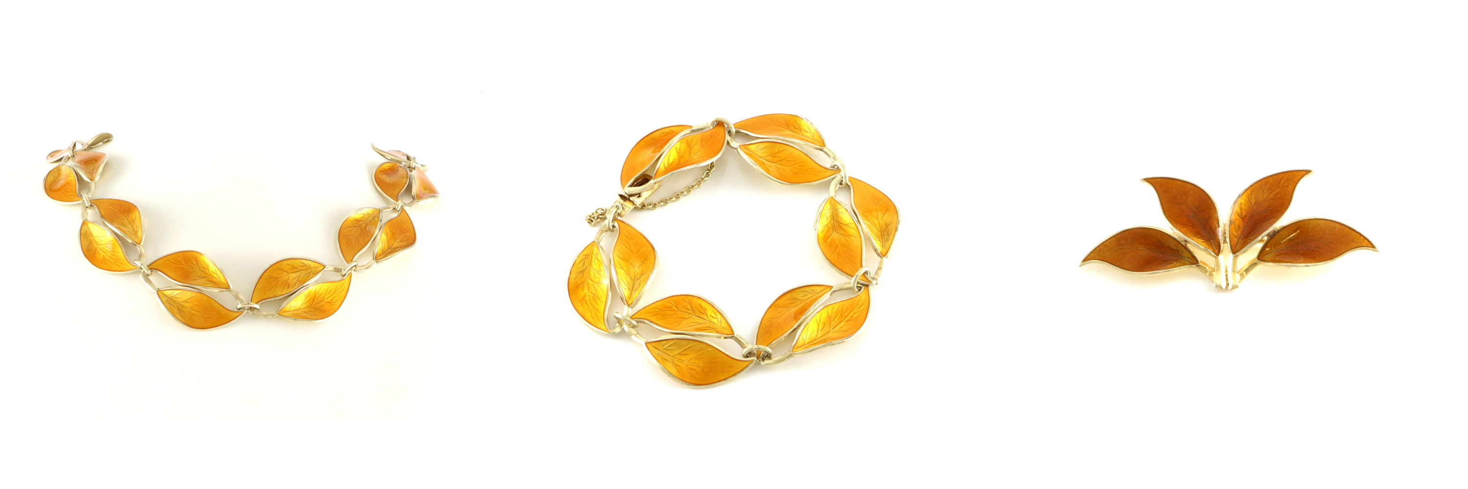 Willy Winnæss for David-Andersen Smykkesett i tre deler: Collier: Bredde: 21 mm Lengde: 39 cm Armbånd: Bredde: 21 mm Lengde: ca 20 cm Sikkerhetslenke Brosje: 65 x 30 mm (er kanskje litt mer brunlig i fargen enn resten av settet) Alle delene er i god stand