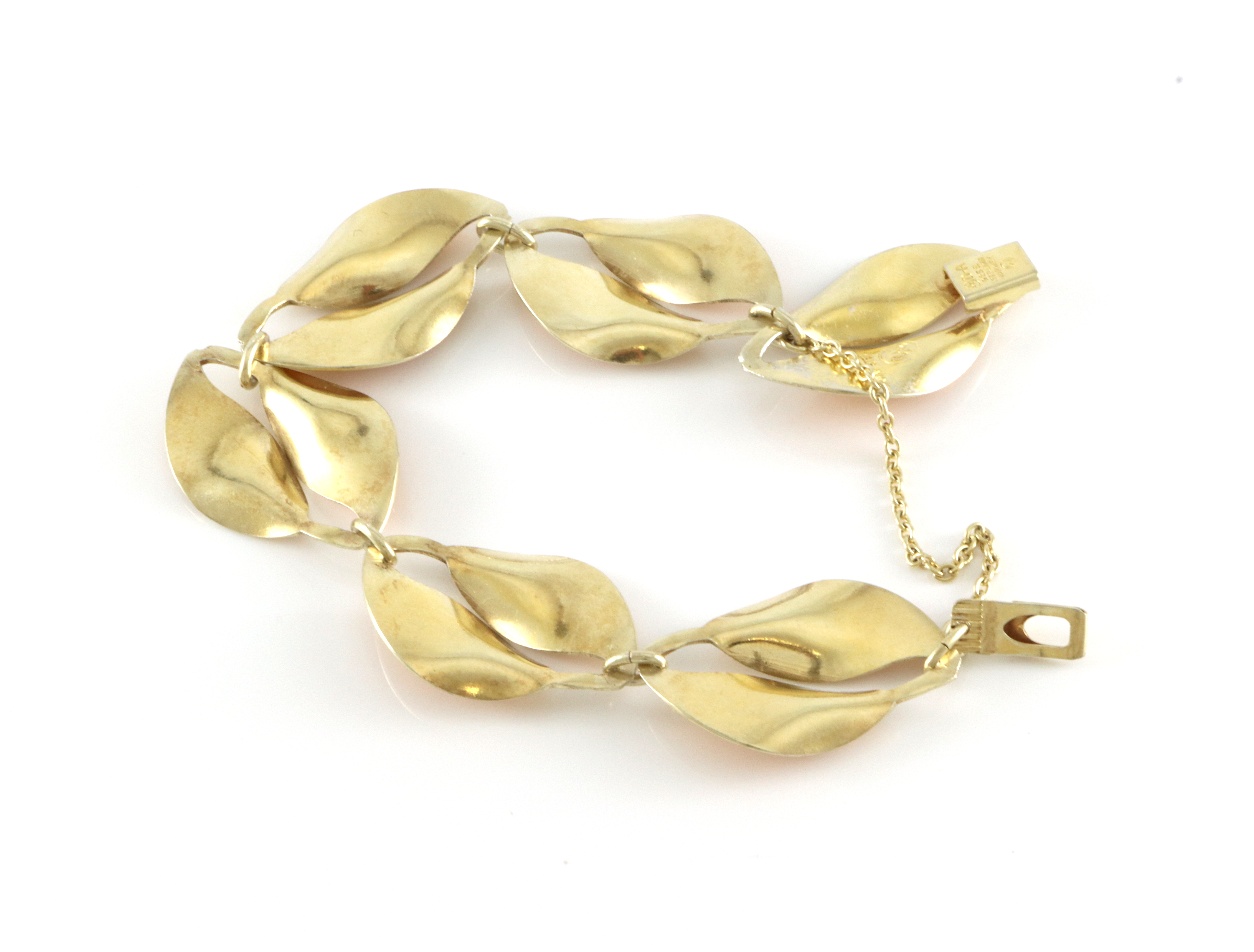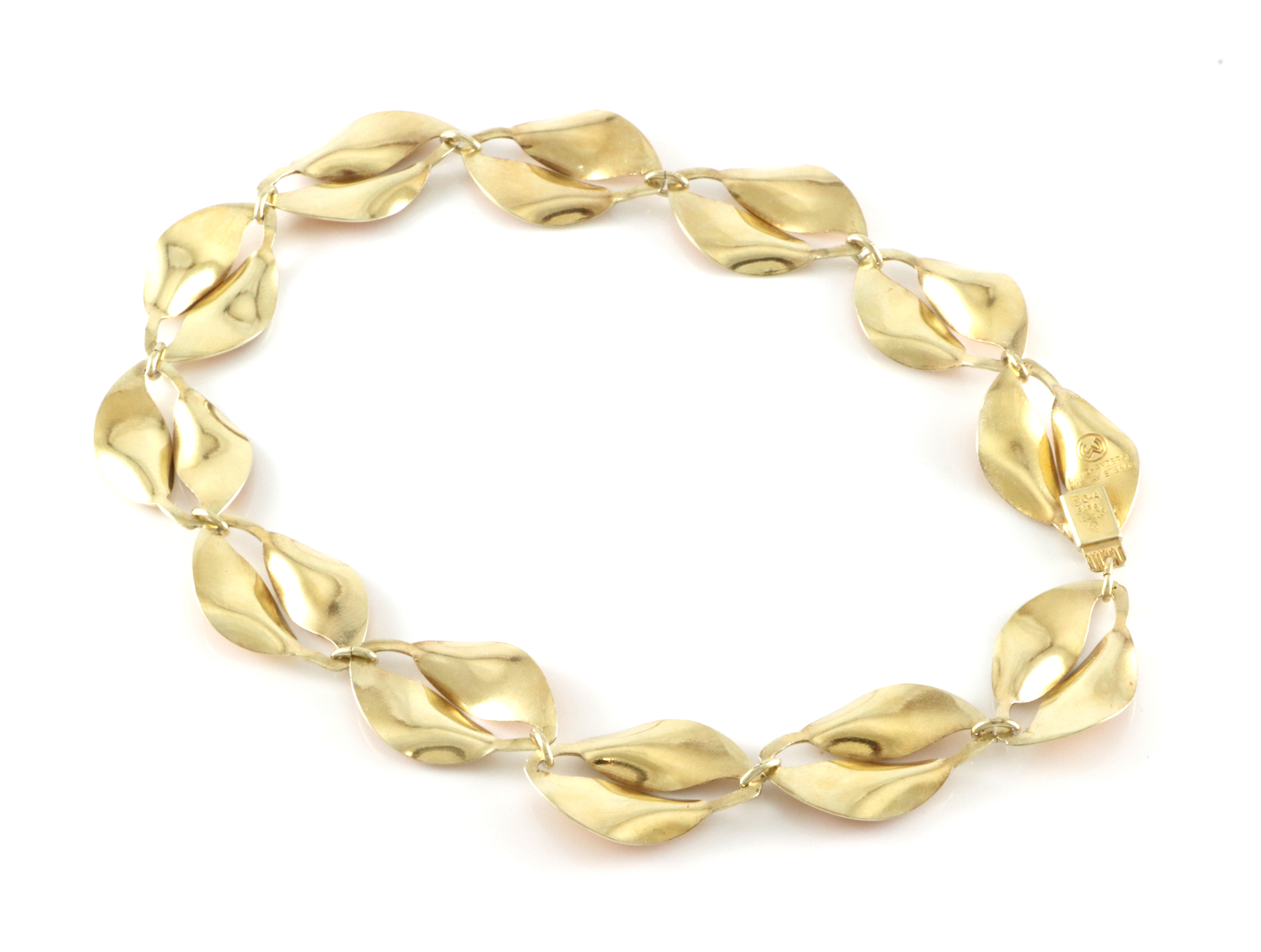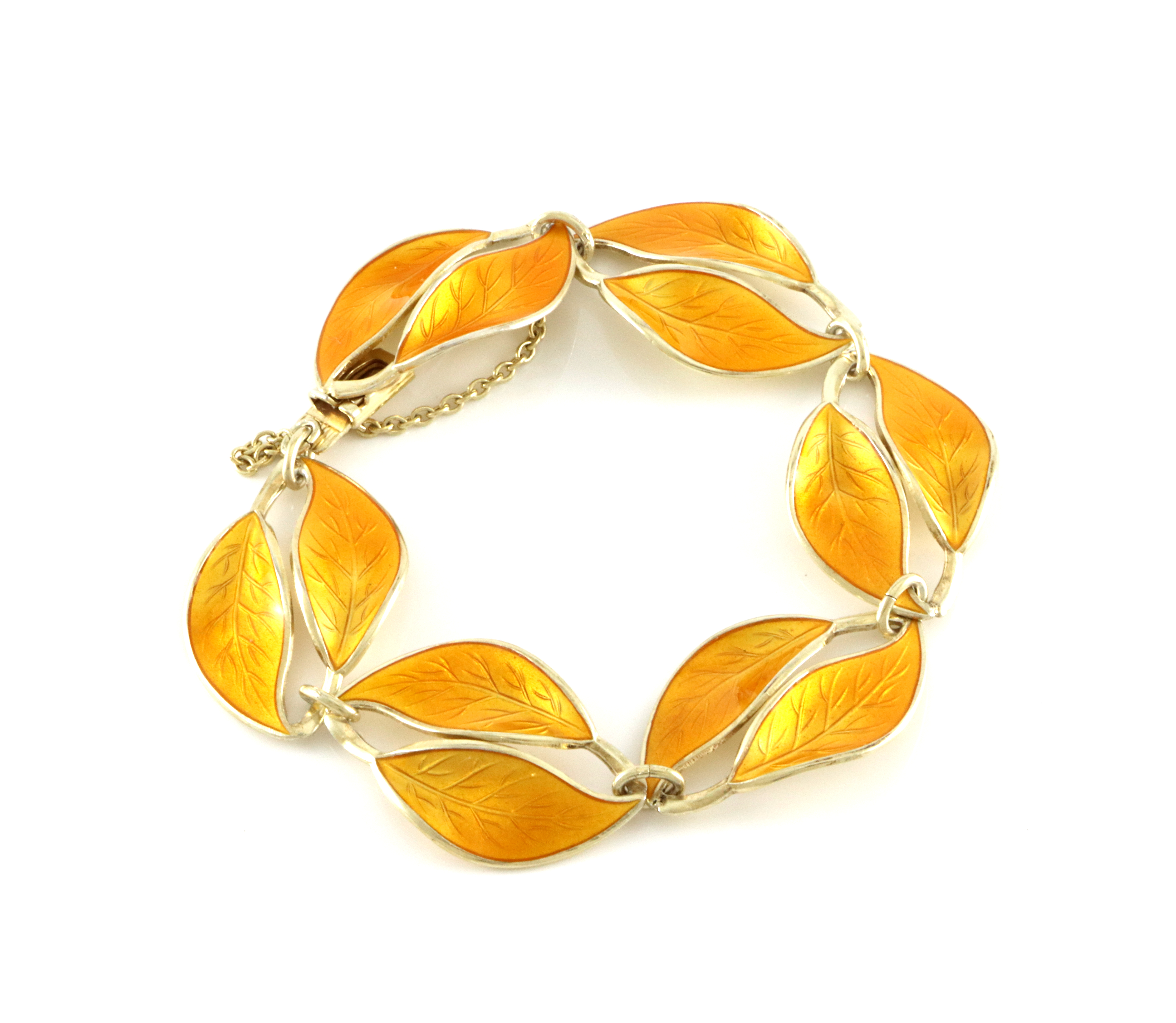 Willy Winnæss for David-Andersen Smykkesett i tre deler: Collier: Bredde: 21 mm Lengde: 39 cm Armbånd: Bredde: 21 mm Lengde: ca 20 cm Sikkerhetslenke Brosje: 65 x 30 mm (er kanskje litt mer brunlig i fargen enn resten av settet) Alle delene er i god stand