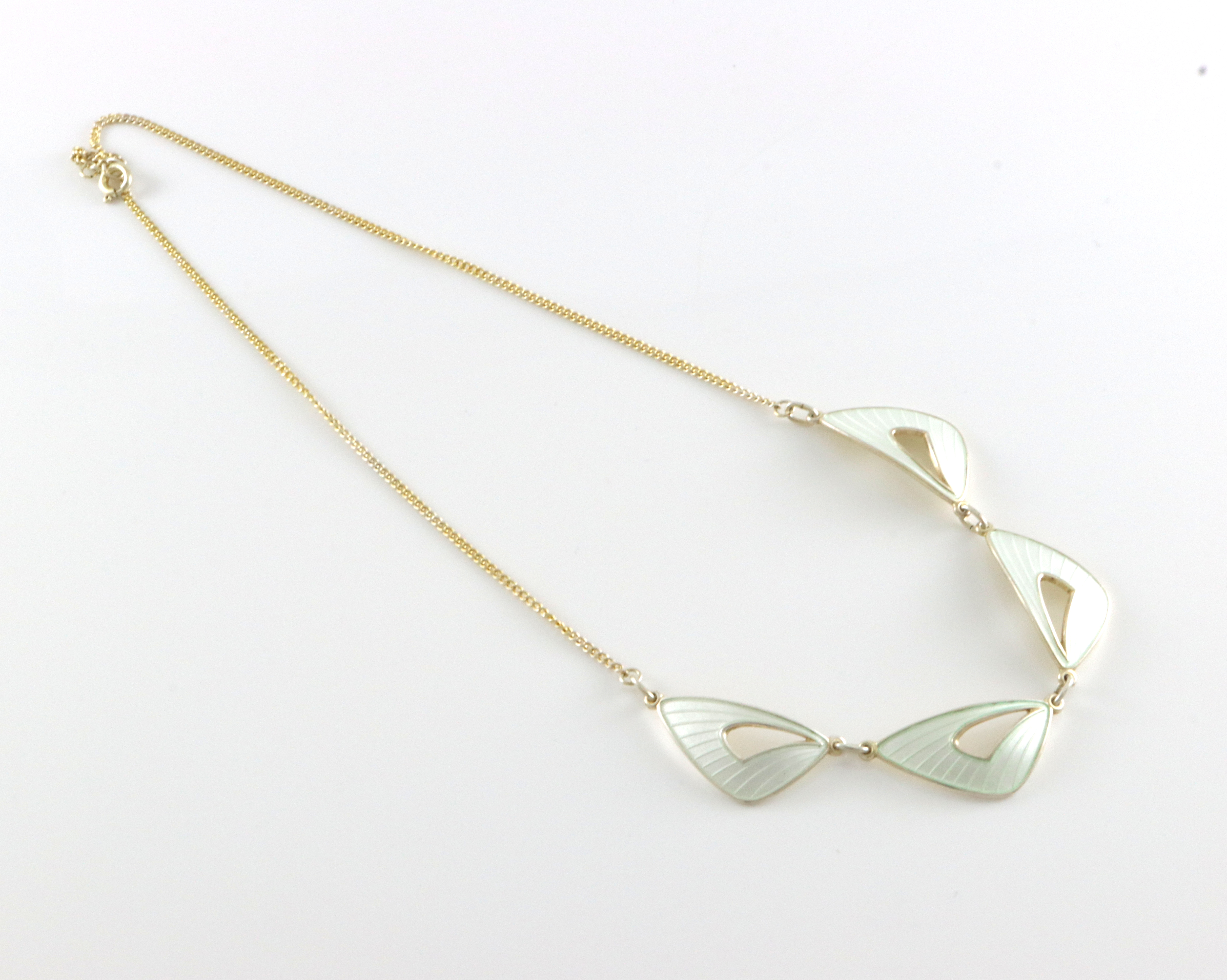 Halskjede i forgylt sølv med hvit emalje. Produsert av Ivar T Holth. Ca 42,0 cm langt, leddene er ca 1,3 cm bred.