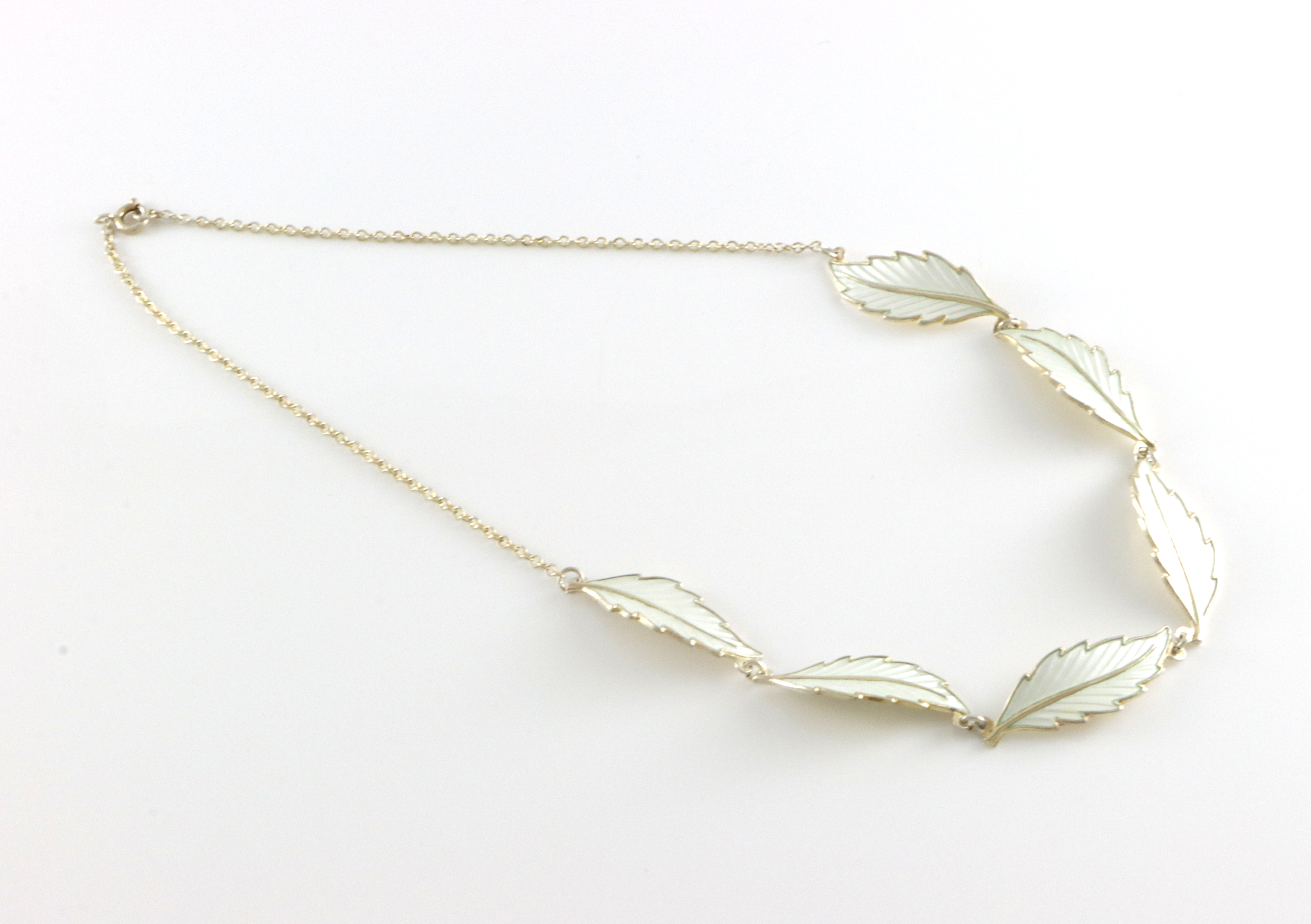 Halskjede i forgylt sølv med hvit emalje. Produsert av Bernhard Meldahl. Halskjedet er ca 40,0 cm langt og leddene er ca 1,1 cm bred.