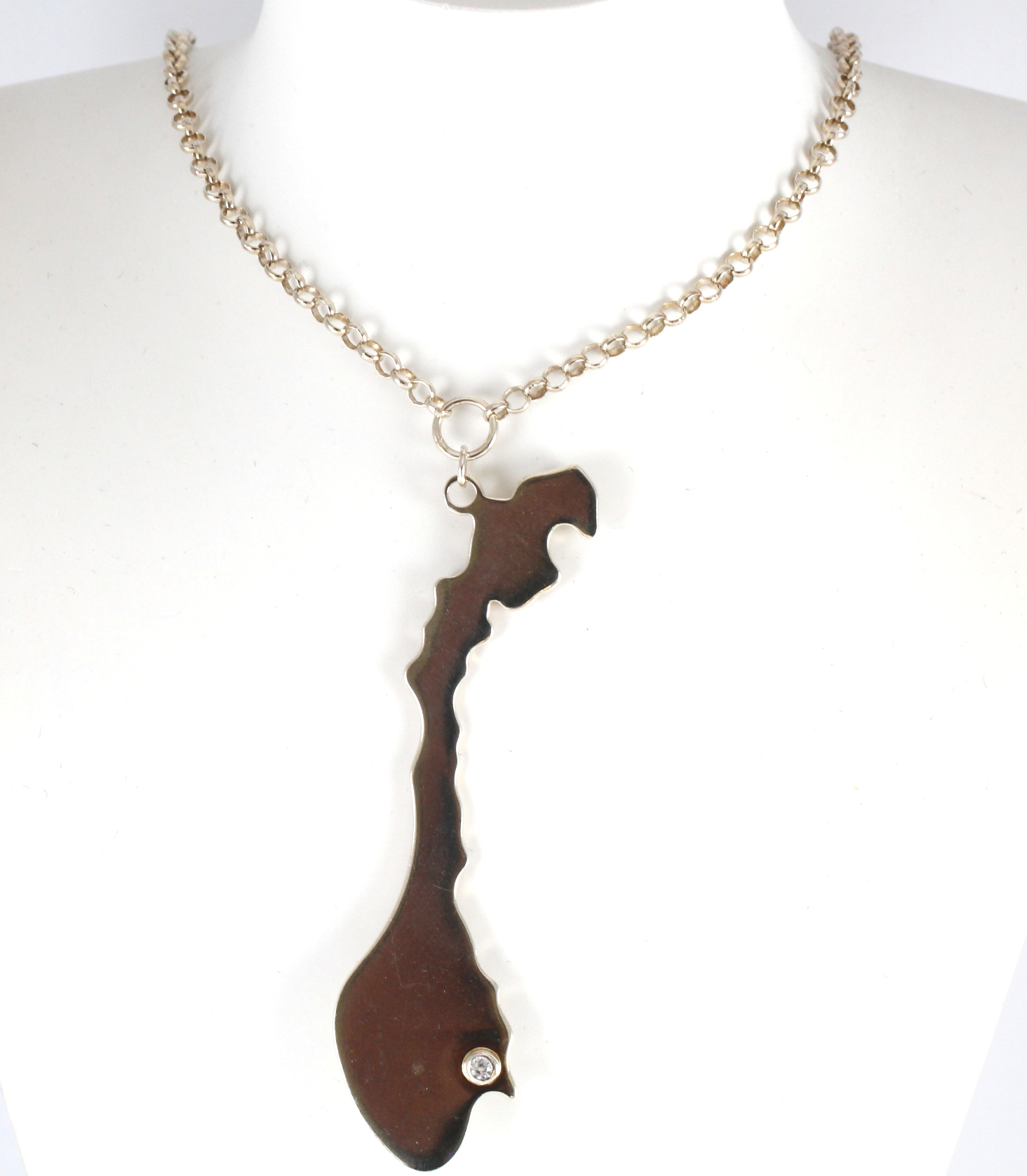 Tøft anheng og kjede med Norgeskartet. Produsert av Celine Engelstad. Anhenget er ca 7,8 cm langt. Kommer med et langt ertekjede,