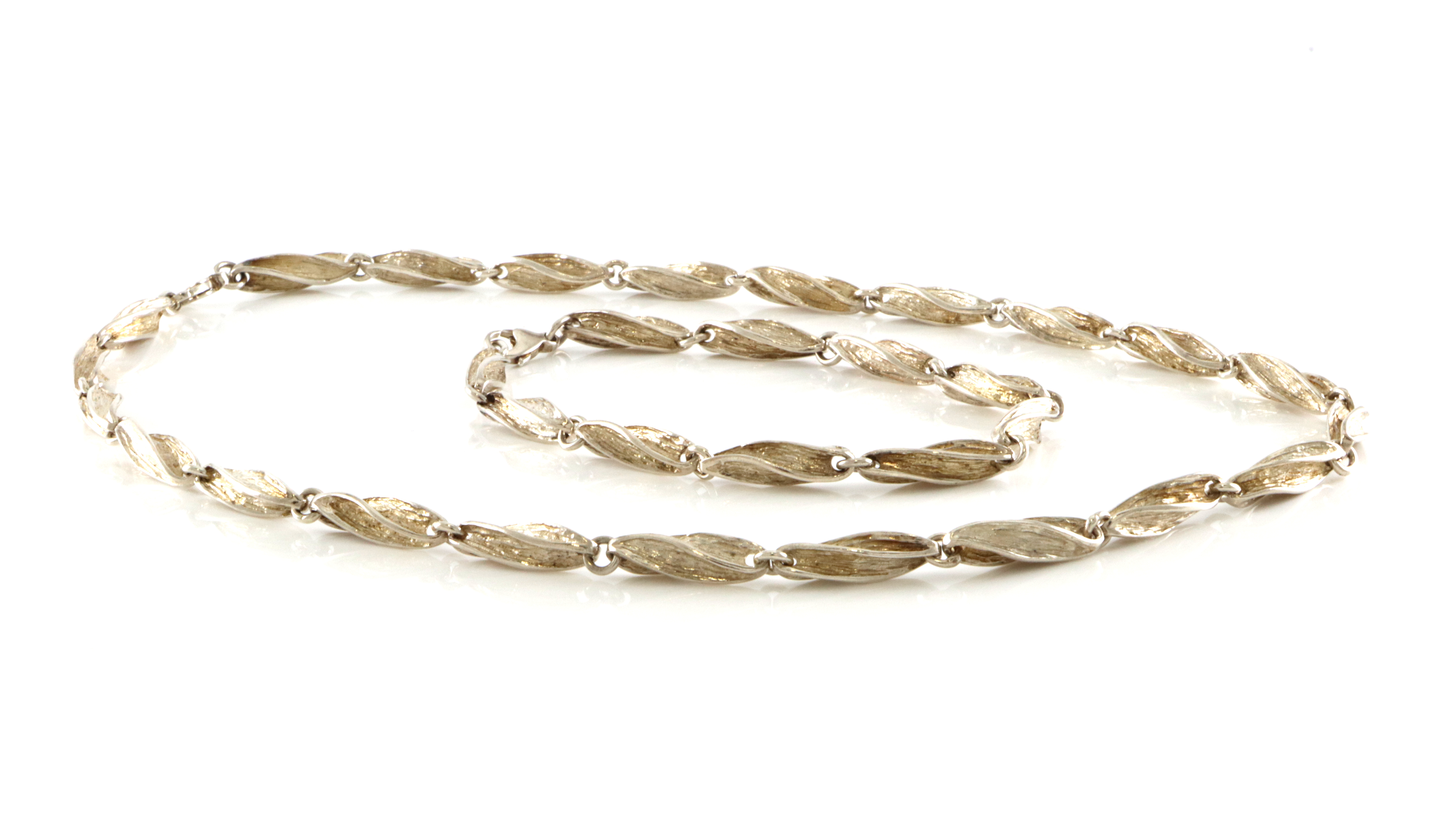 Halskjede og armlenke i sølv. Ukjent mester, kun sølvstempel. Armlenke: Ca 20,0 cm lang og 0,4 cm bred. Halslenke: Ca 41,5 cm lang og 0,4 cm bred.