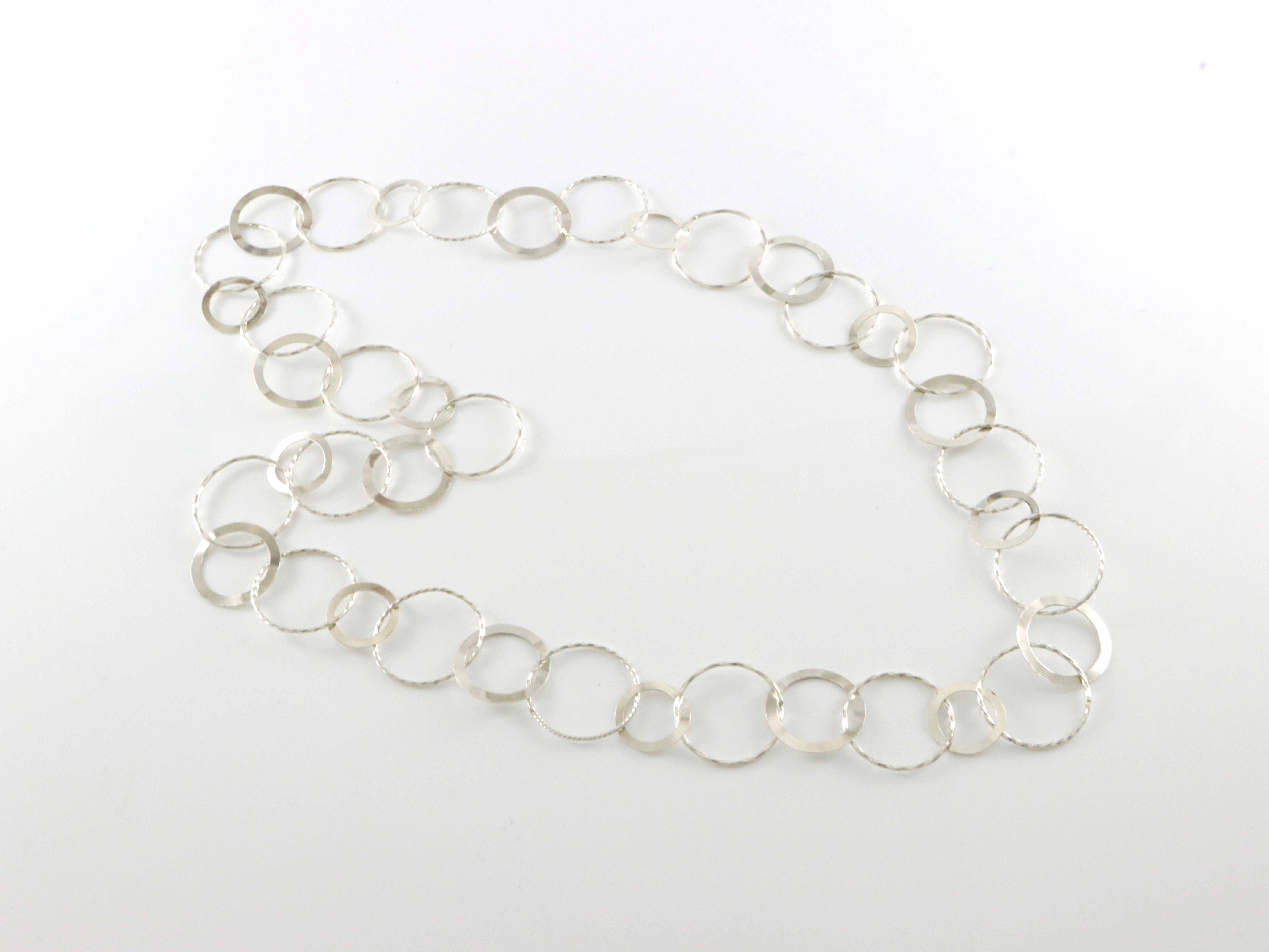 Uten stempler (?) men tester som 925 S Bredde: 22 mm Lengde: ca 75 cm Noen av ringene er noe ujevne