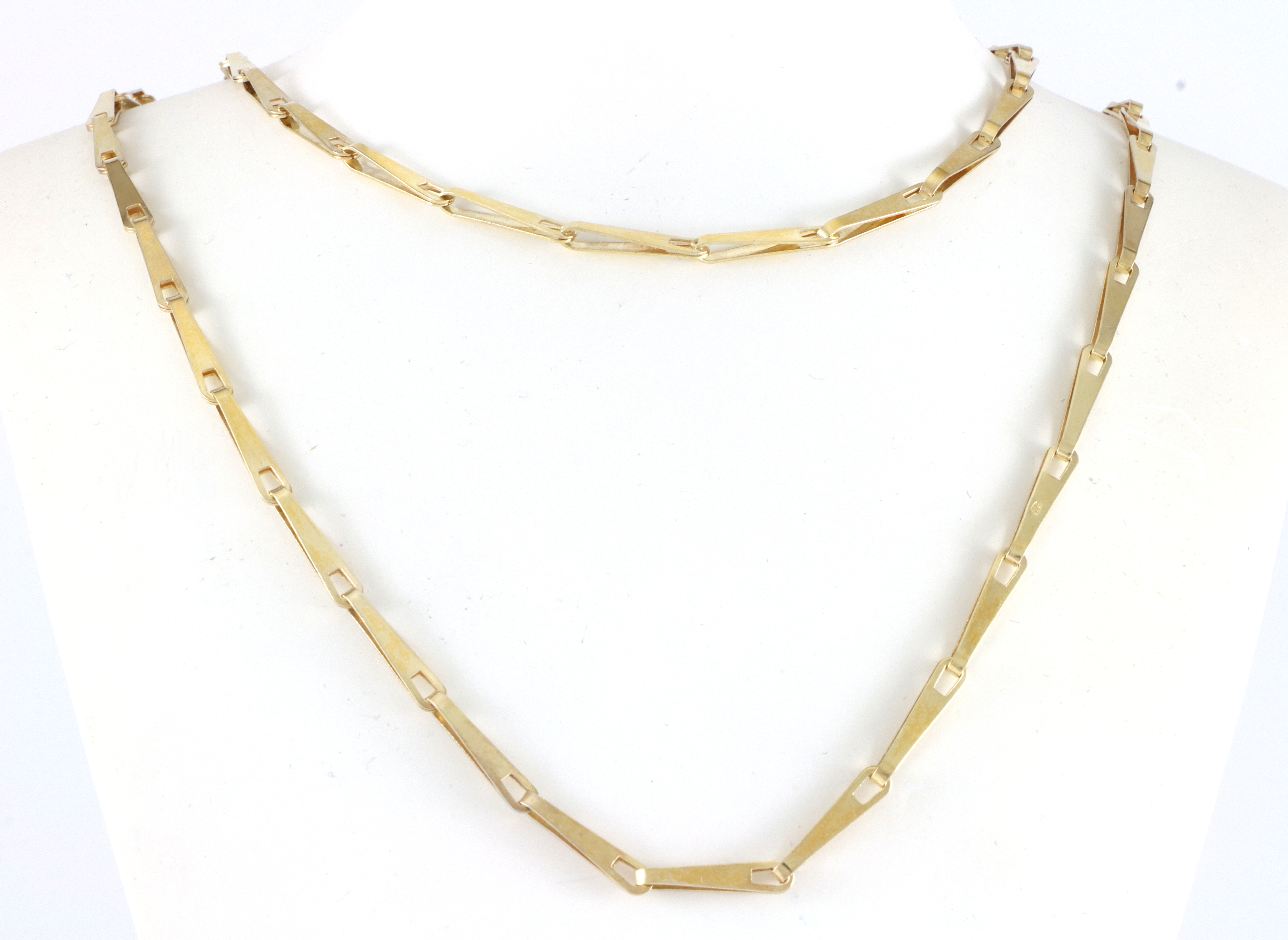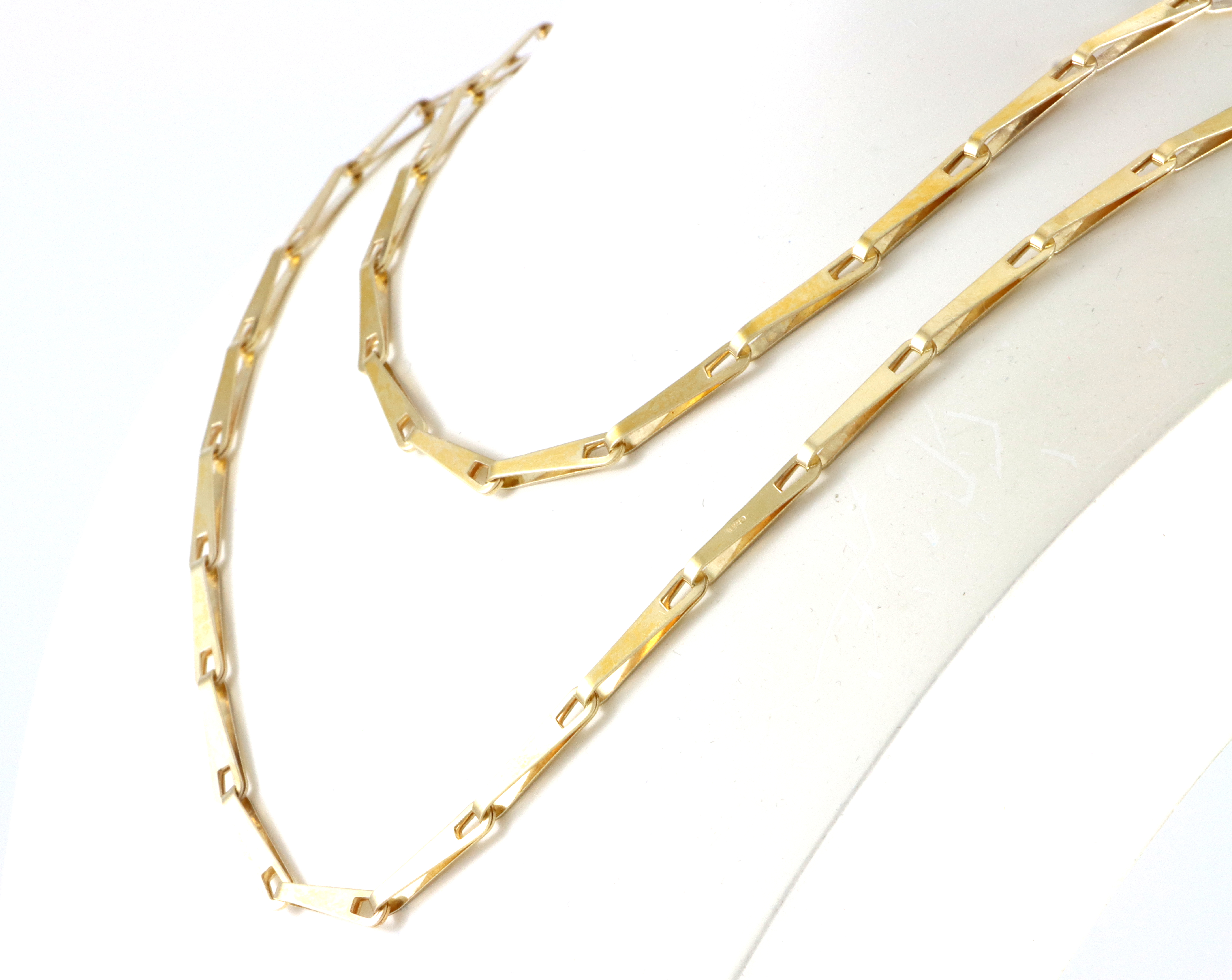 Halskjede i forgyldt sølv, hele 1,6 meter langt. Halskjedet er stemplet David-Andersen, men har også andre stempler så er trolig ikke produsert av dem.