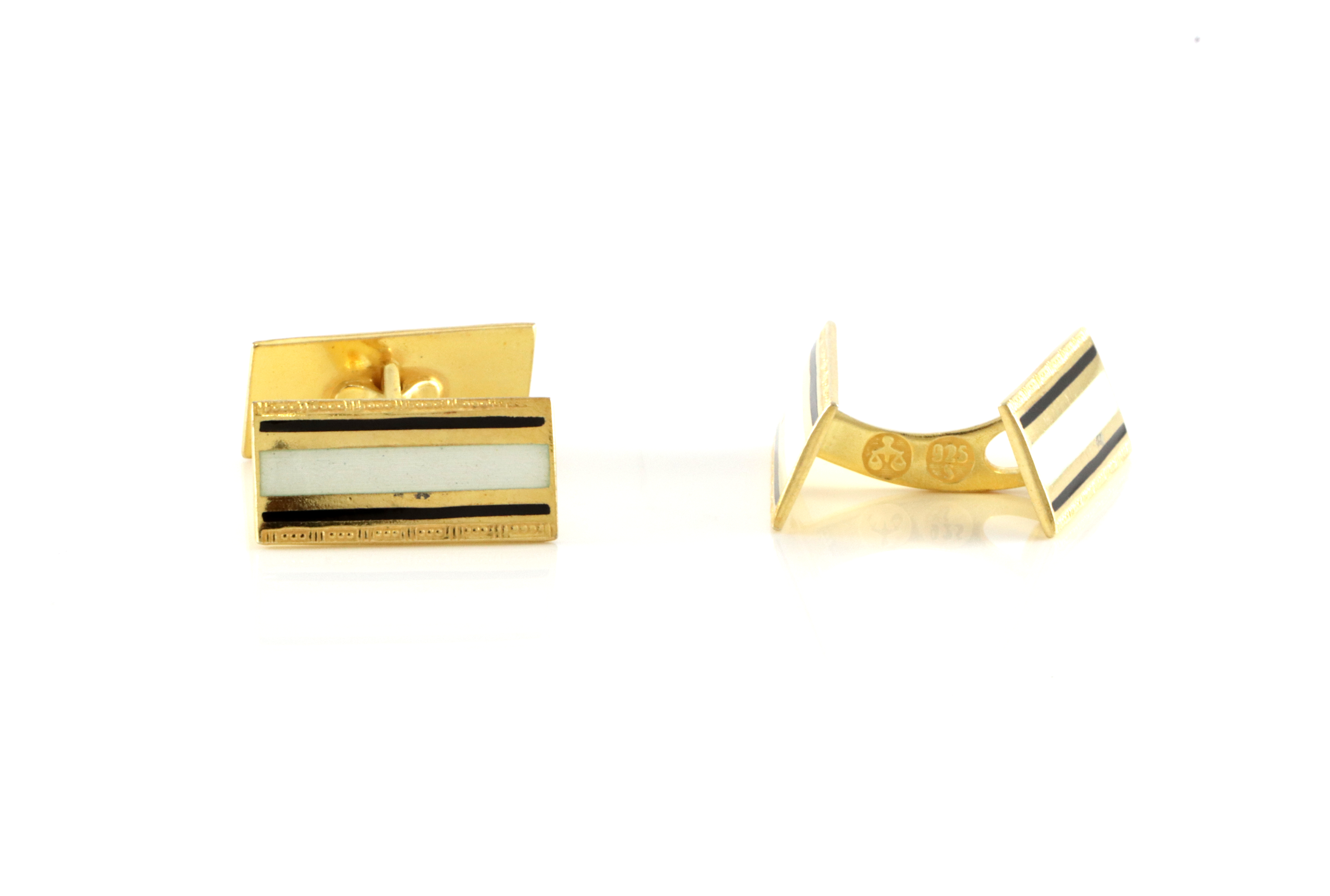 Mansjettknapper med sterk forgylning med hvit og sort emalje. Produsert av David-Andersen. Vanlig type med mønster i den hvite delen. Uvanlig sterk forgylning. Selve "platen" måler 2,0 x 1,0 cm.