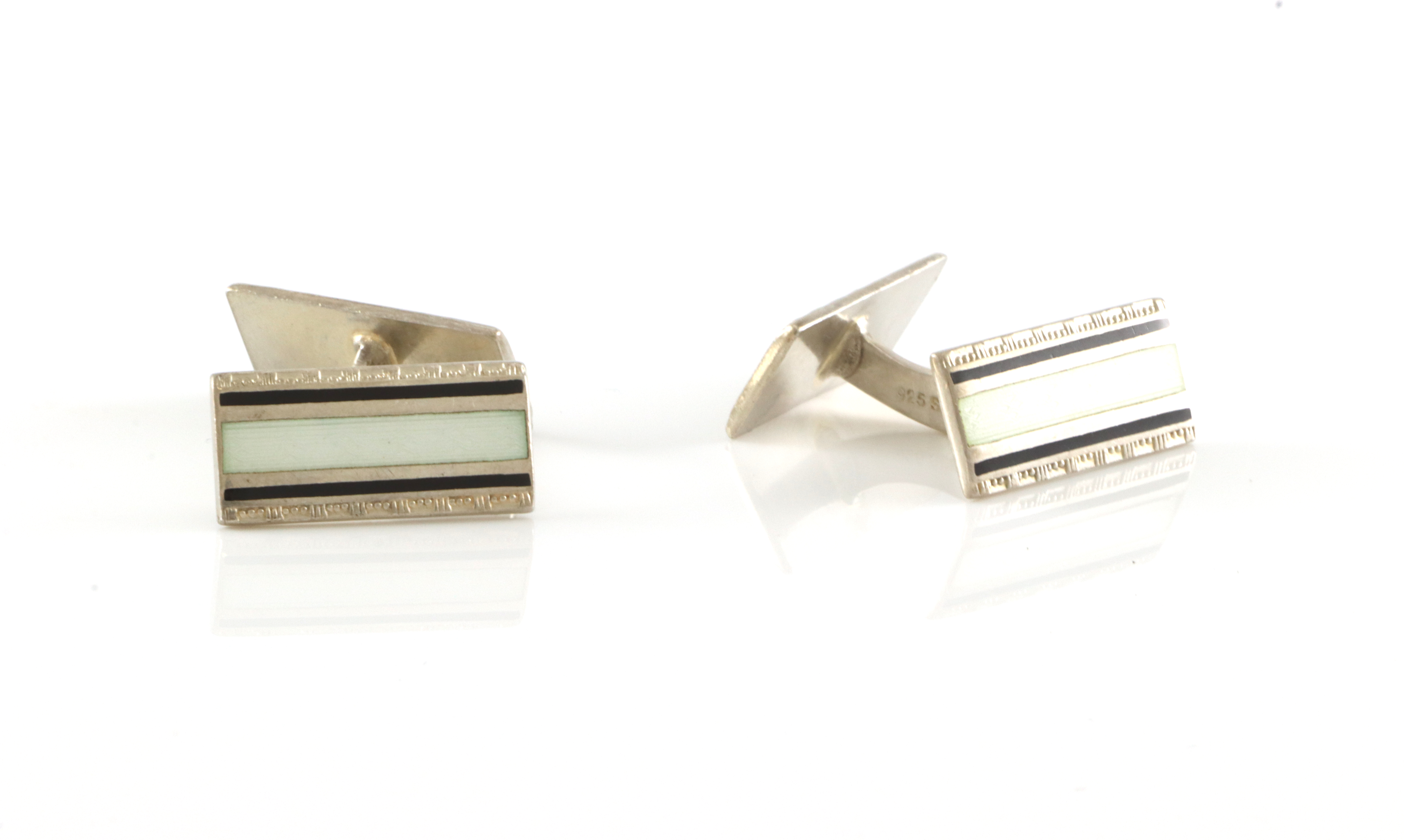 Mansjettknapper i lett forgylt sølv med hvit og sort emalje. Produsert av David-Andersen (Med ildtangstempel, deres eldste stempel) Lett forgylt, type med mønster i den hvite delen. Selve "platen" måler 2,0 x 1,0 cm