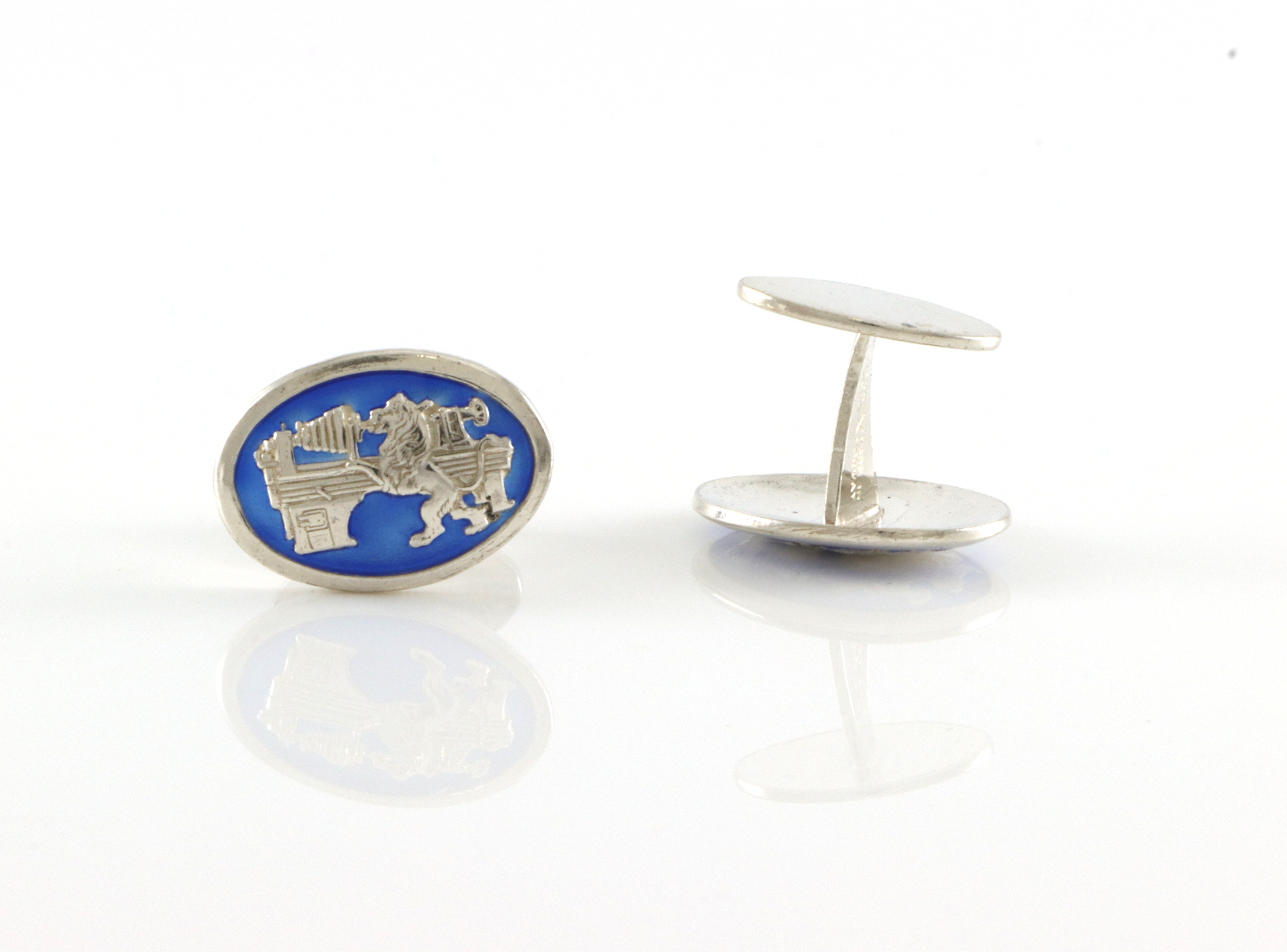 Mansjettknapper i sølv med blå emalje Logo til lag eller forening. Noe bortfall i emaljen Produsenten er ukjent for oss 2,0 x 1,4 cm