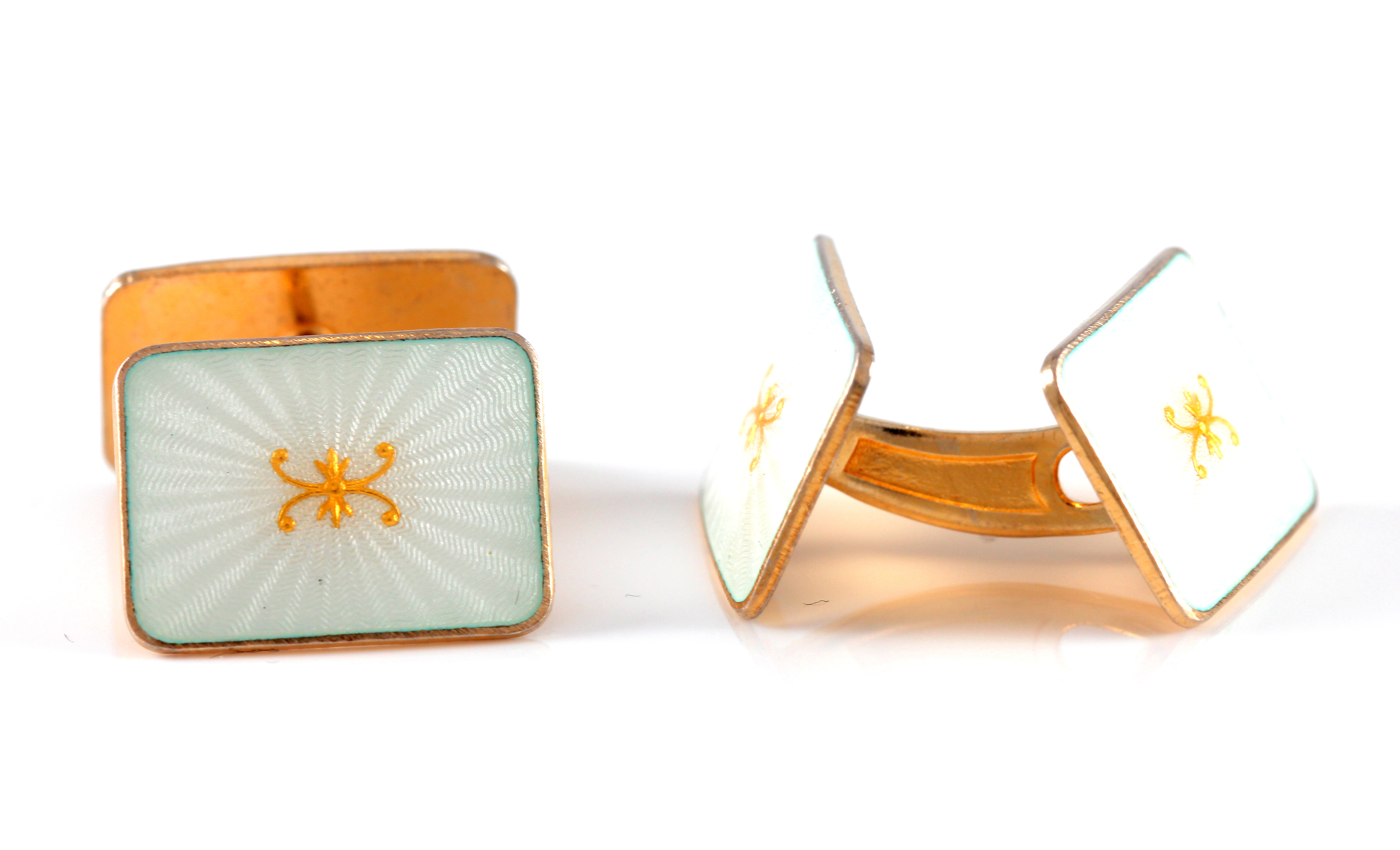 Forgyldt sølv, hvit emalje med gulldetaljer. Platen er 1,8 x 1,3 cm