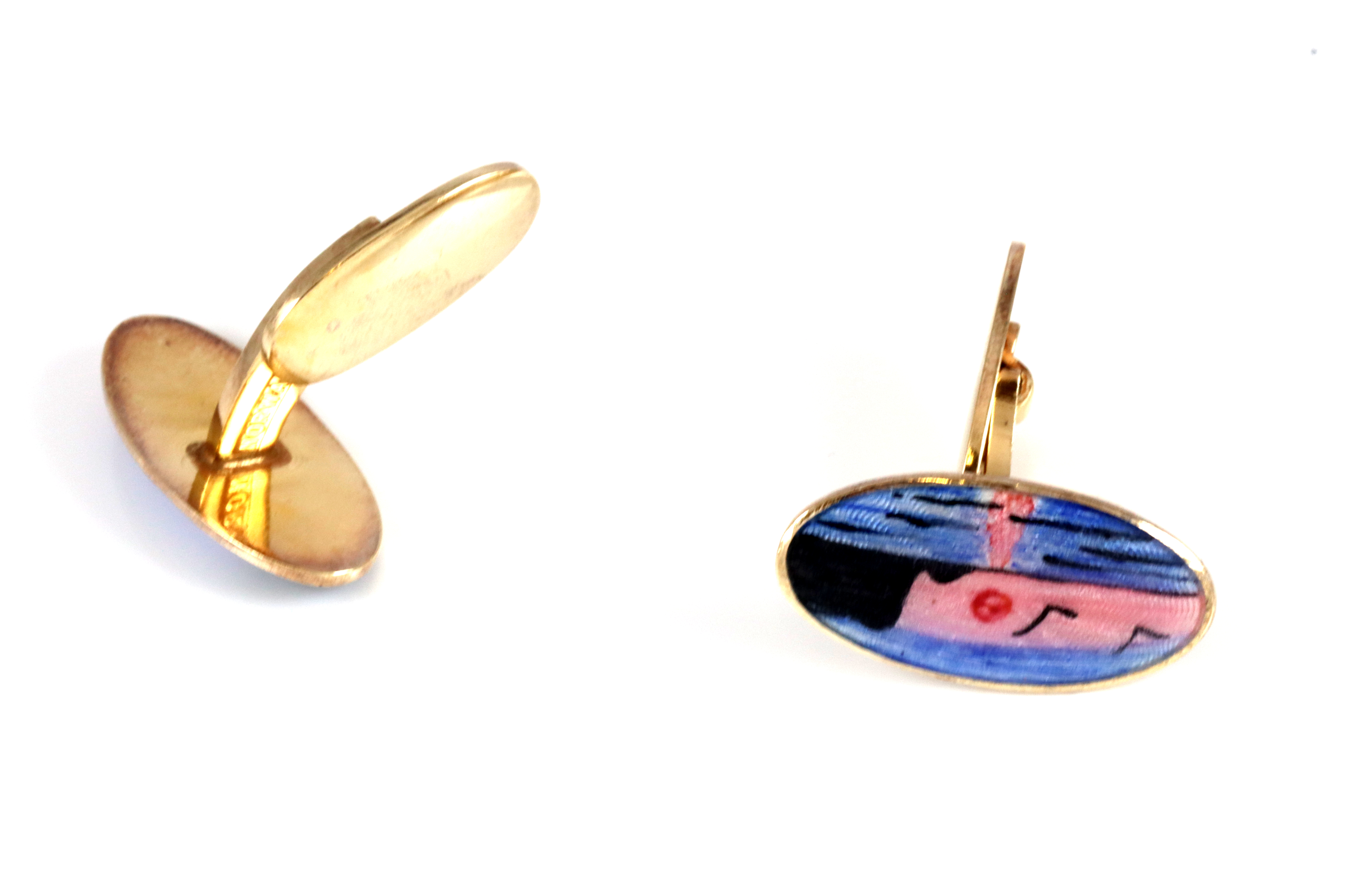 Flotte mansjettknapper i flerfarget emalje og forgyldt sølv. Produsert av David-Andersen. Motivet er fra Nordkapp