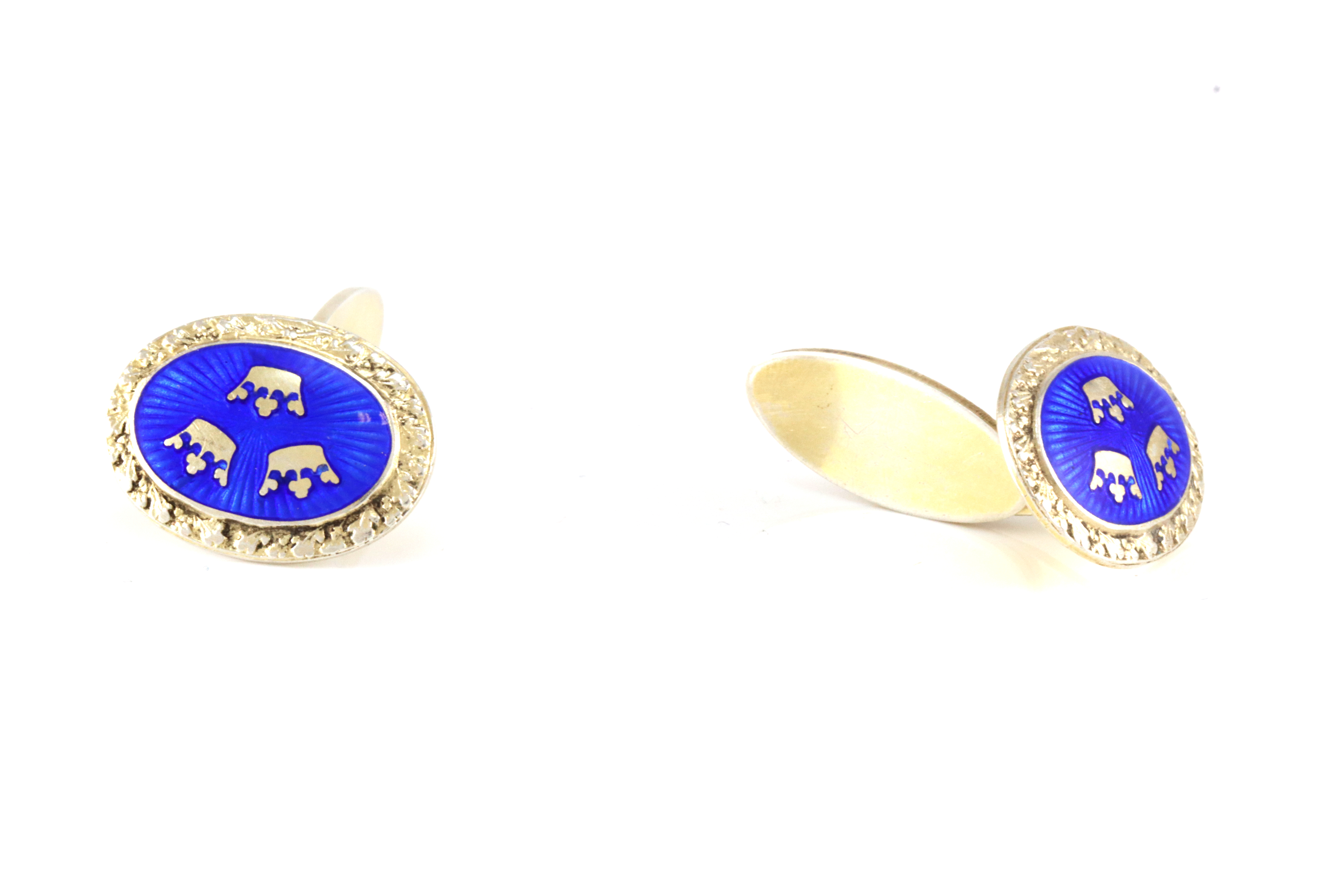 Flotte mansjetterknapper i forgyldt sølv og blå emalje. Motivet er de svenske kronene, merket Y8 som betyr at de er produsert i 1949. 1,9 x 1,4 cm