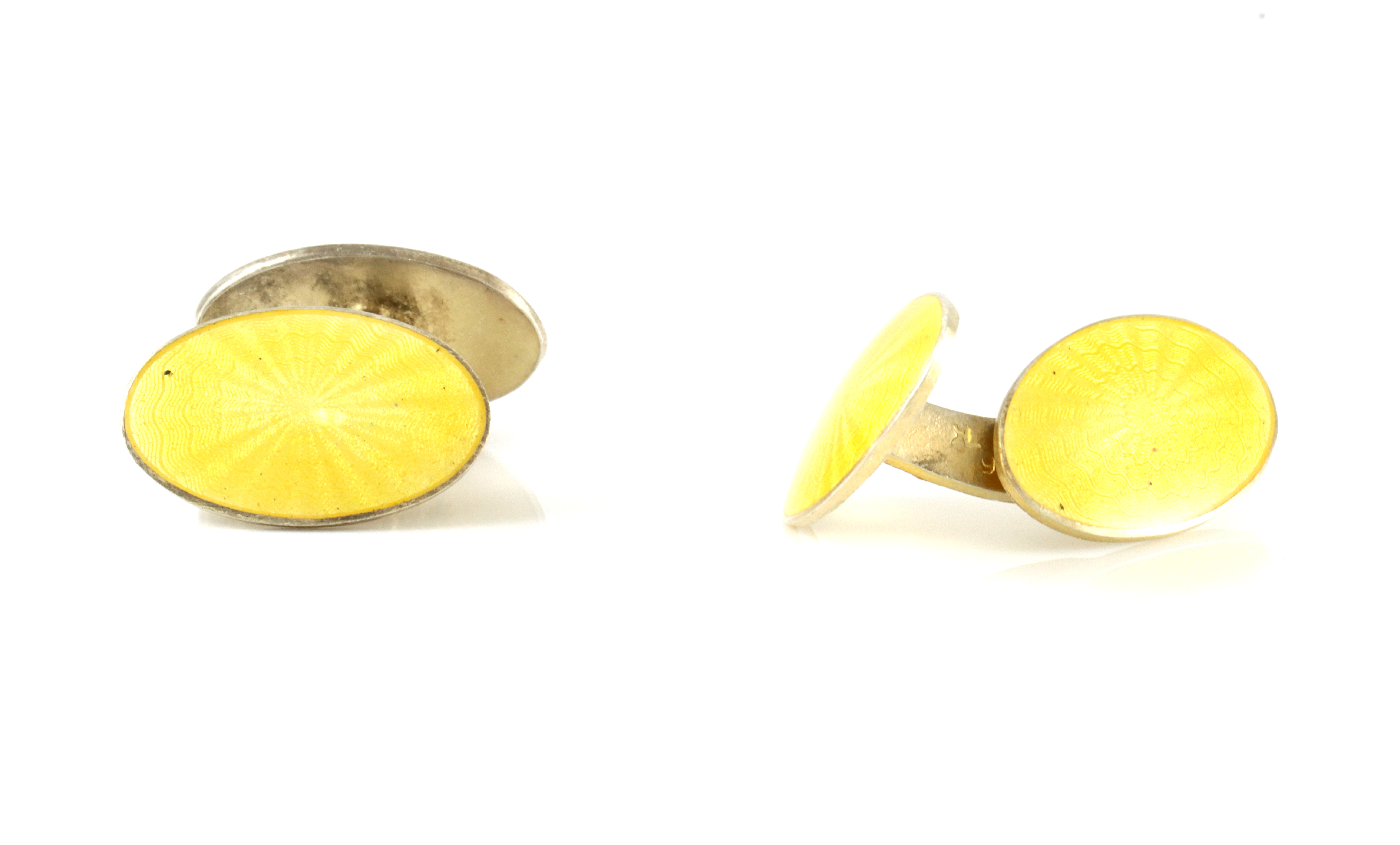 Mansjettknapper i forgylt sølv og gul emalje. Mestermerke er ukjent for oss. Emaljen er helt og pen har noen sorte flekker fra produksjon. Selve platen er 2,1 x 1,3 cm