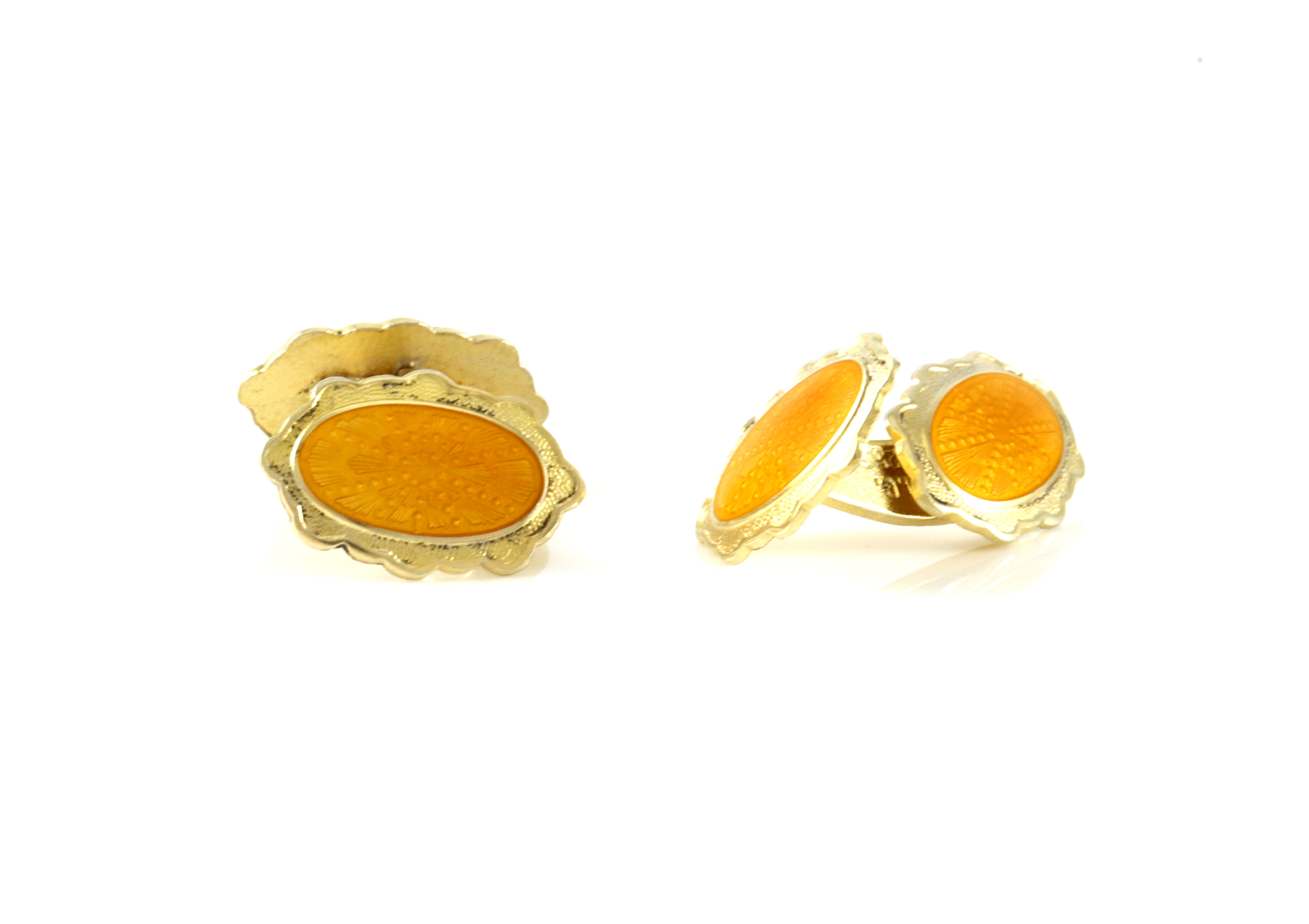 Mansjettknapper i forgylt sølv med orange emalje. Platen er 1,7 x 1,1 cm Mestermerke I.G