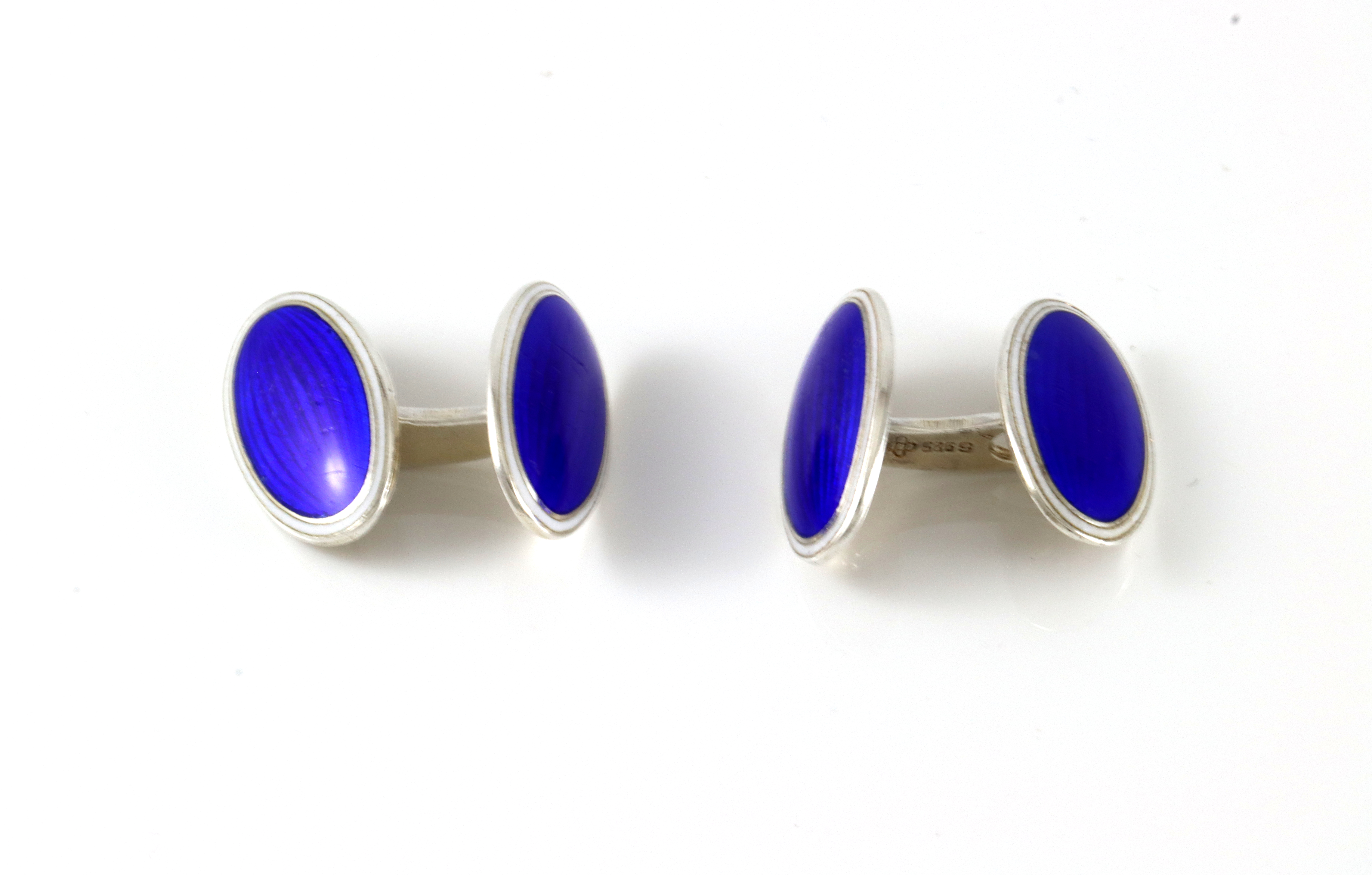 Eldre mansjettknapper i sølv fra Ole Olberg. Blå og hvit emalje. En del bruksriper i emaljen. 2,1 cm