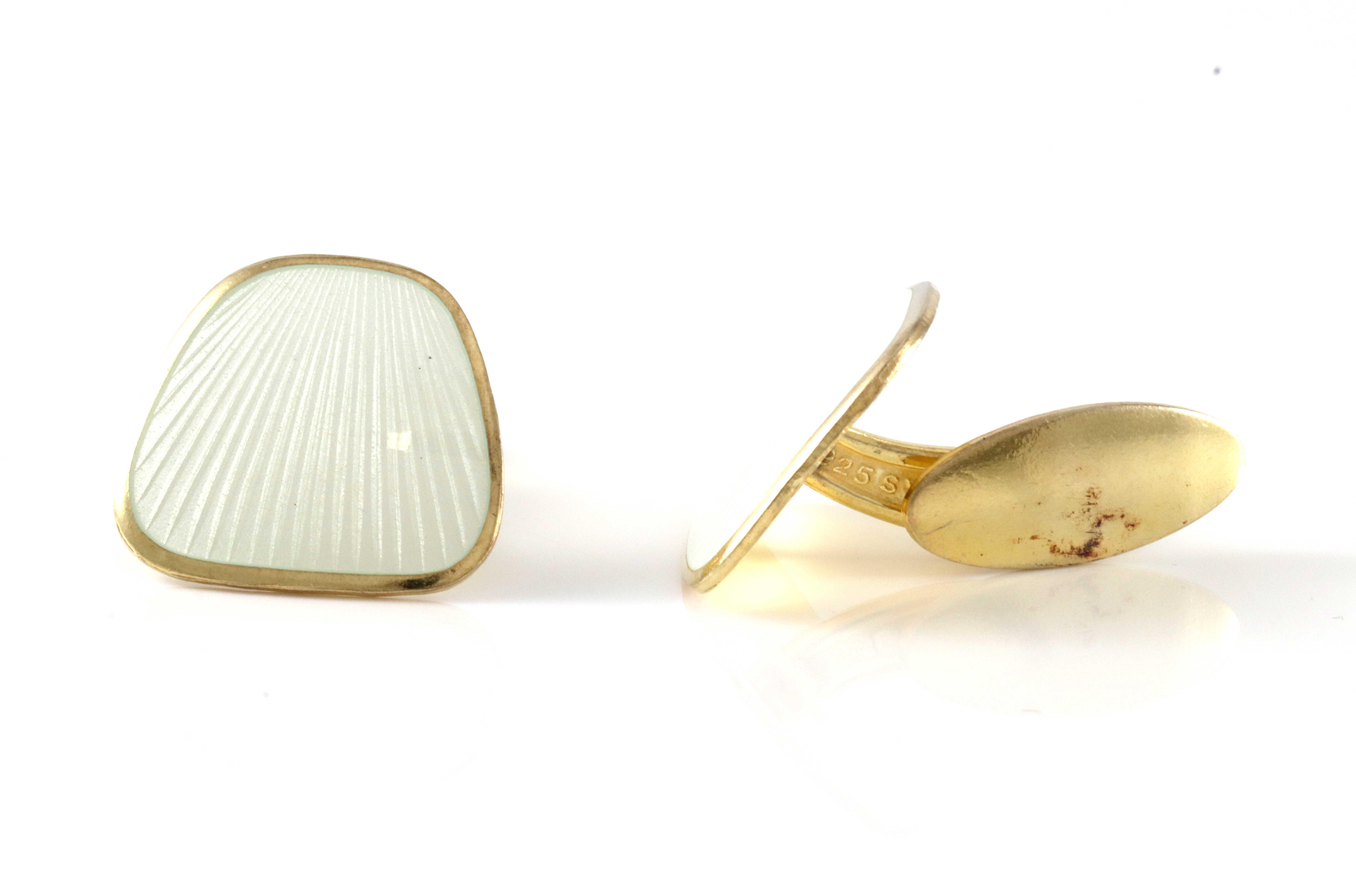 Mansjetterknapper i forgylt sølv og hvit emalje. Produsert av Finn Jensen. 2,0 x 1,8 cm