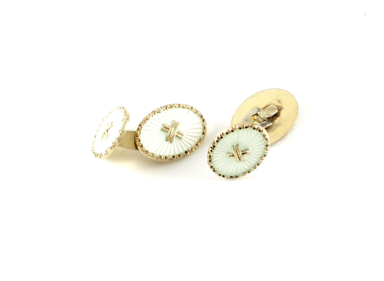 Enkle mansjettknapper i forgylt sølv med hvit emalje. Produsert av Nils Elvik 1,9 x 1,4 cm