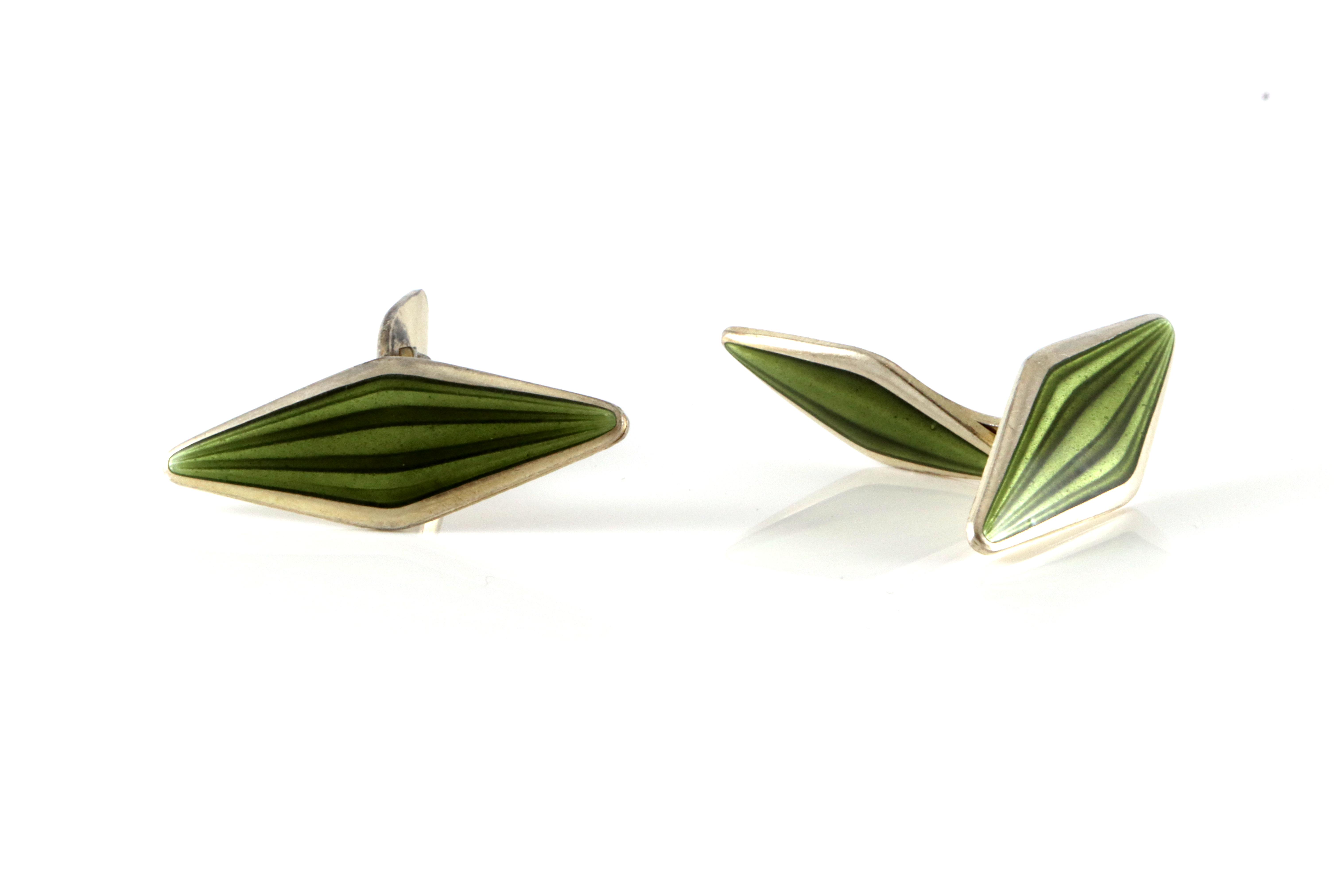 Mansjettknapper i lett forgylt sølv med grønn emalje. Produsert av David-Andersen 35 x 13 mm