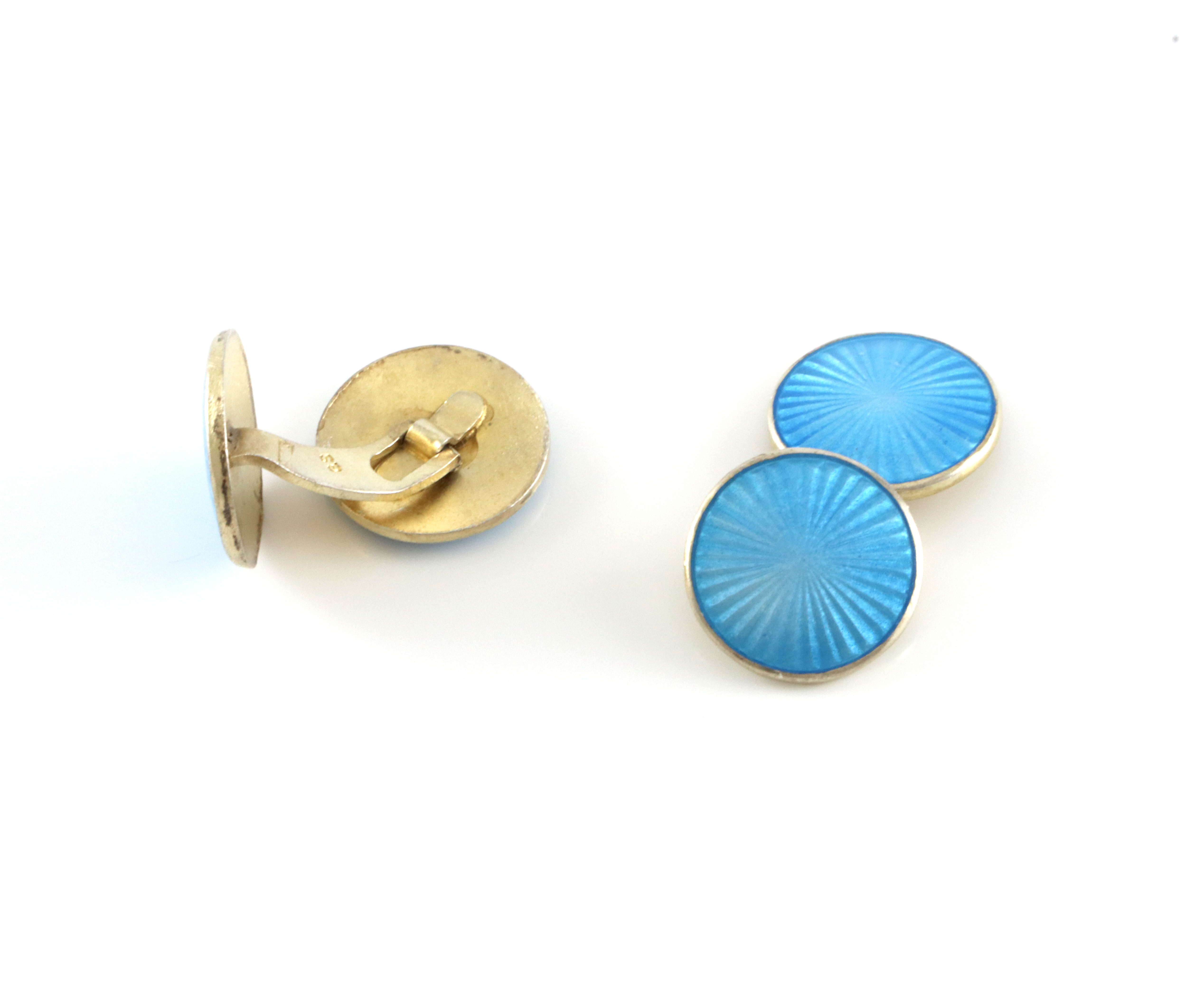 Mansjettknapper i forgylt sølv med lys blå emalje. Mester er ukjent for oss, stemplet G.S. Som ganske ofte på gamle mansjettknapper er "stavene" skjev. Selve "platen" er 1,4 x 1,4 cm