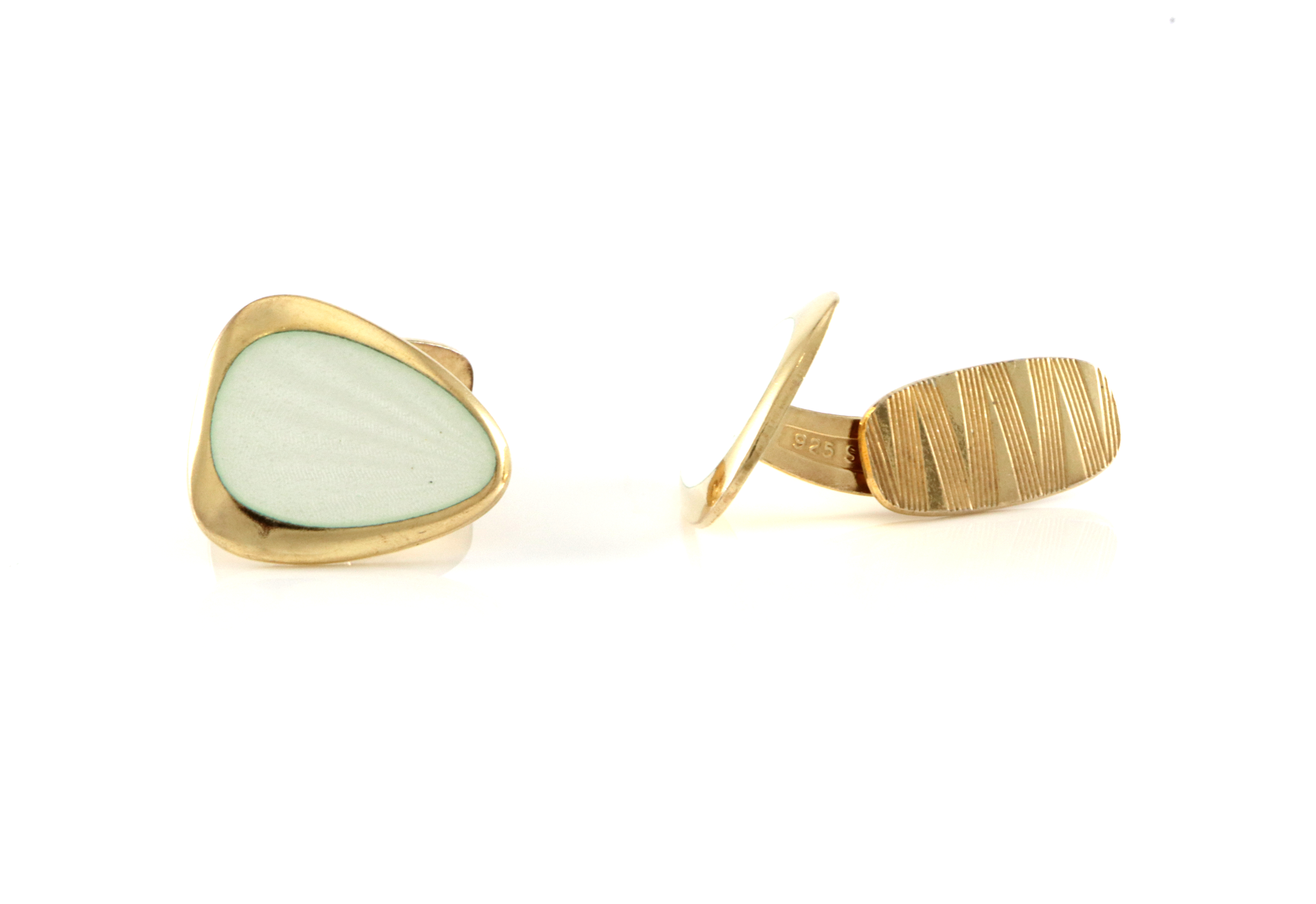 Mansjettknapper i forgylt sølv med hvit emalje. Produsert av Nils Elvik. Selve "platen" måler 2,0 x 1,8 cm