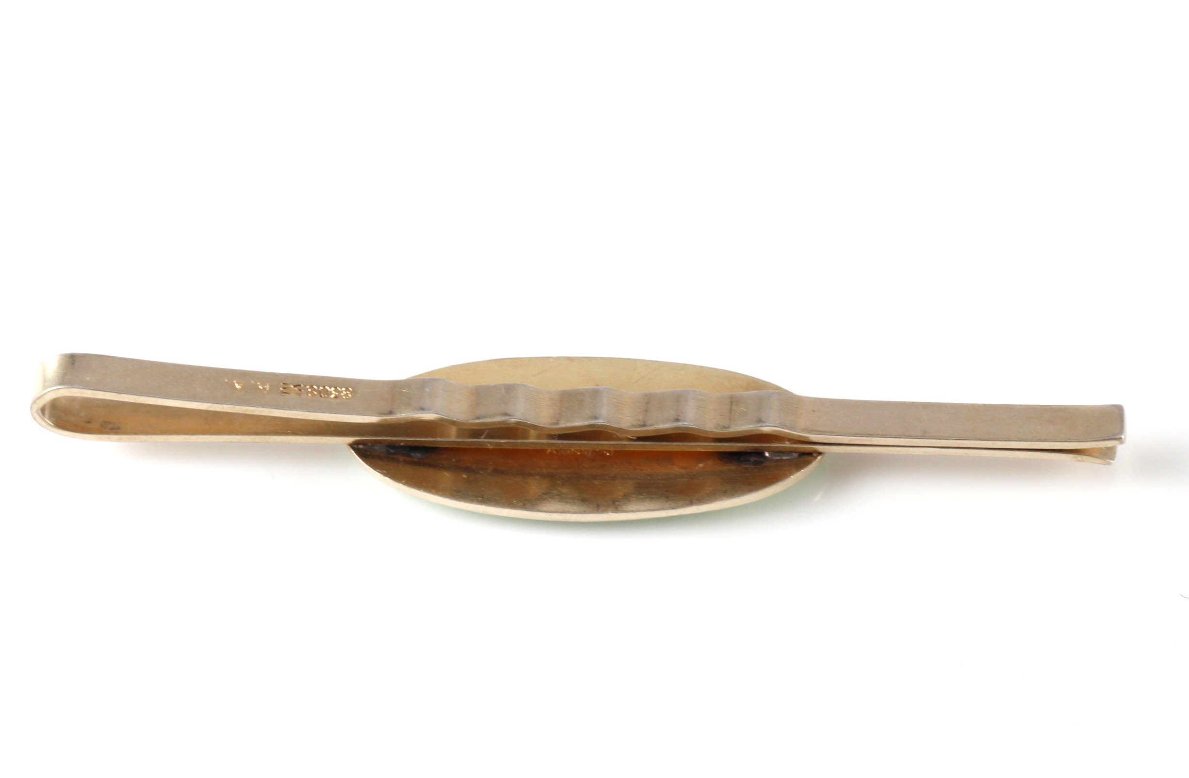 Slipsnål i lys grønn emalje, forgyldt. Produsert av Aksel Holmsen.