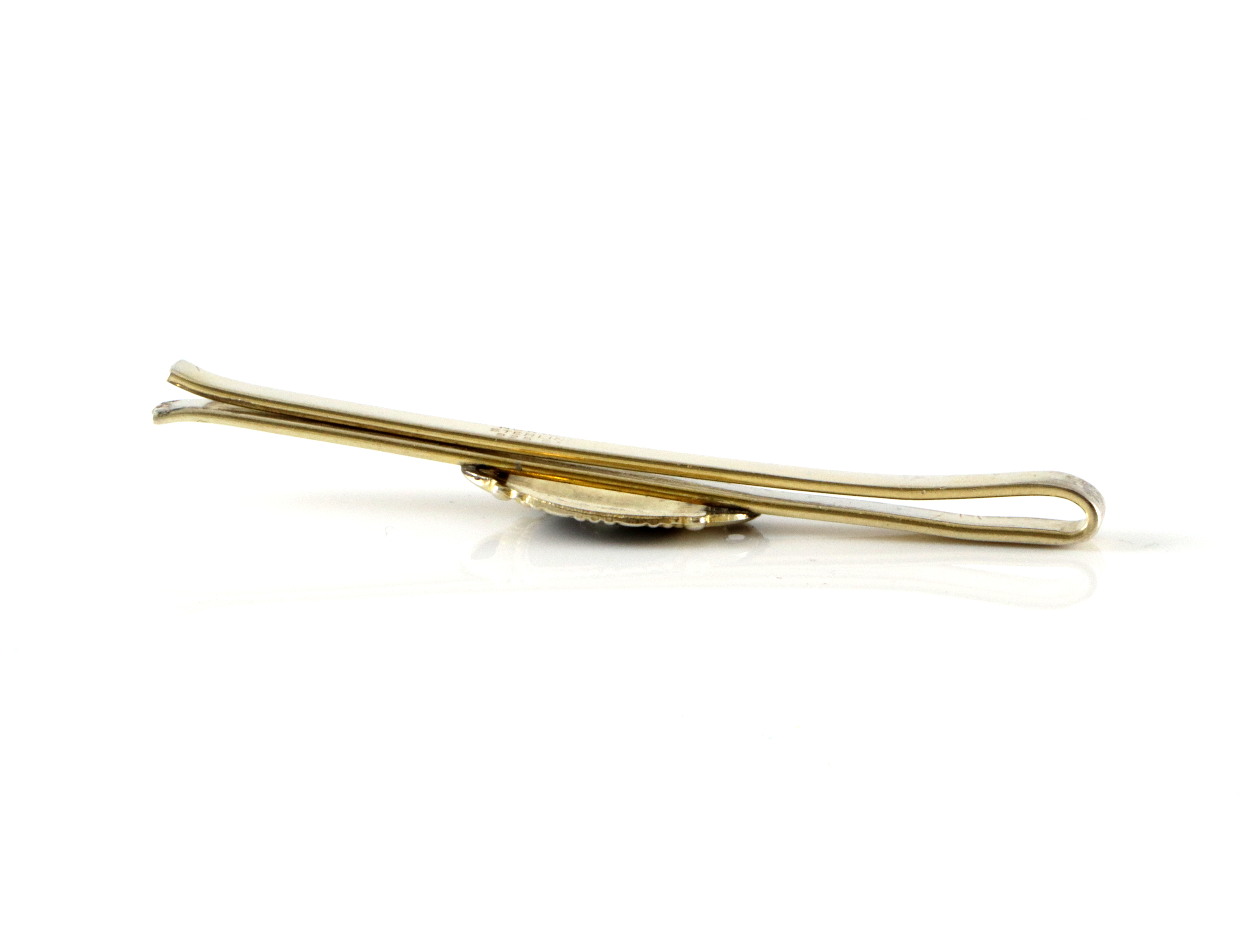 Slipsnål i forgylt sølv med svart og hvit emalje. Produsert av Finn Jensen. 6,5 cm lang