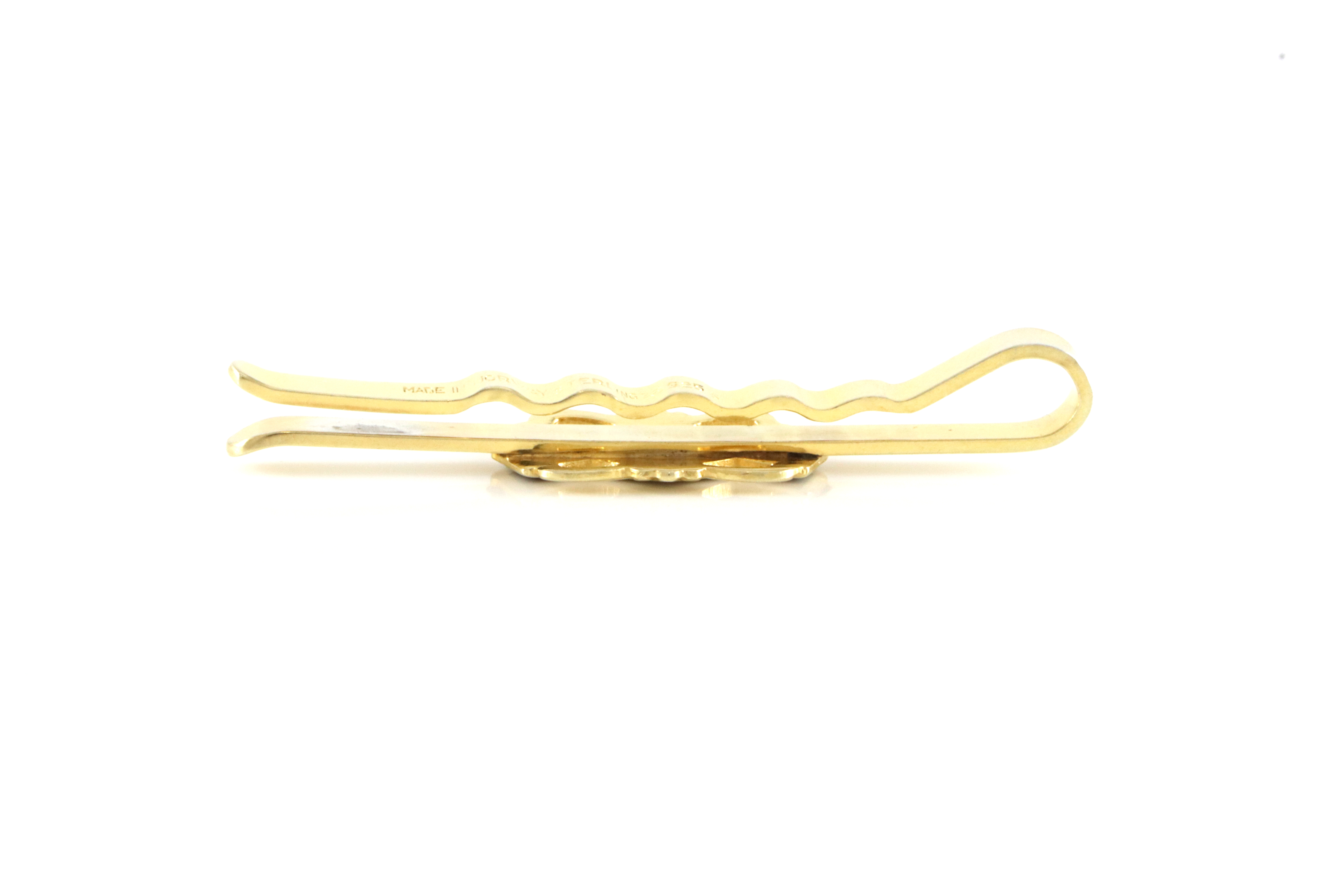 Slipsnål i forgylt sølv med grå og sort emalje. Produsert av Aksel Holmsen. 5,5 cm lang