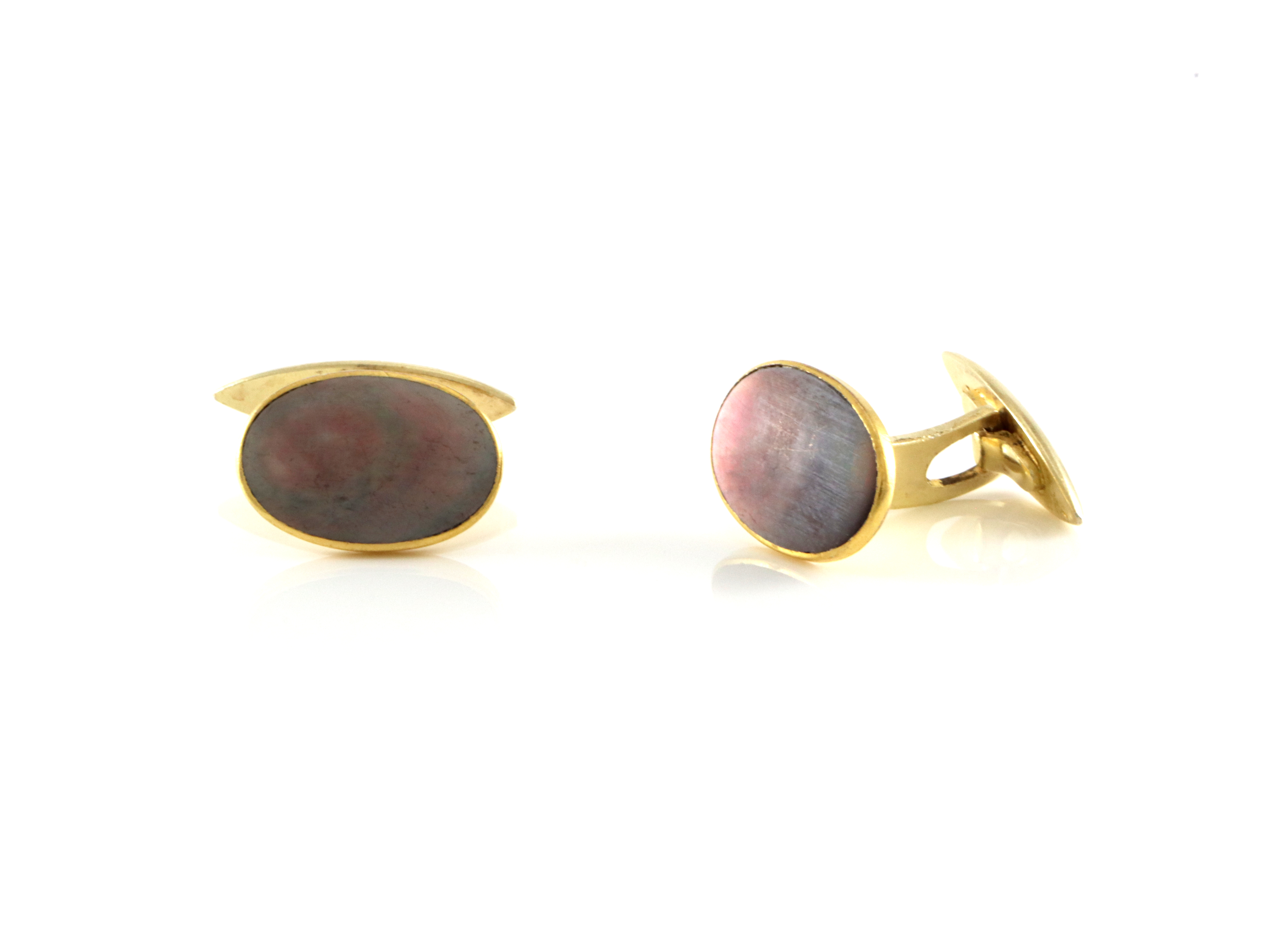 Mansjettknapper i forgylt sølv med perlemor(?) Ukjent produsent, bare sølvstempel. 1,5 x 1,1 cm