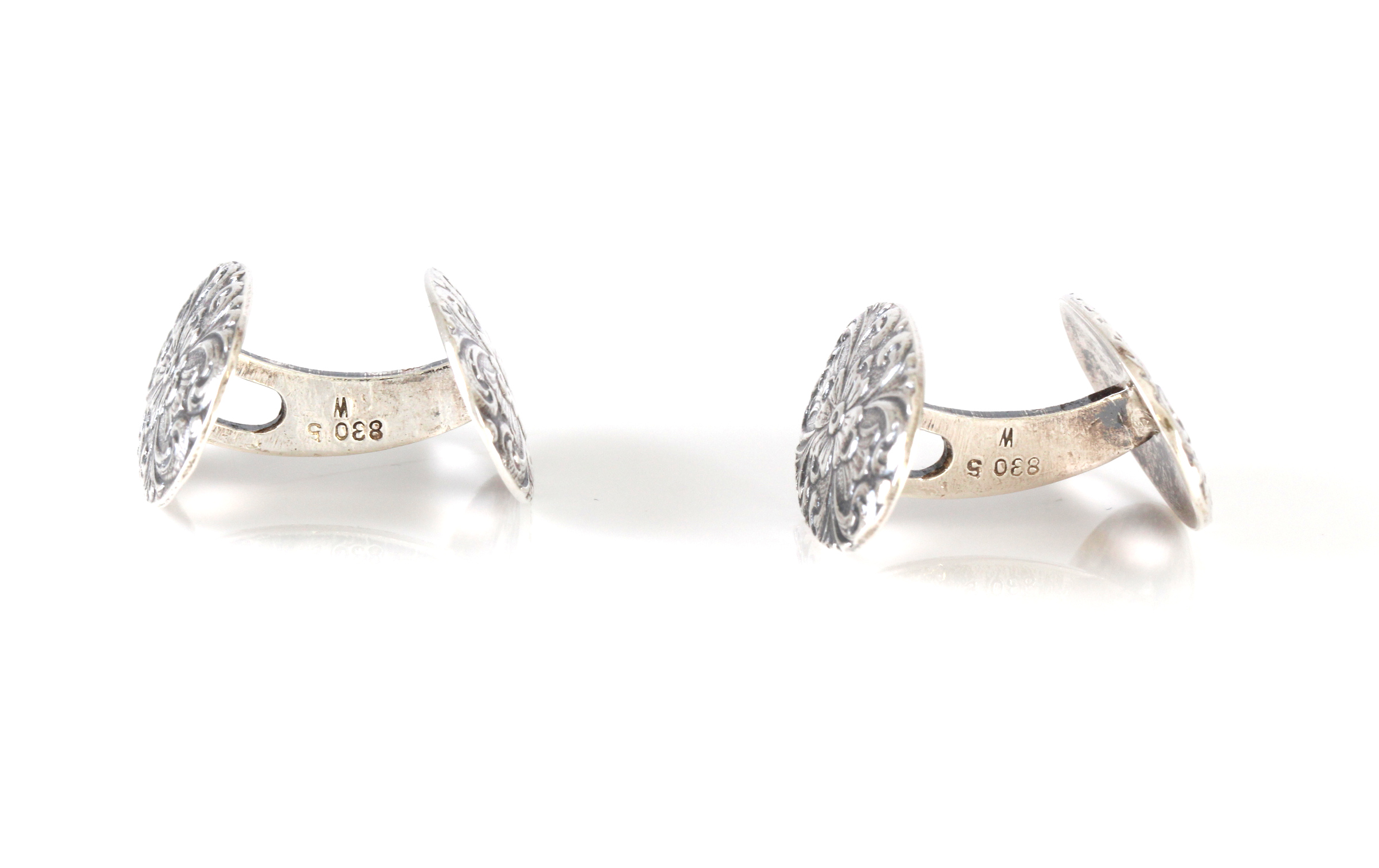 Mansjettknapper med blomstermotiv, ukjent mester. Platen er 2,1 x 1,3 cm