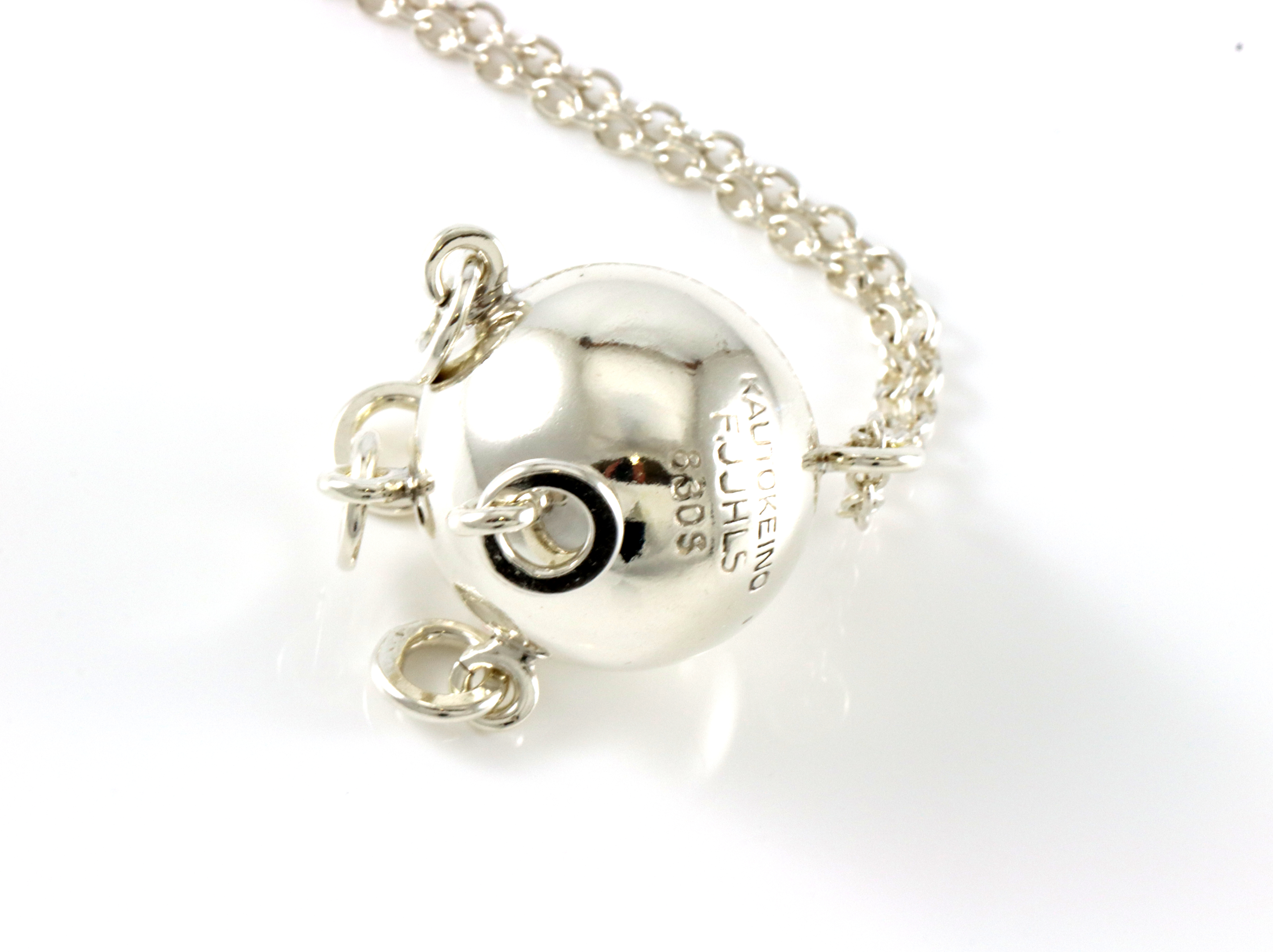 Komsekule i sølv, med 5 ringer. Ca 2,5 cm bred Kjede medfølger