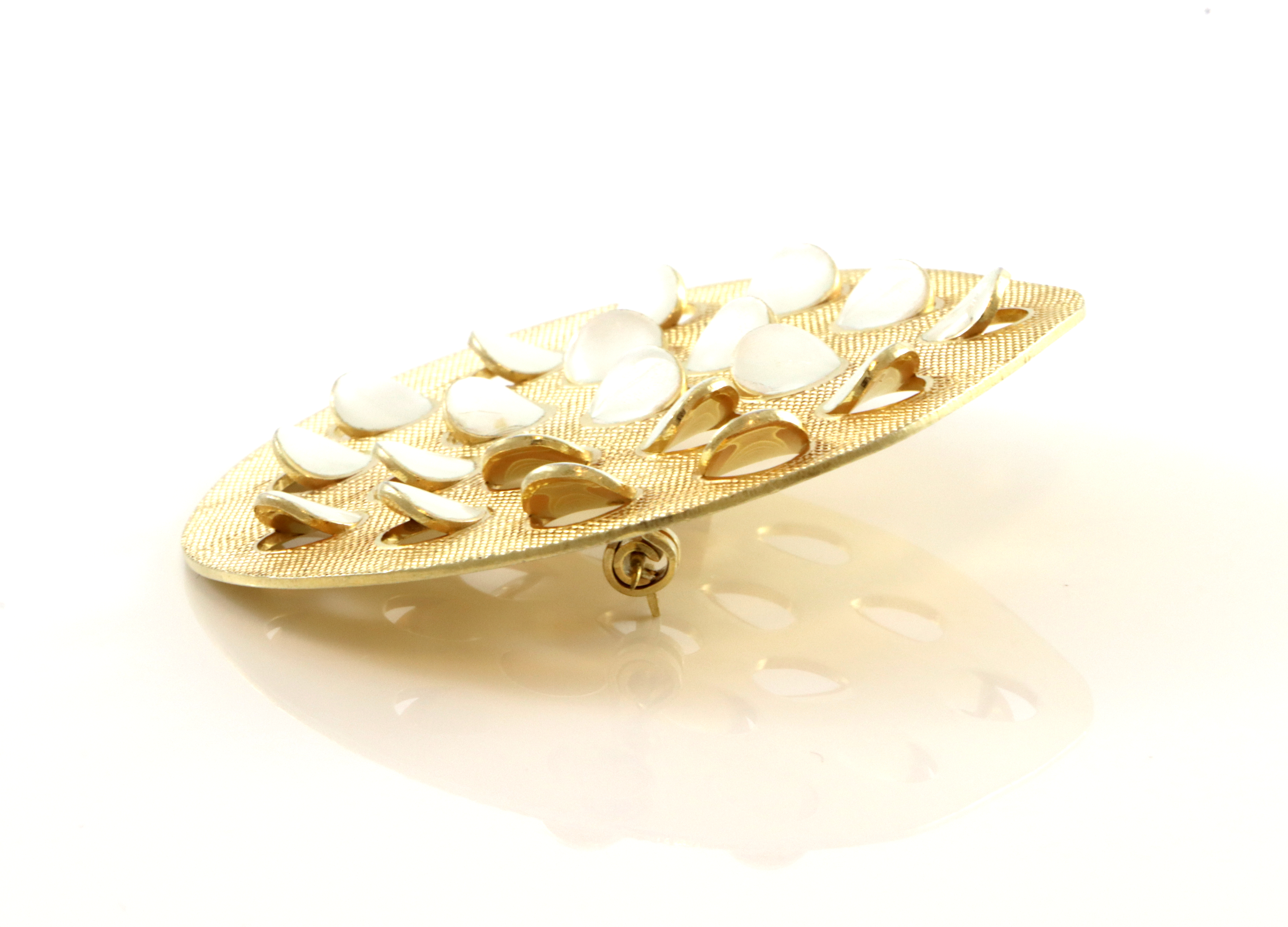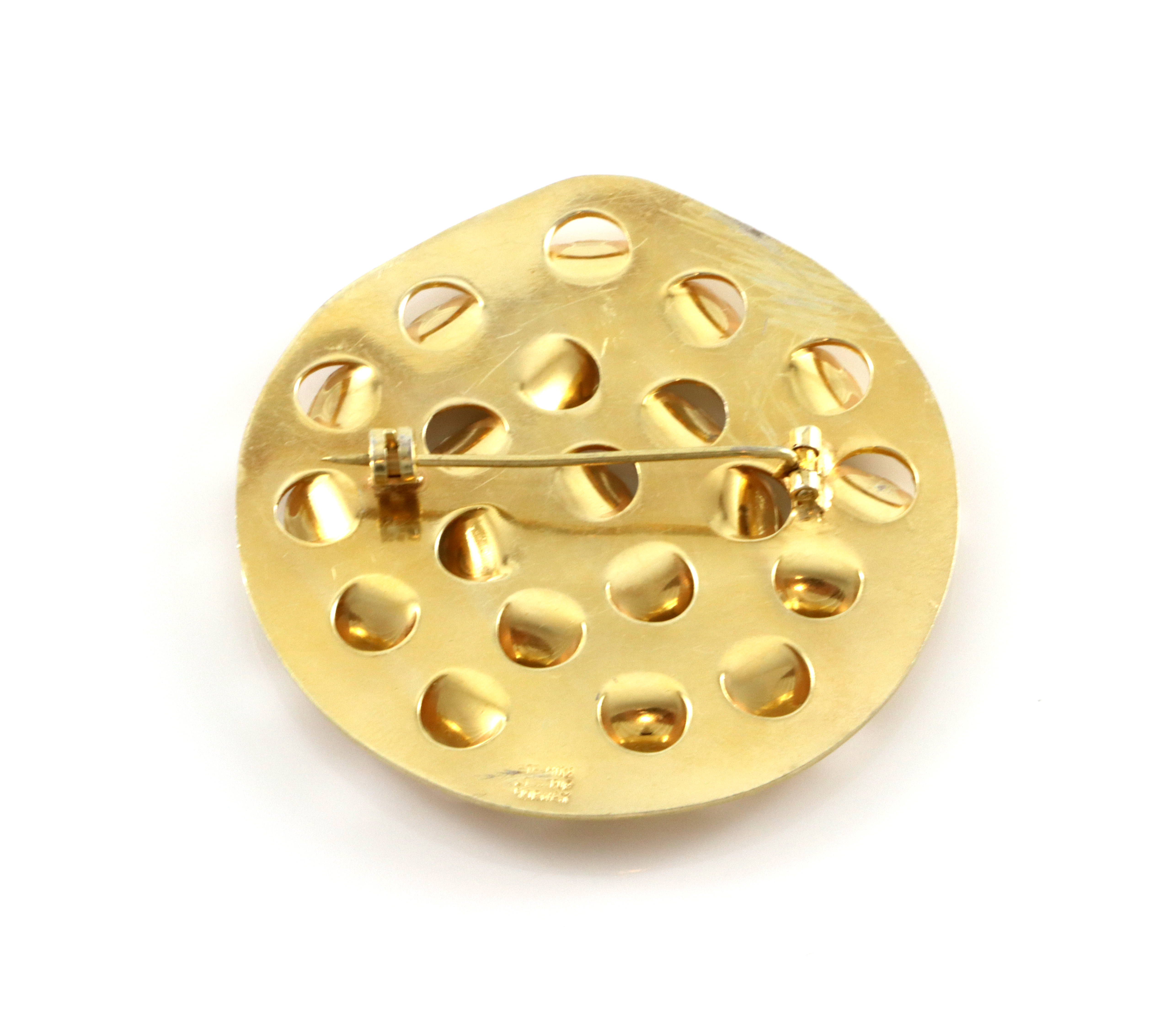 Mål: 60 x 57 mm Designer: Grete Prytz Kittelsen Produsent: J. Tostrup Tendens til noe ujevnt påført emalje Flott bevart forgylling