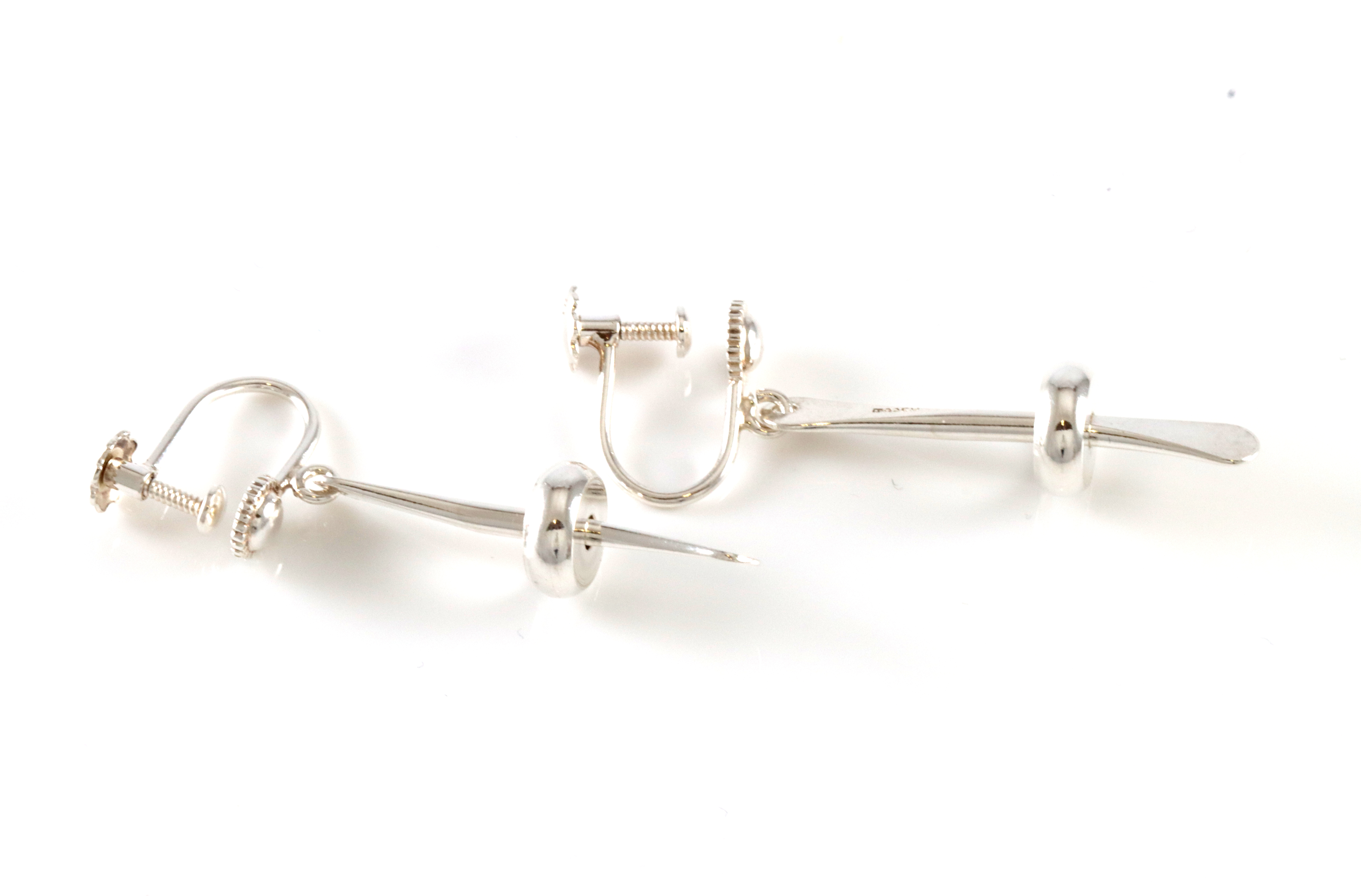 Ørepynt i sølv, med skru. Kan enkelt byttes om til stikk. Fra Gine sin produksjon for Tostrup. Arkivbilde
